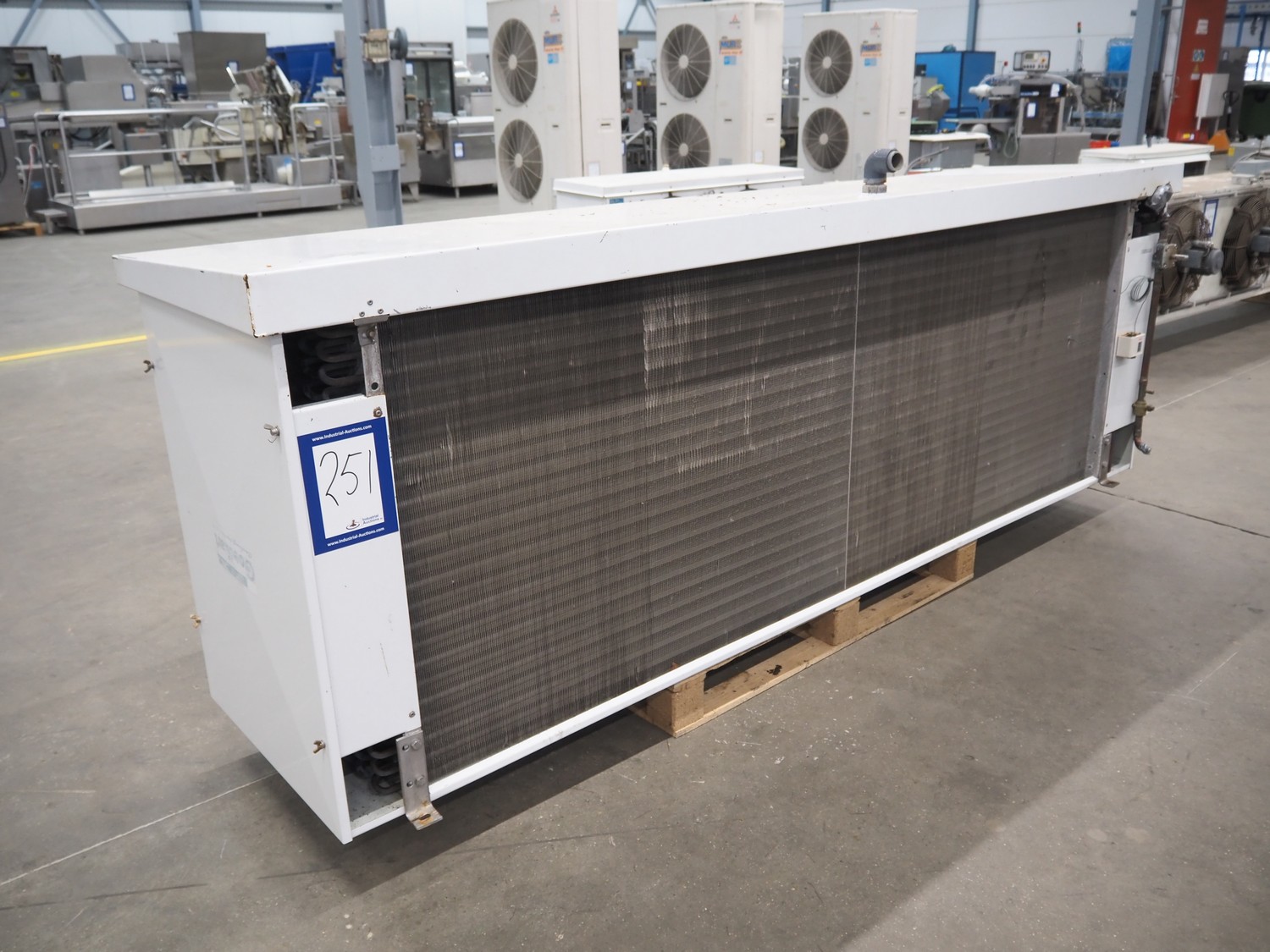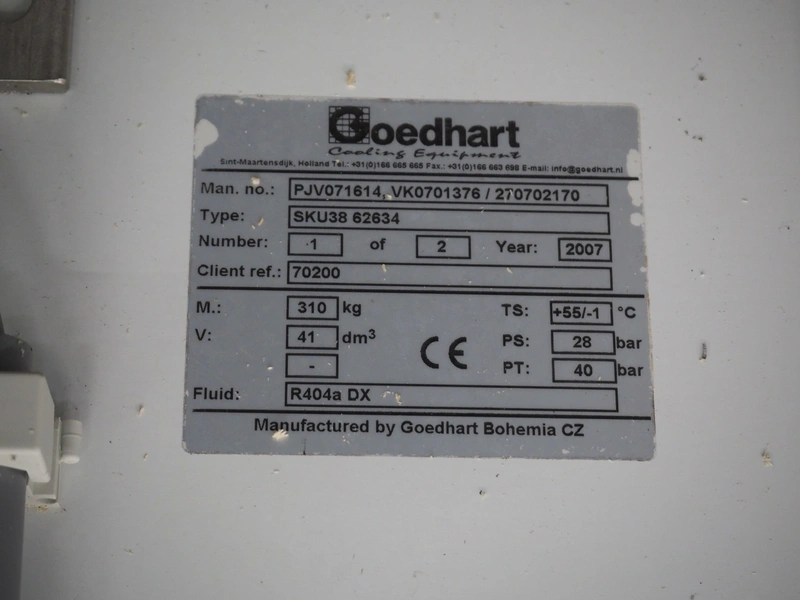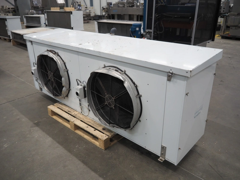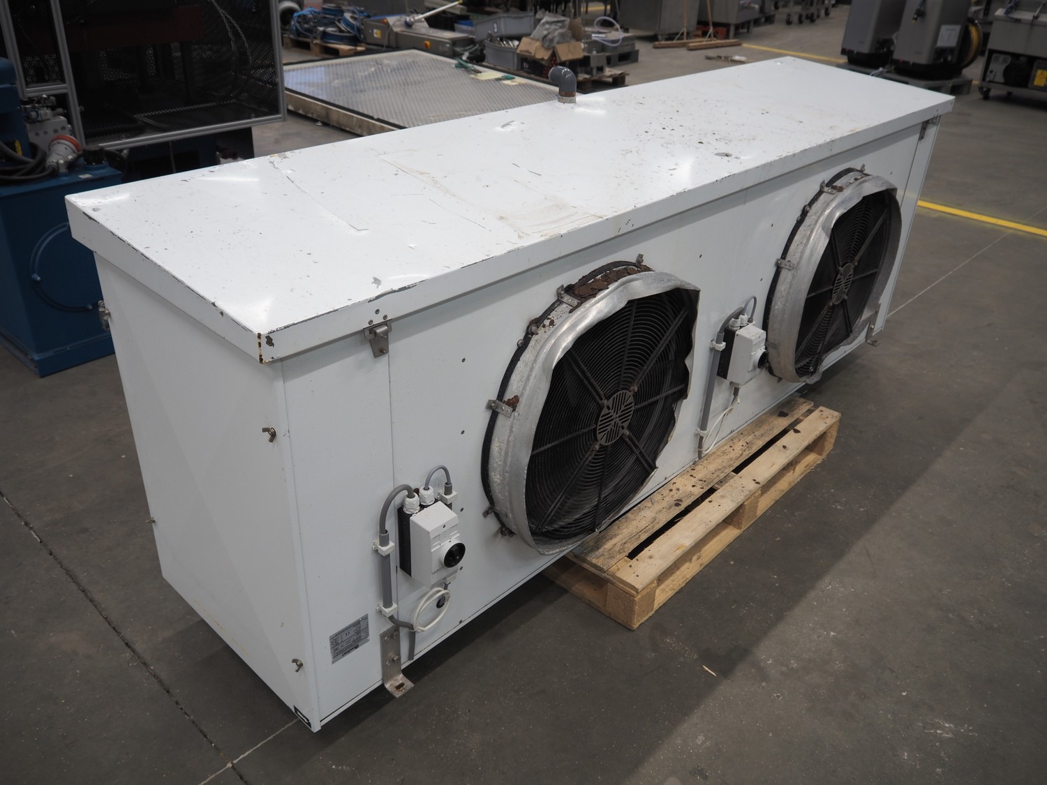 Goedhart evaporator, 2 fans, type: SKU38 62634, manufacturing number: PJV071614. VK0701376/270702170, year of construction: 2007, fluid: R404a, maximum work pressure: 28 bar, working temperature: +55/-1⁰C, volume: 41 dm³, dimensions: 2860 mm x 780 mm x 1250 mm.