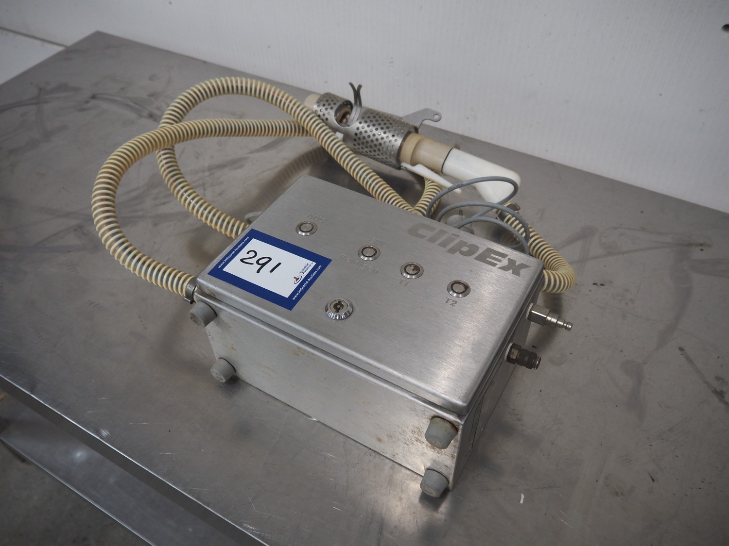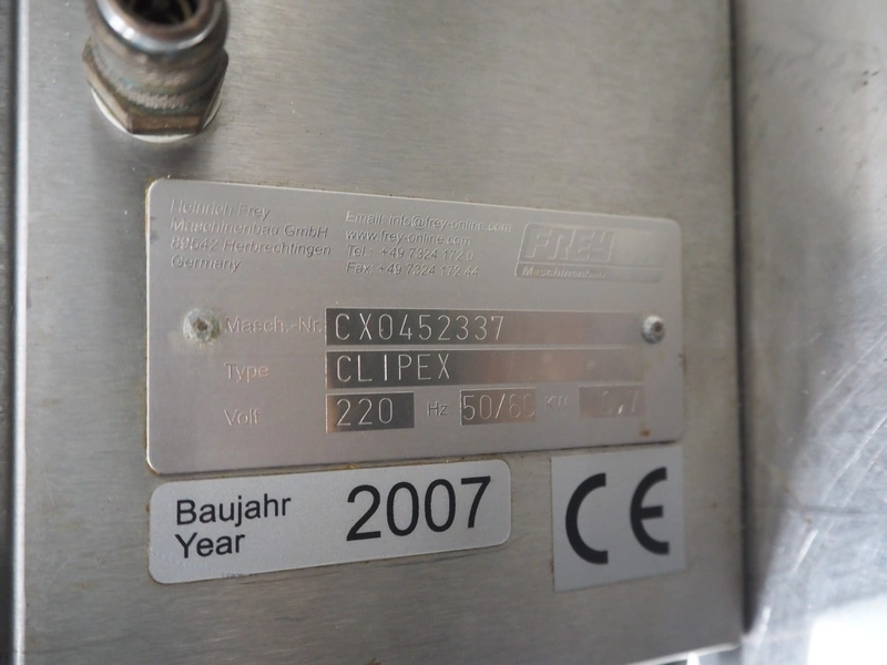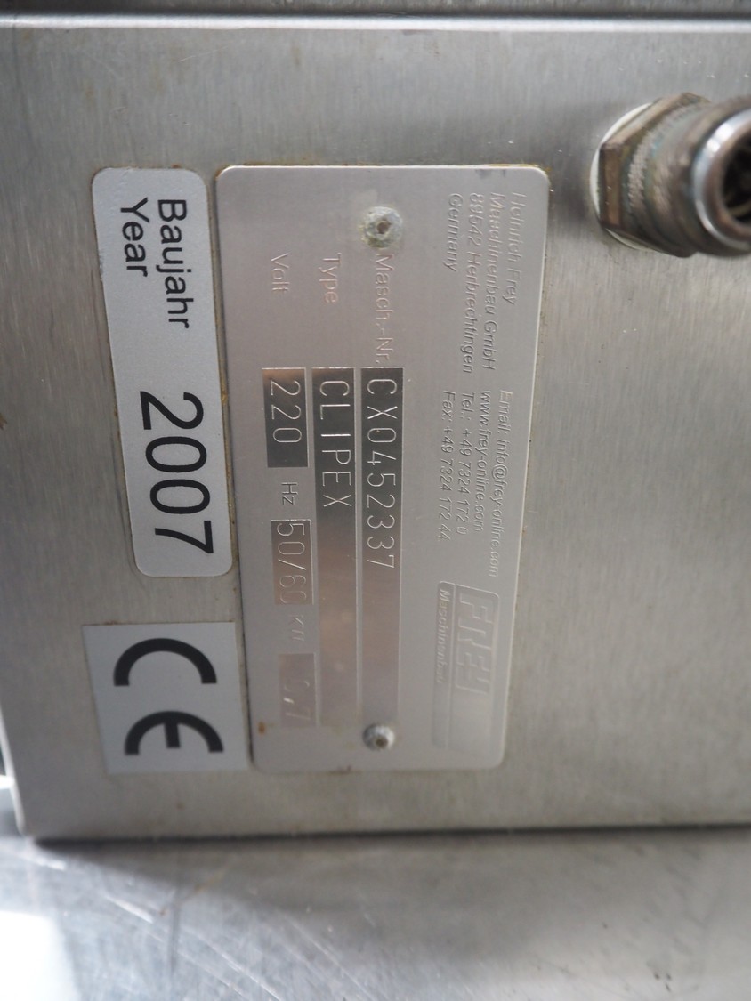 Frey Maschinenbau casing sealer, type: CLIPEX, machine number: CX 0452337, year of construction: 2007, 220 V, 50/60 Hz, 0.7 kW, dimensions: 370 mm x 300 mm x 150 mm