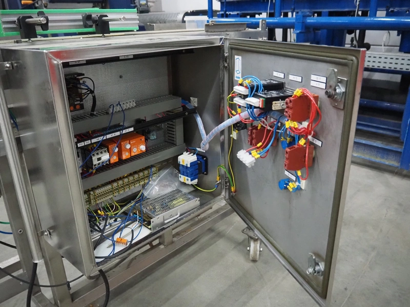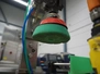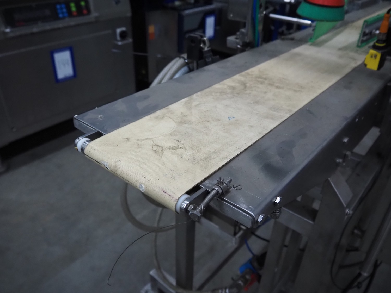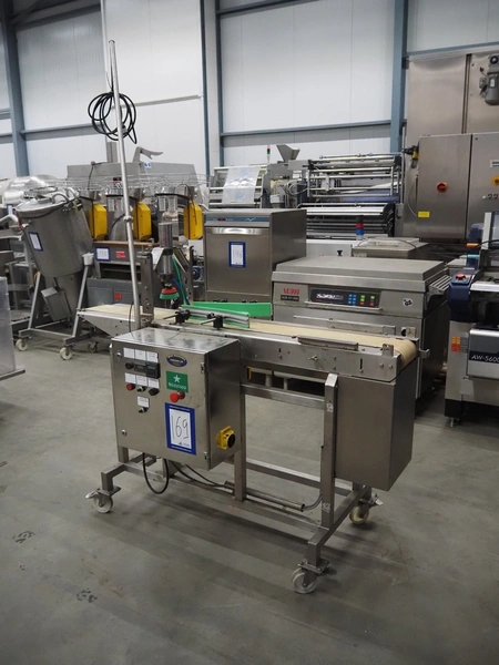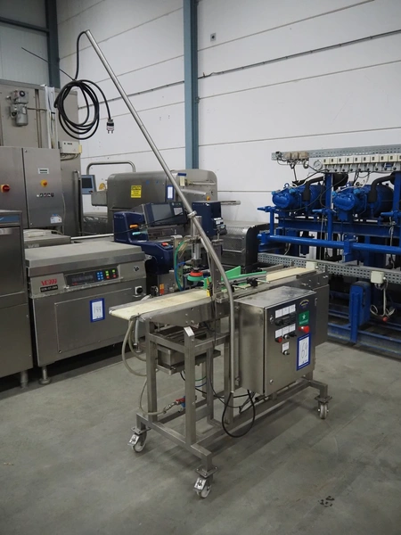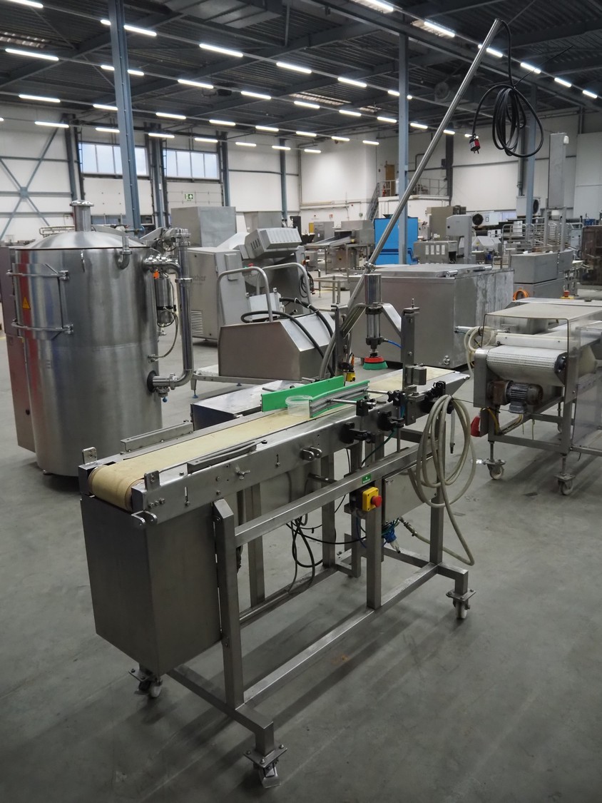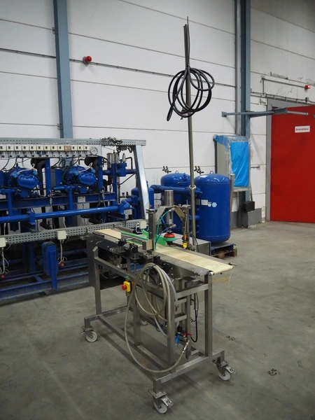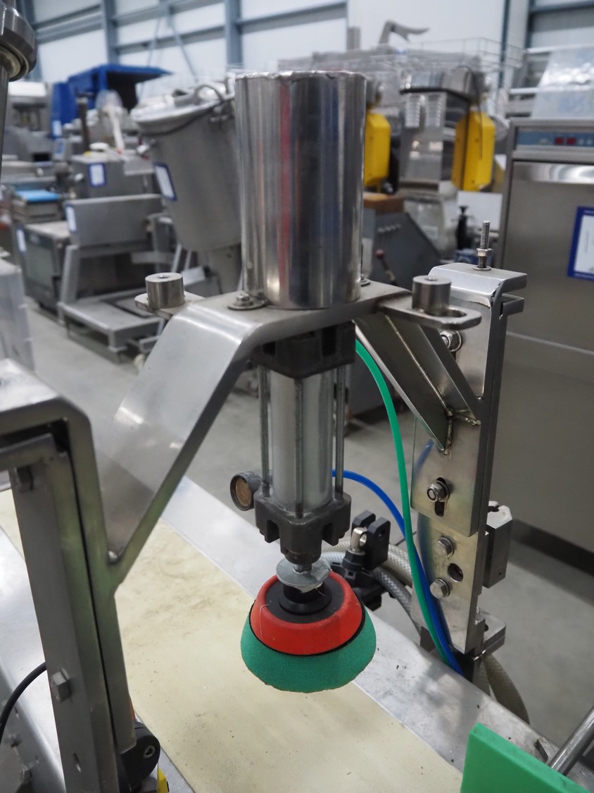 Mobile lid closing machine, s/s frame, plastic belt, belt width: 150 mm, diameter press: 90 mm, total dimensions: 1750 mm x 700 mm x 1400 mm.