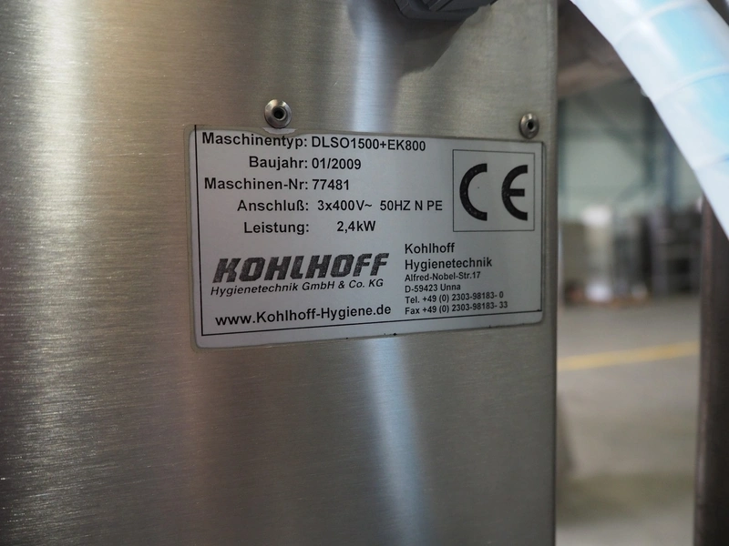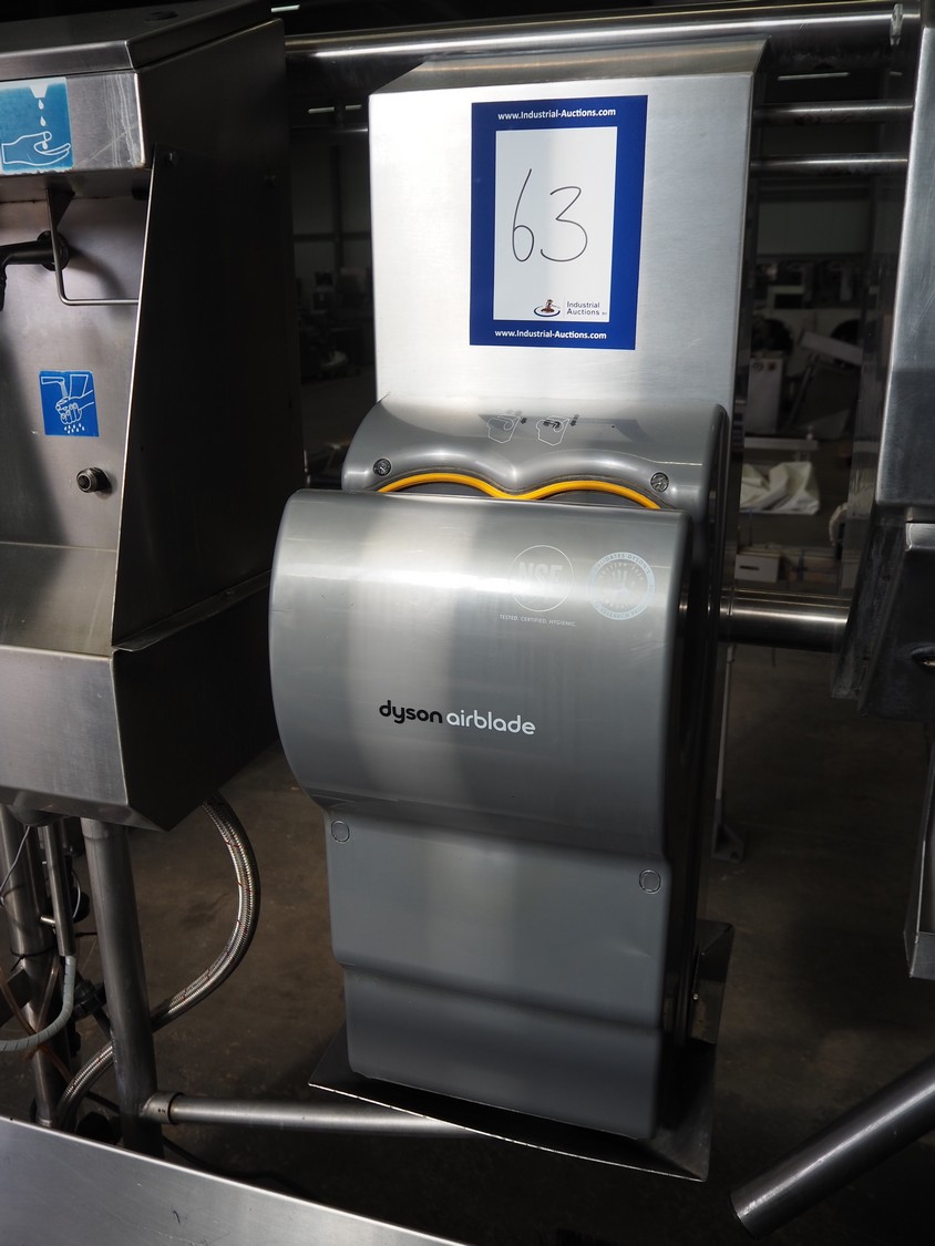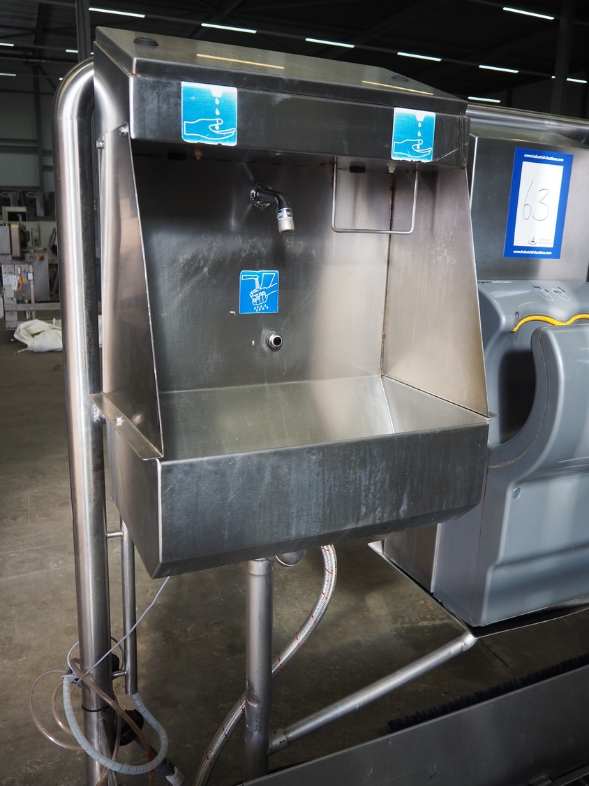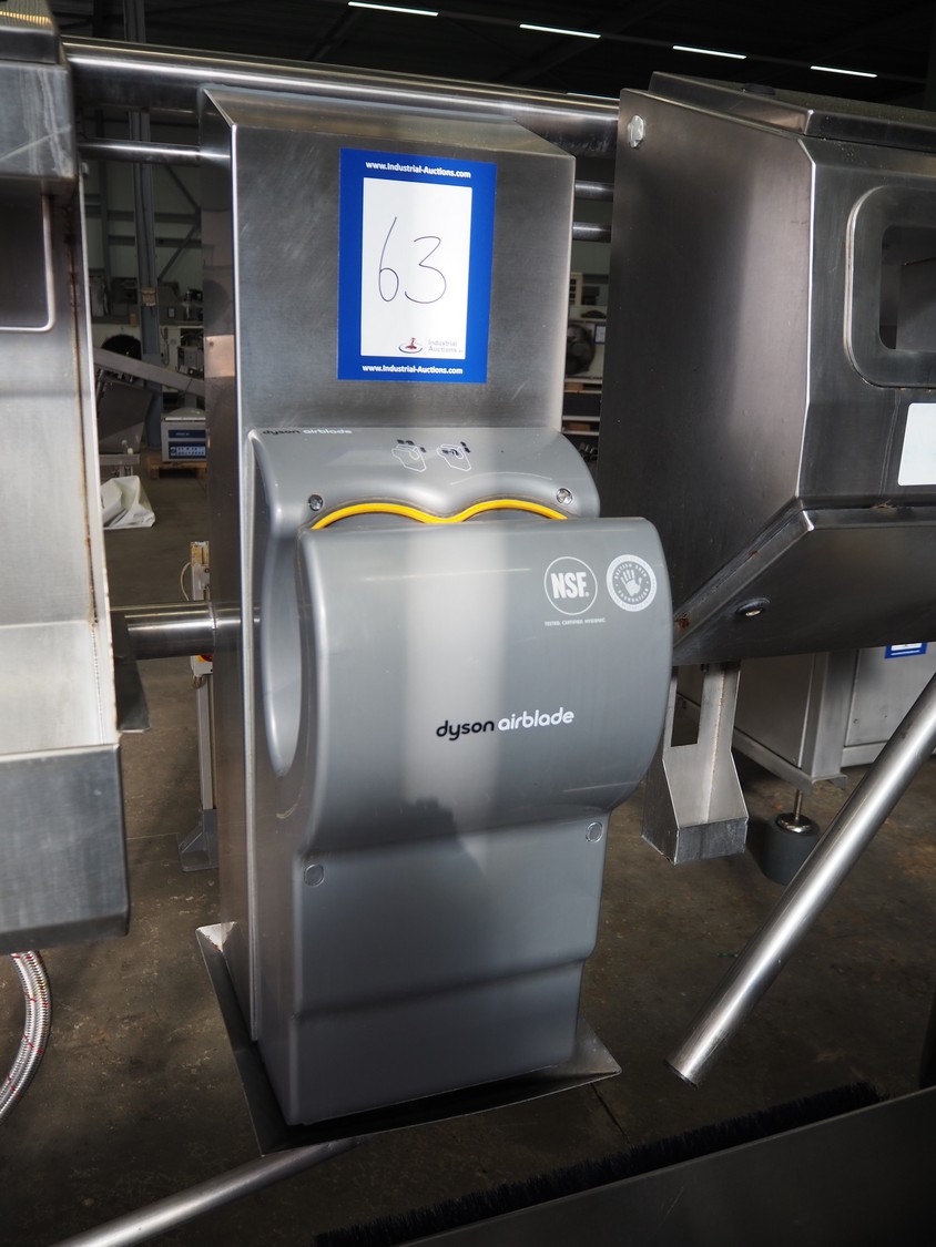 Kohlhoff hygiene station with sole cleaner, hand disinfection, Dyson hand dryer and tourniquet, type: DLS1500+EK800, machine number: 77481, year of construction: 01/2009, 400 V, 3 Ph, 50 Hz, 2.4 kW, brush length: 1100 mm, dimensions: 2200 mm x 1100 mm x 1800 mm. Including 2 extra brushes.