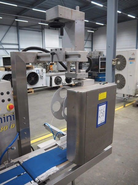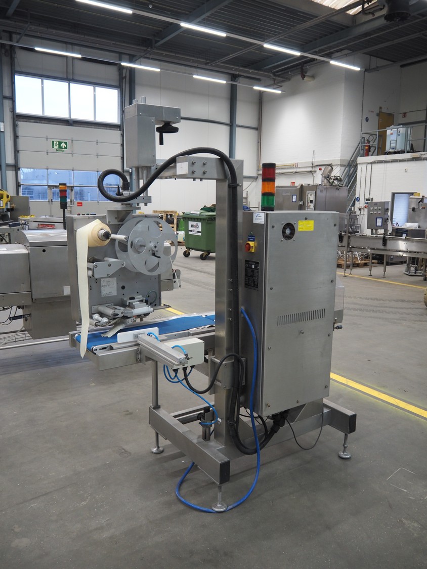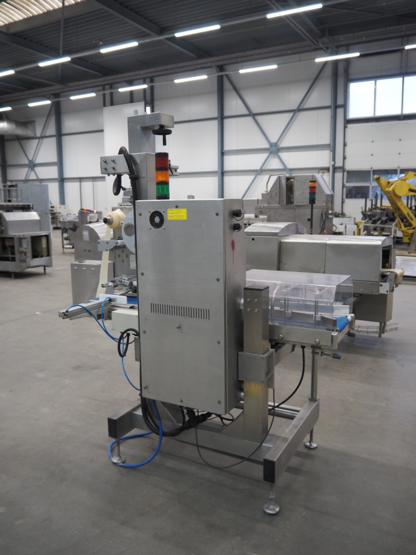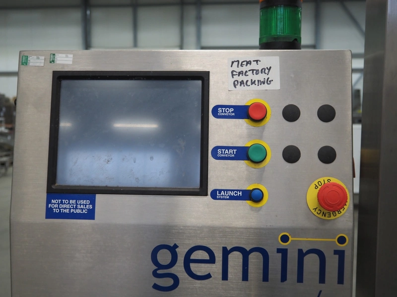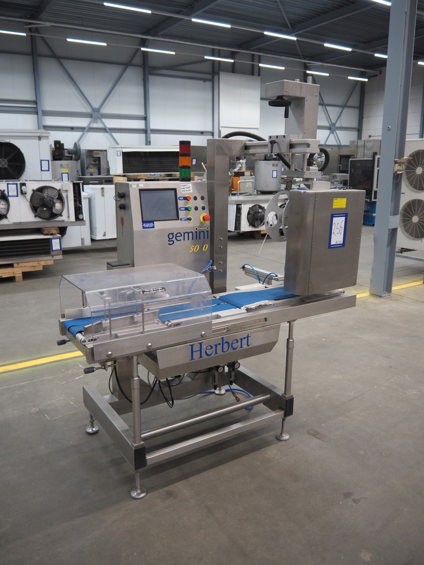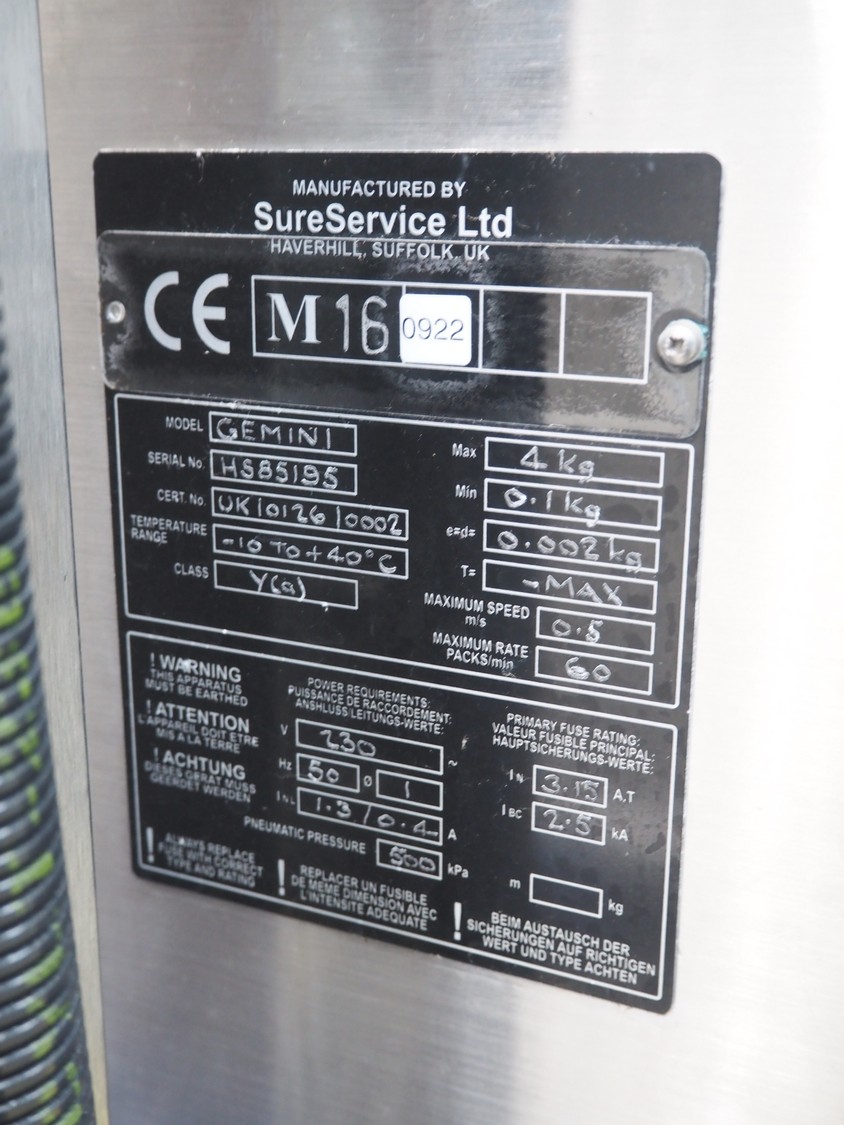 SureService Ltd weighing and labelling machine, model: GEMINI, serial number: HS85195, 230 V, 1 Ph, 50 Hz, 1.3/0.4 A, maximum weight: 4 kg, minimum weight: 0.1 kg, e=d= 0.002 kg, 60 packs per minute, plastic belt, belt width: 230 mm and (2x) 100 mm, total dimensions: 1700 mm x 800 mm x 2100 mm.
