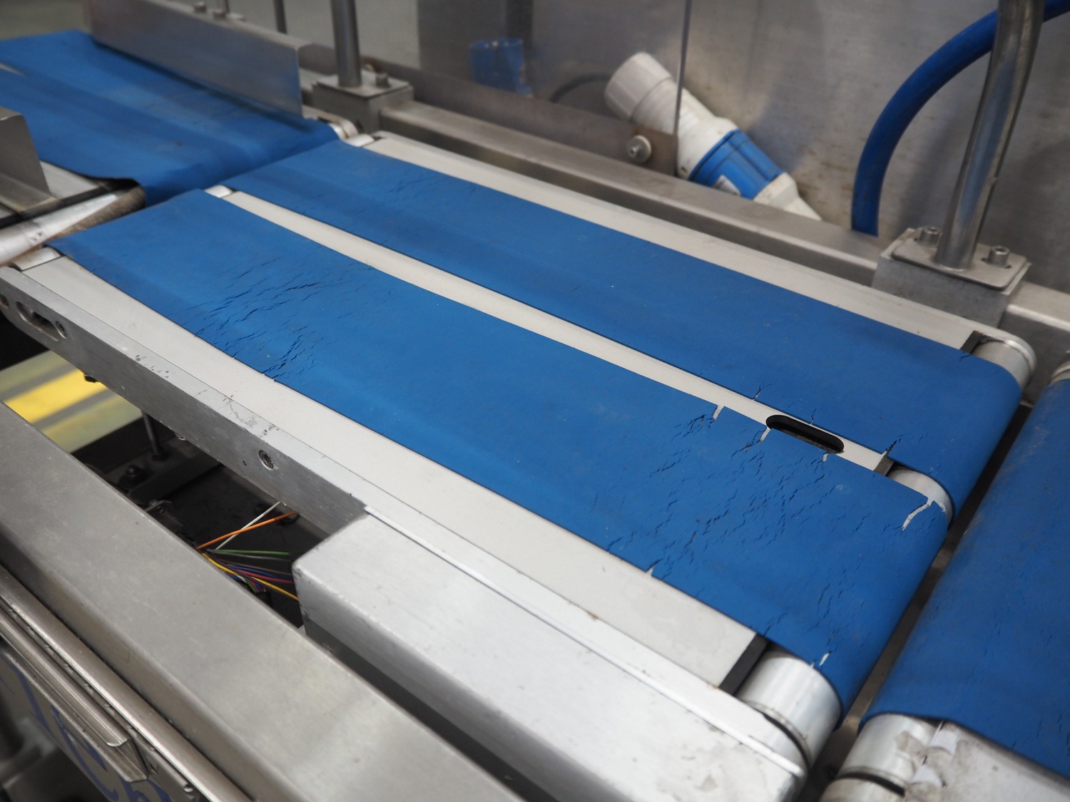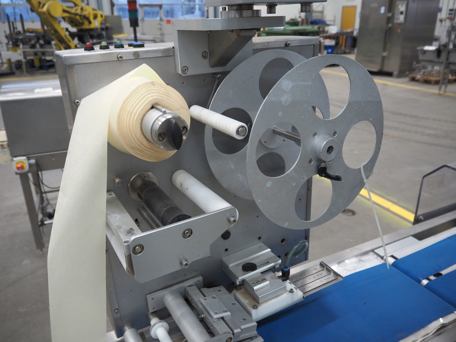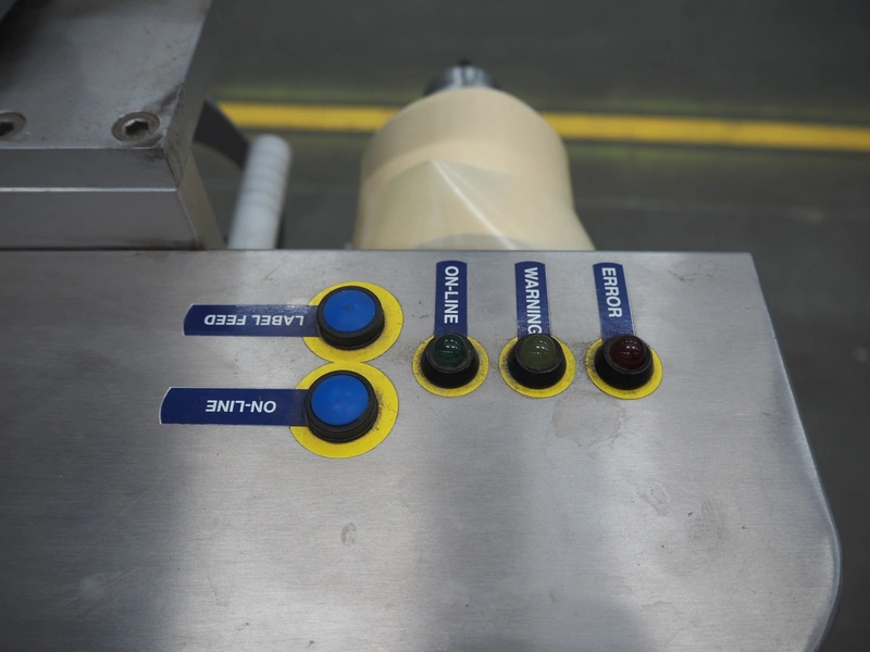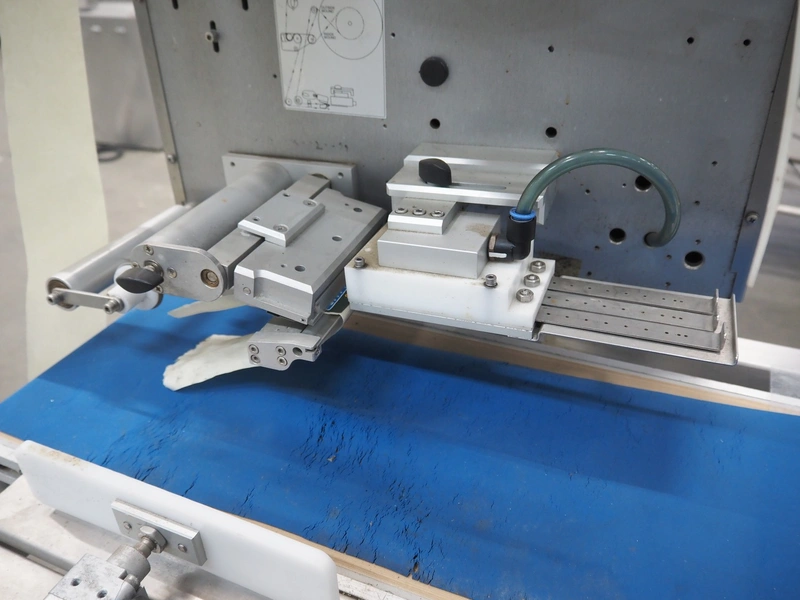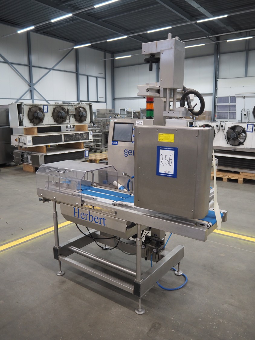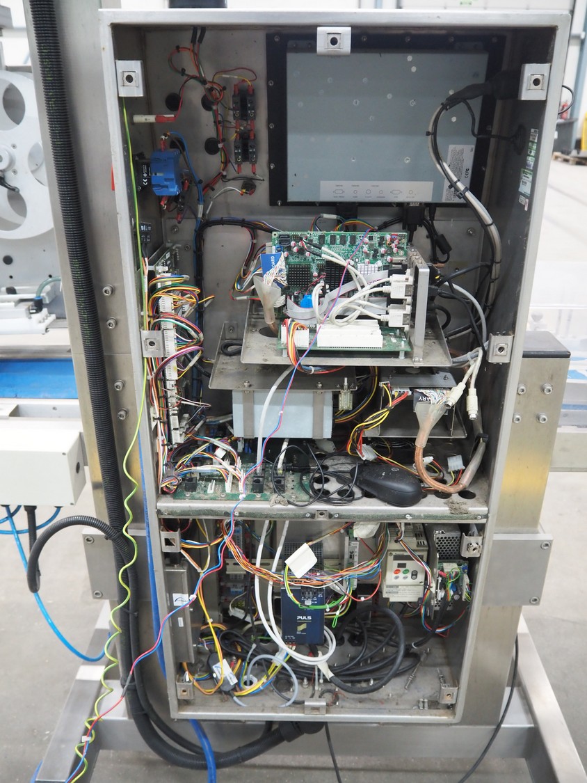 SureService Ltd weighing and labelling machine, model: GEMINI, serial number: HS85195, 230 V, 1 Ph, 50 Hz, 1.3/0.4 A, maximum weight: 4 kg, minimum weight: 0.1 kg, e=d= 0.002 kg, 60 packs per minute, plastic belt, belt width: 230 mm and (2x) 100 mm, total dimensions: 1700 mm x 800 mm x 2100 mm.