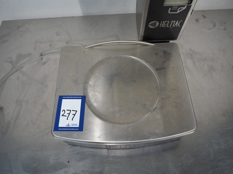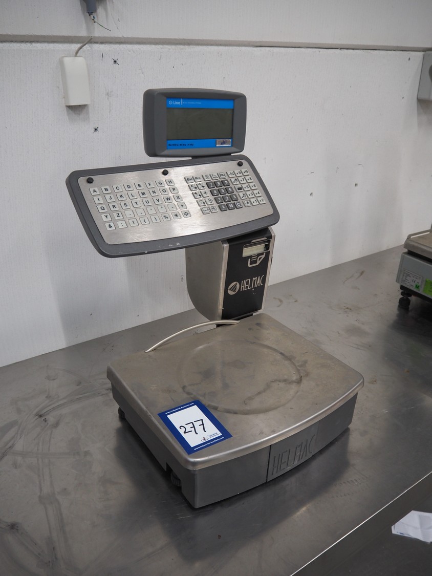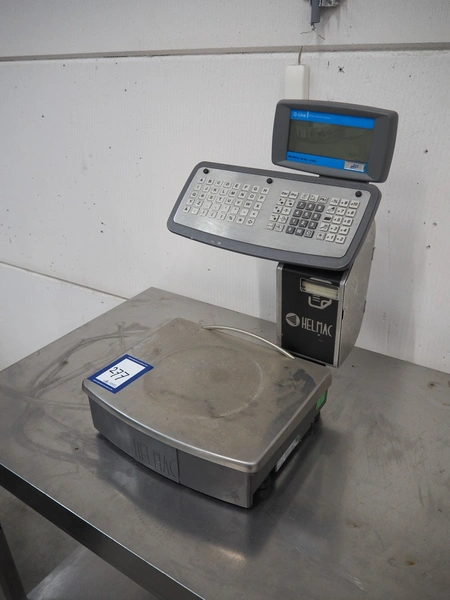 Helmac Srl weighing scale with label printer, model: GP1 AP, serial number: 0232906342, 220/250 V, maximum weight: 12/30 kg, minimum weight: 0.04 kg, e= 2/5 kg, T= -12 kg, Lim: 54 kg, dimensions: 440 mm x 370 mm x 560 mm.
