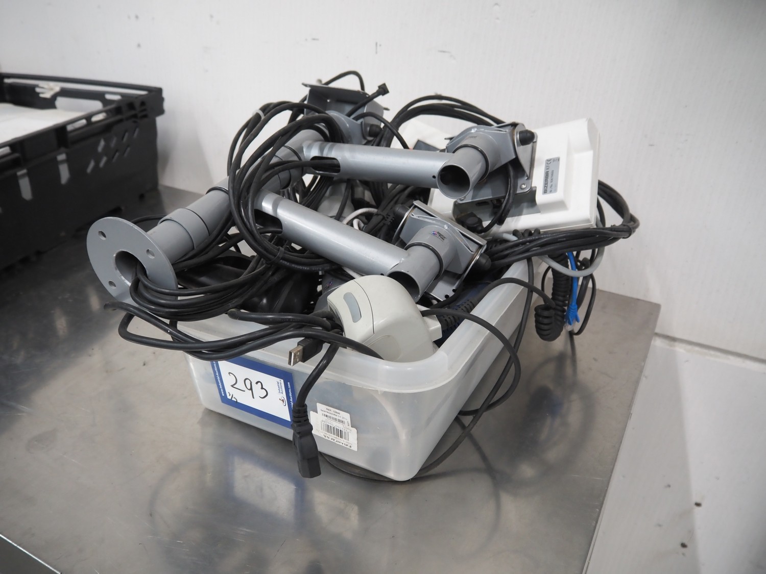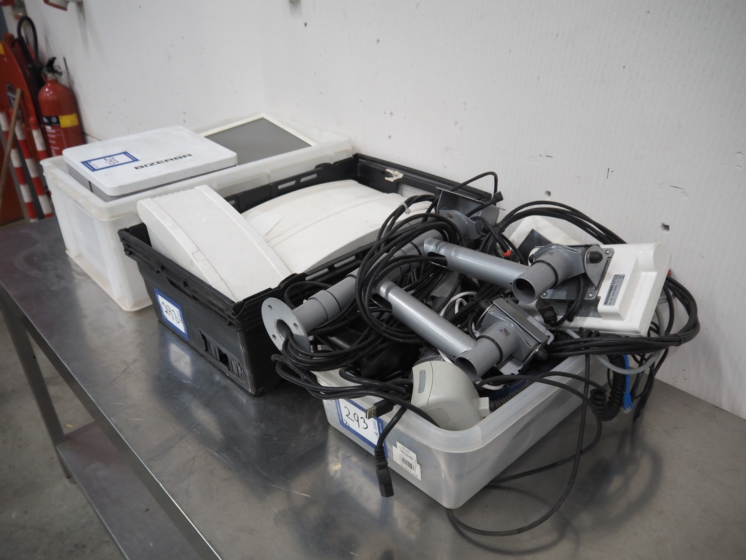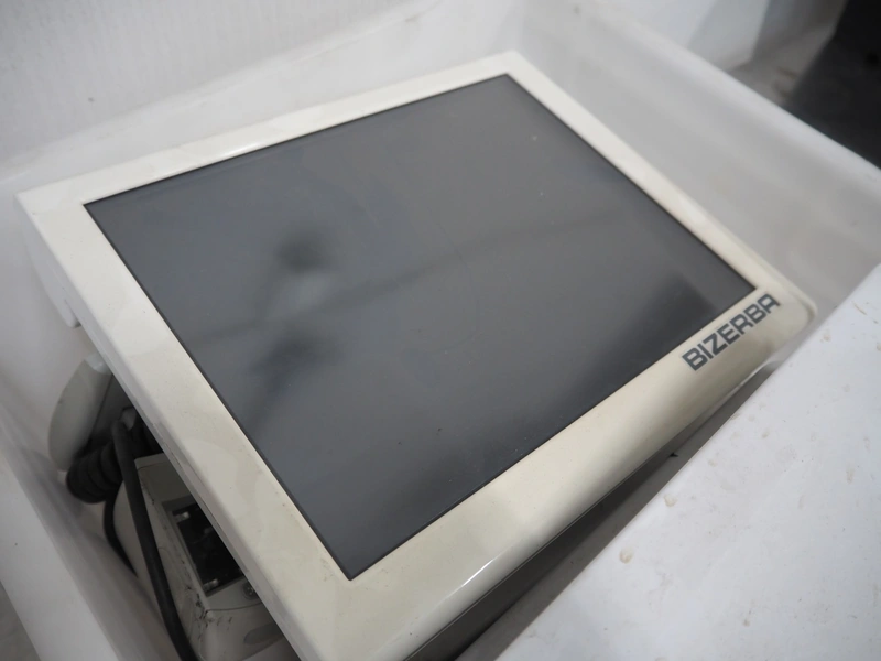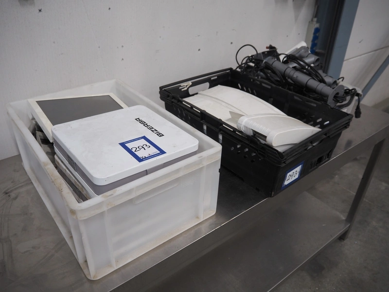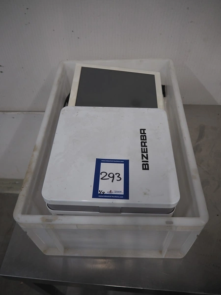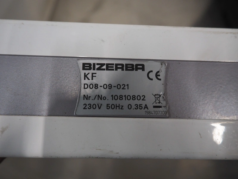 3 sets of Bizerba weighing scales with indicator and label printer, model scale: KF D08-09-021, serial number: 10810802, 230 V, 50 Hz, 0.35 A, scale dimensions: 280 mm x 280 mm.