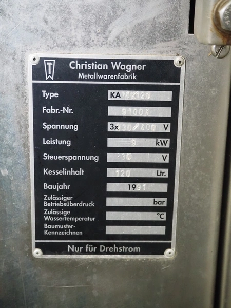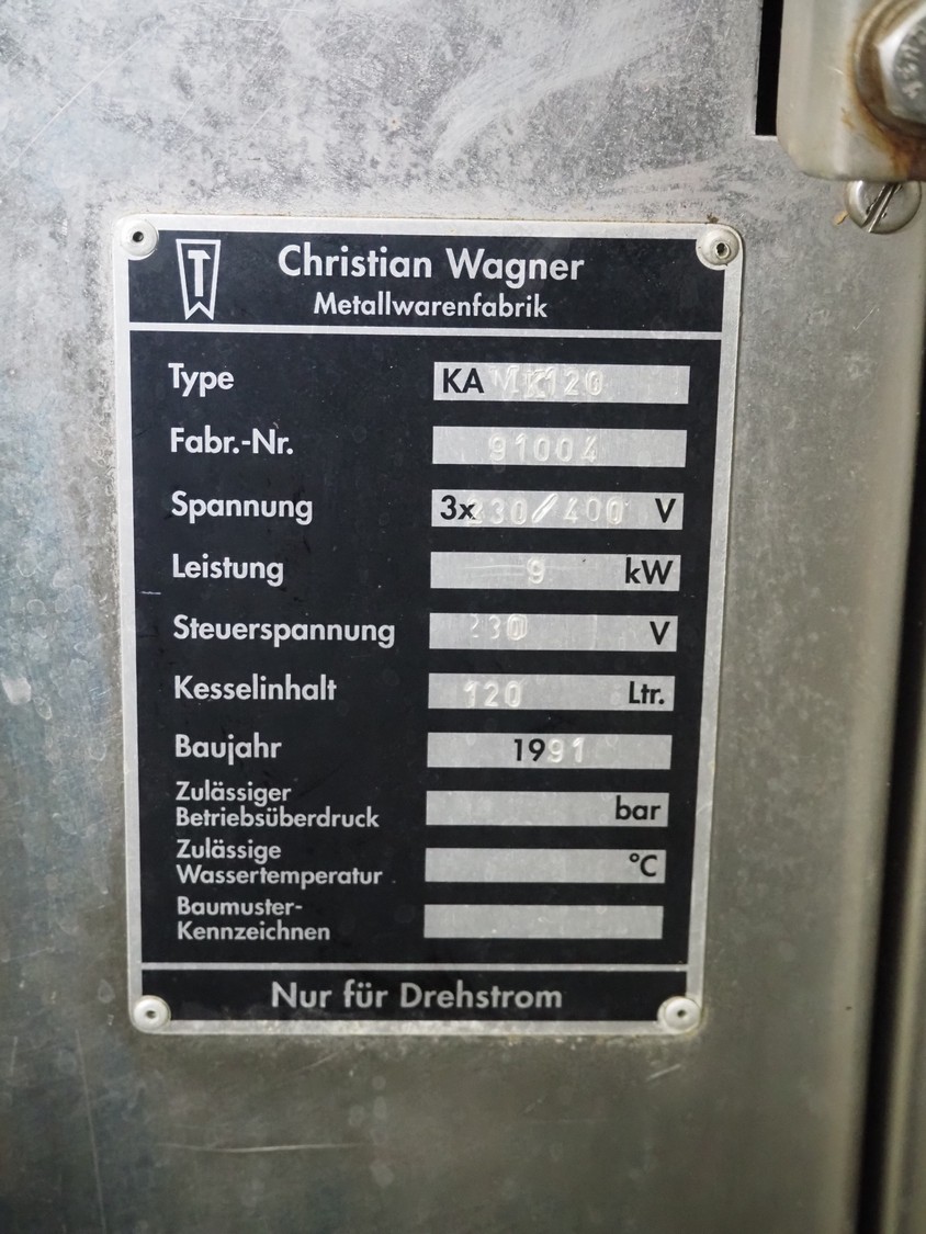 Christian Wagner mobile autoclave, type: KA MK120, number: 91004, year of construction: 1991, 400 V, 3 Ph, 30 A, 9 kW, volume: 120L, inside dimensions: Ø 500 mm x 550 mm, total dimensions: 900 mm x 700 mm x 1200 mm.