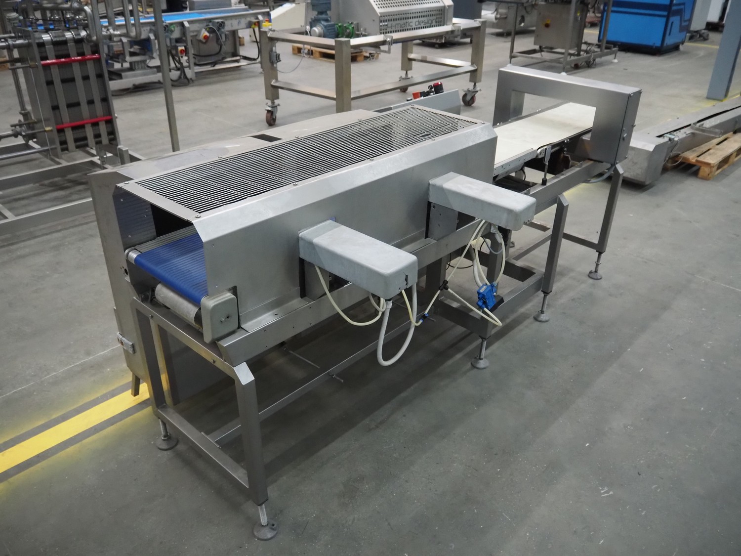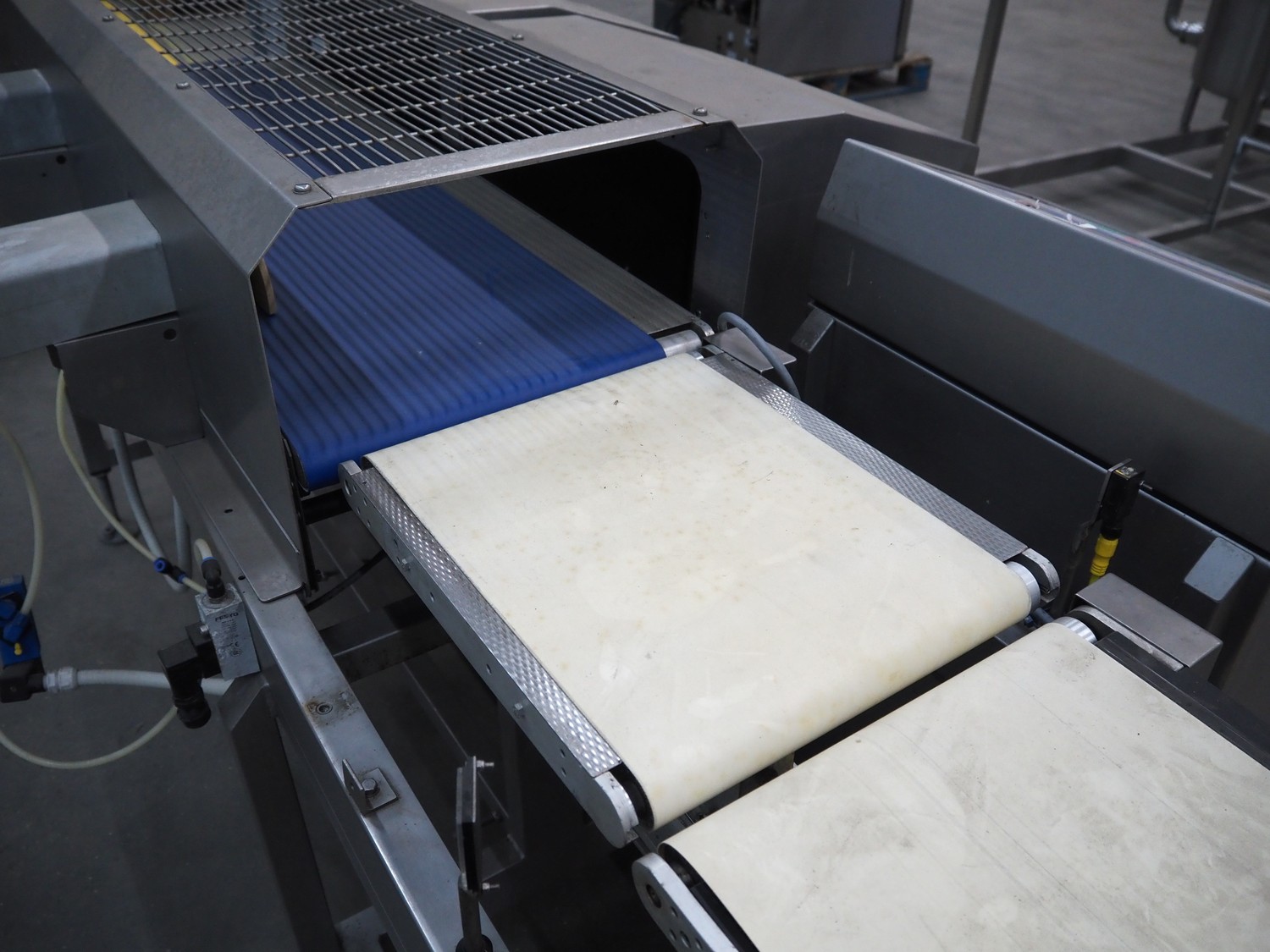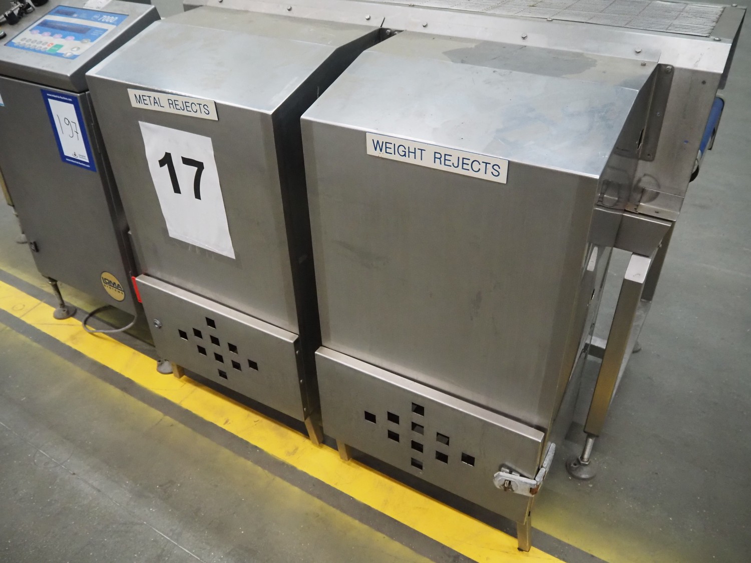 Loma systems checkweigher with metal detector and double rejector, serial number: 71A001, 240 V, 1 Ph, 50 Hz, plastic belt, belt width: 300 mm, clearance: 450 mm x 130 mm, total dimensions: 2750 mm x 1000 mm x 1050 mm.