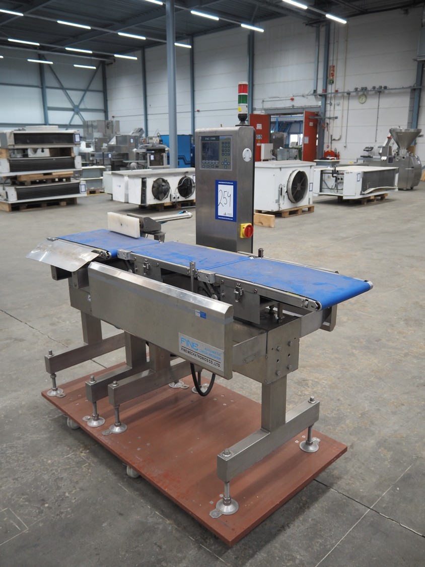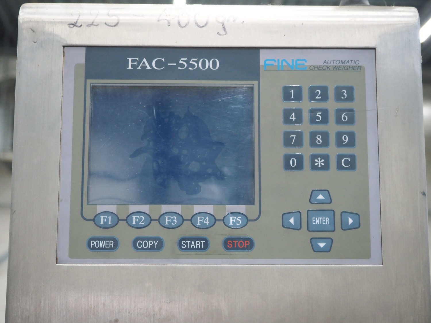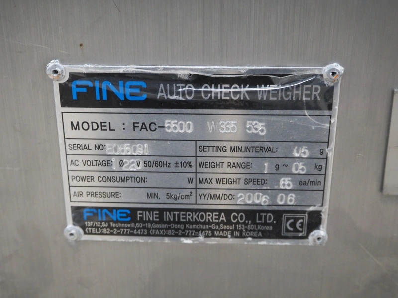 Fine Interkorea checkweigher with rejecter, model: FAC-5500 W335 535, serial number: E065031, year of construction: 2006/06, weight range: 1-500 gram, plastic belt, belt width: 300 mm, total dimensions: 1670 mm x 900 mm x 1630 mm.