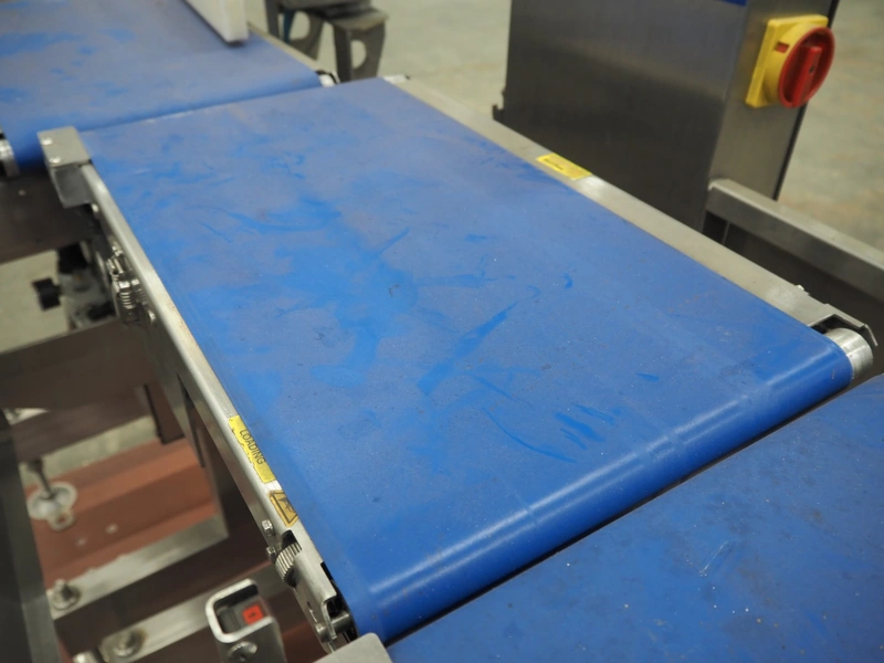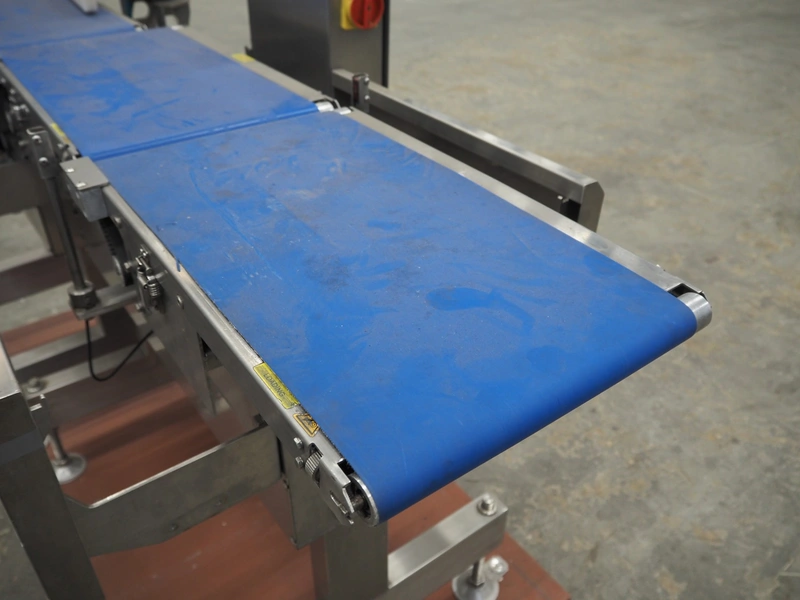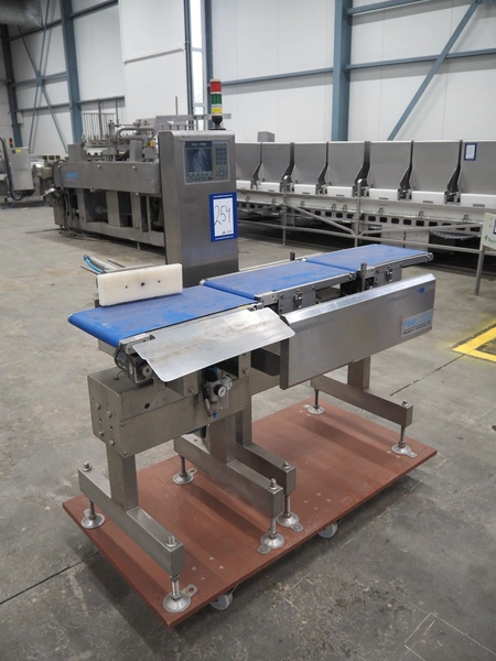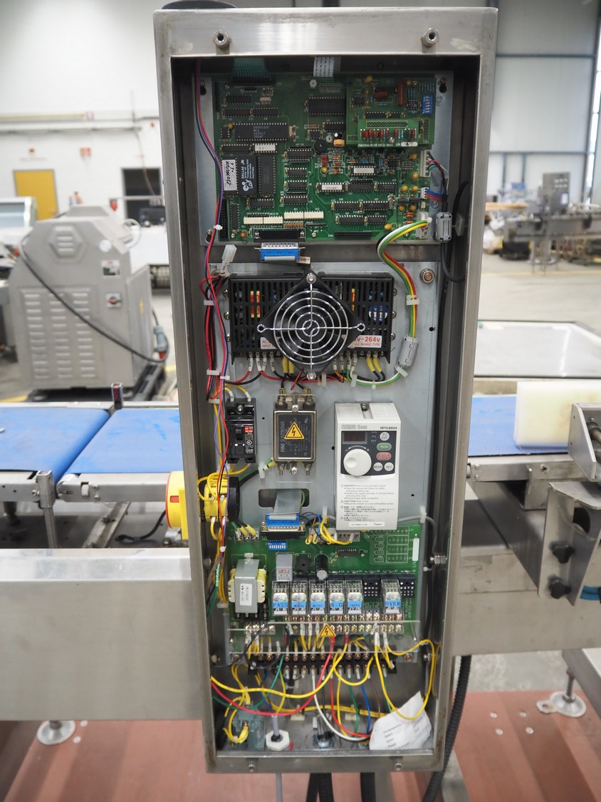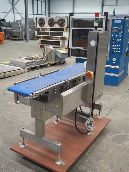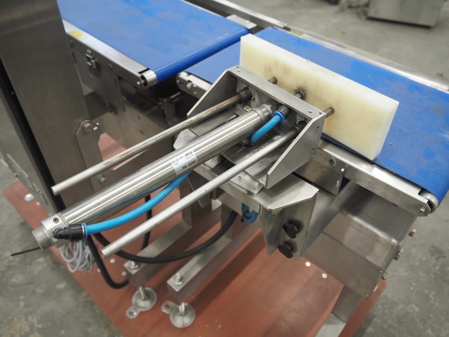 Fine Interkorea checkweigher with rejecter, model: FAC-5500 W335 535, serial number: E065031, year of construction: 2006/06, weight range: 1-500 gram, plastic belt, belt width: 300 mm, total dimensions: 1670 mm x 900 mm x 1630 mm.