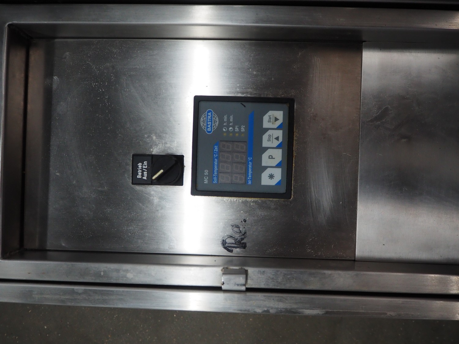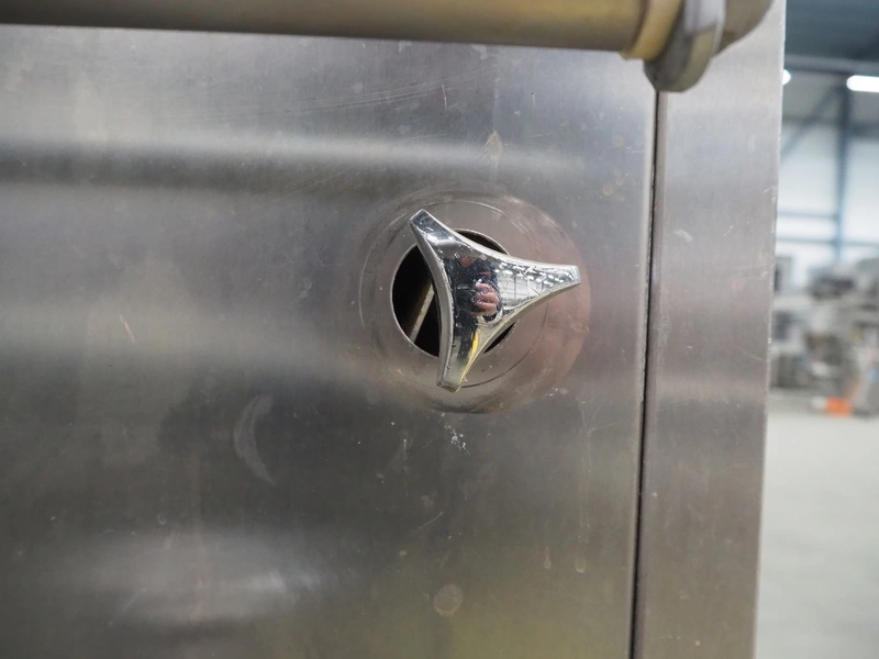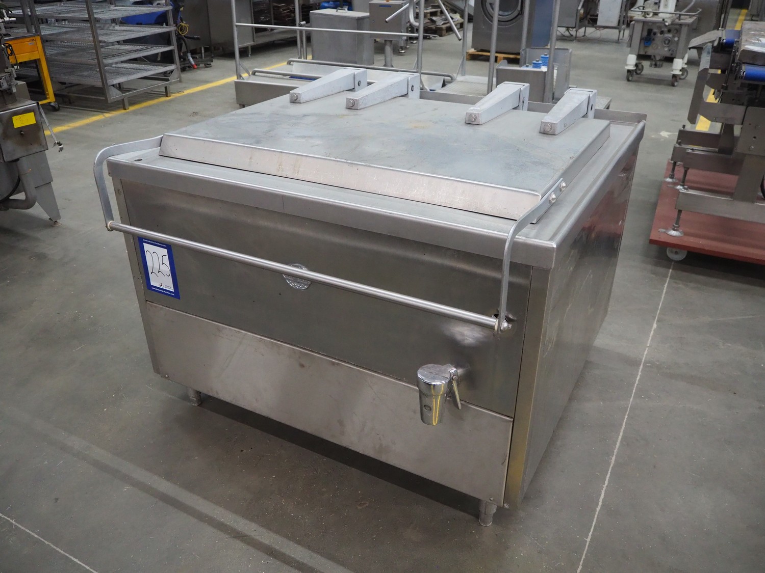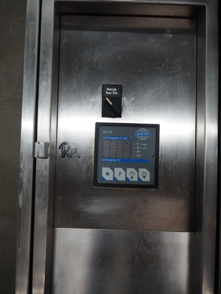Bastra cooking vessel, gas heated, dimensions inside: 1150 mm x 800 mm x 400 mm, total dimensions: 1360 mm x 1330 mm x 1060 mm. Including switch cabinet, dimensions: 700 mm x 300 mm x 340 mm.