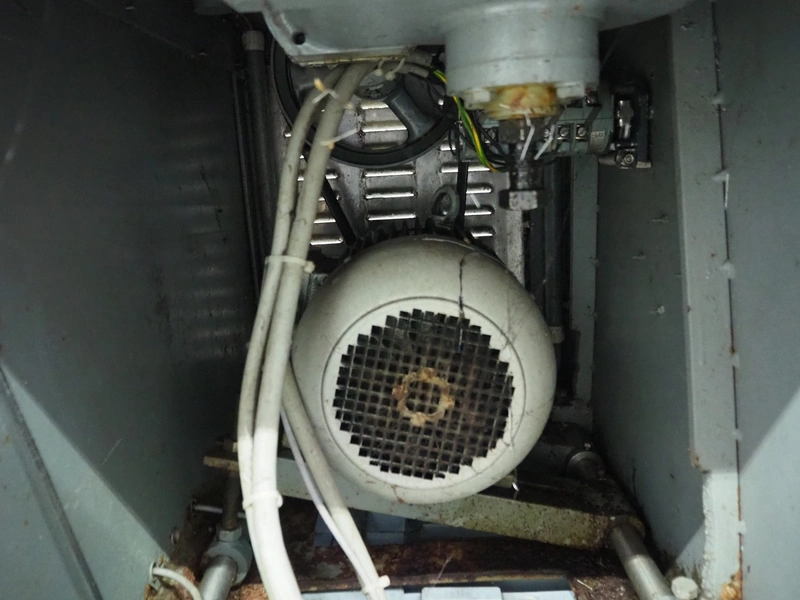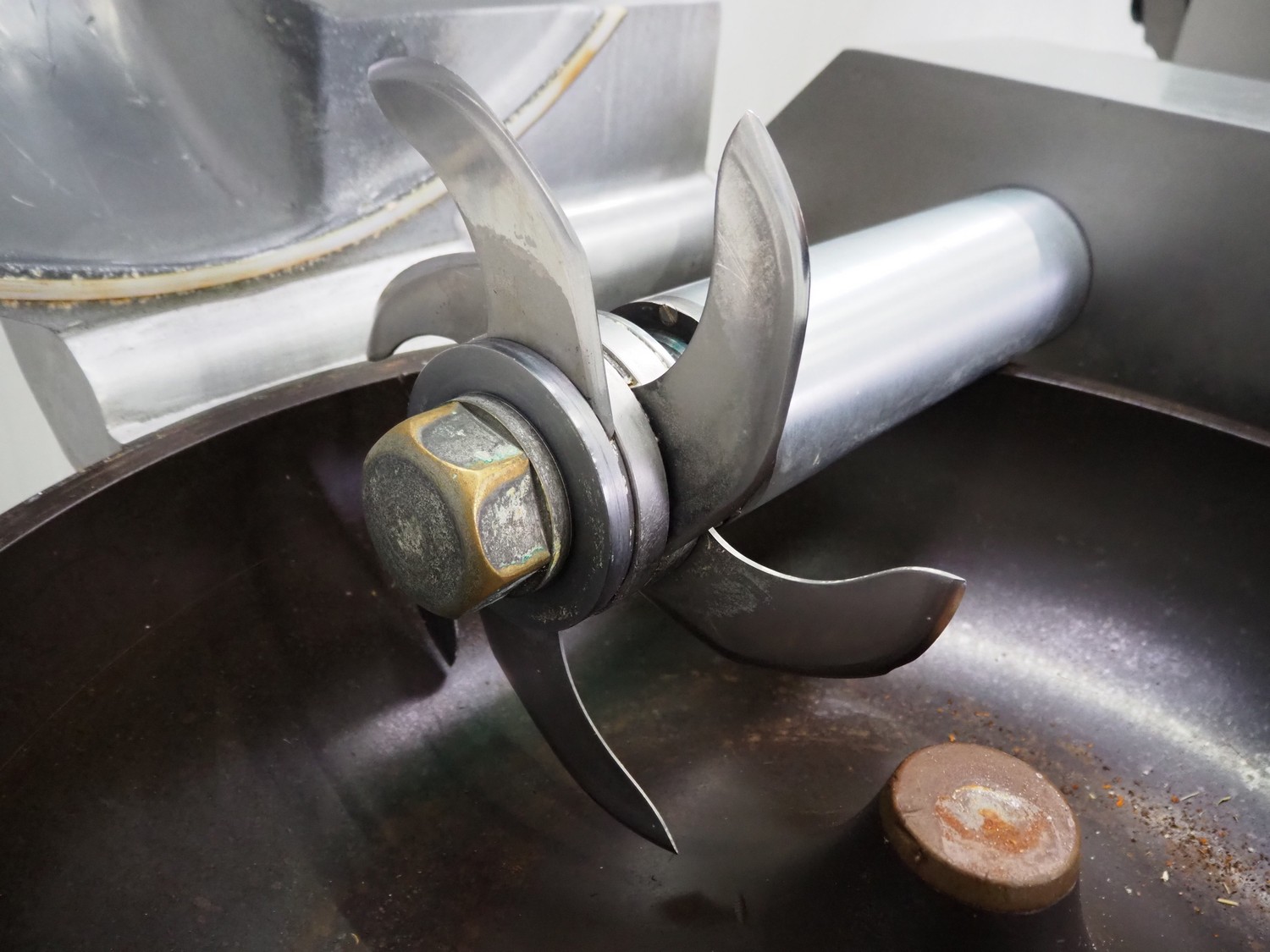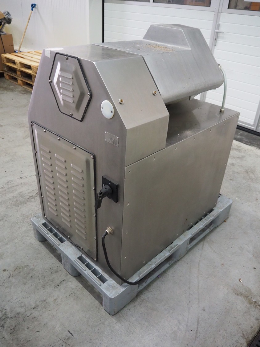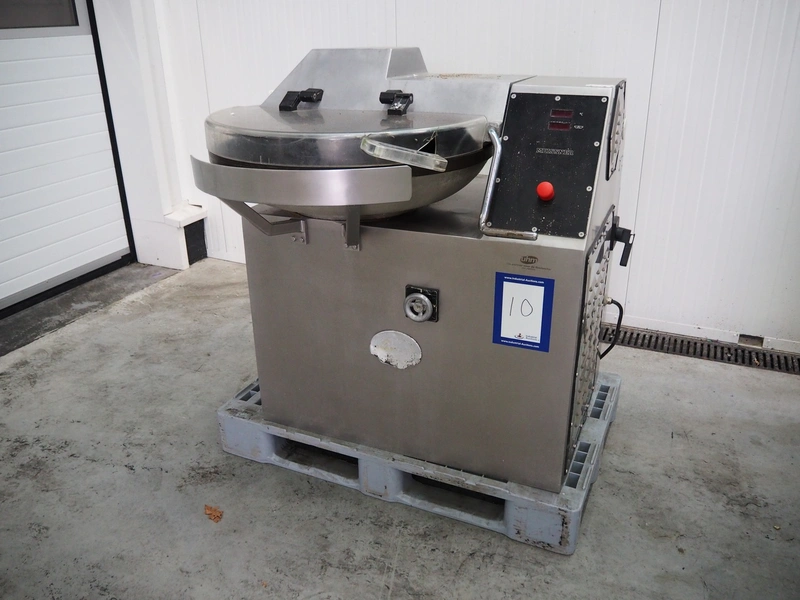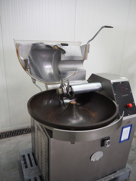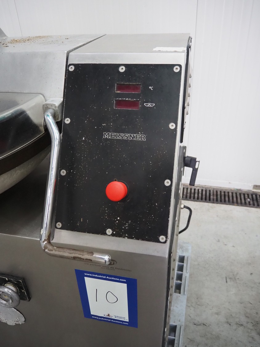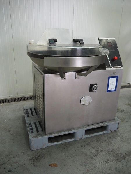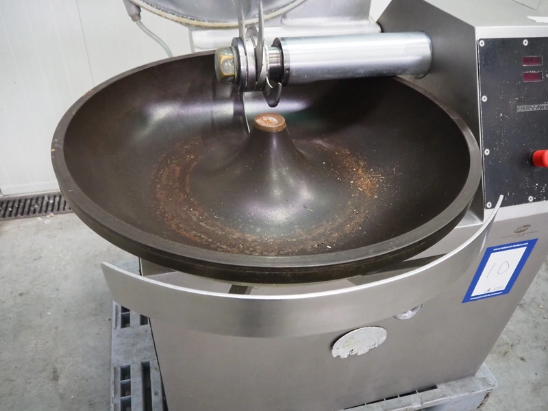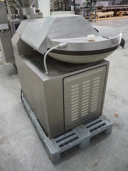 Meissner bowl cutter, type: RN-45, machine number: 118 7139, 380 V, 14/17 A, 6.2/7.8 kW, steel bowl, s/s knifes, volume: 45 liter, total dimensions: 1100 mm x 1000 mm x 1150 mm. Lid broken.