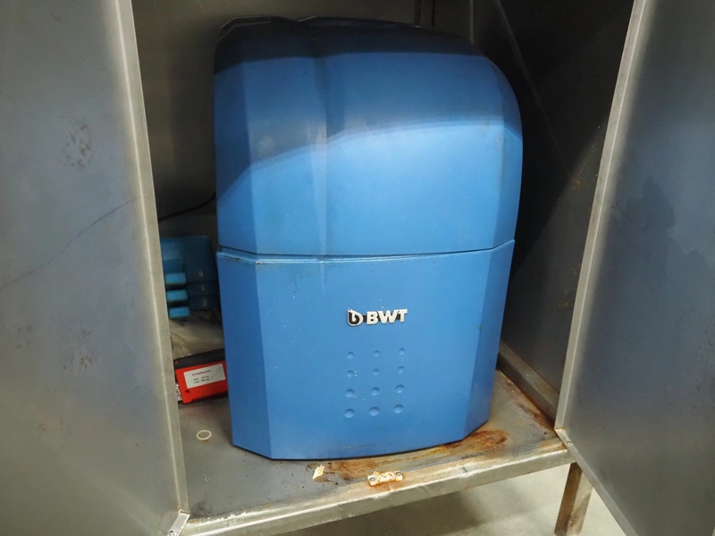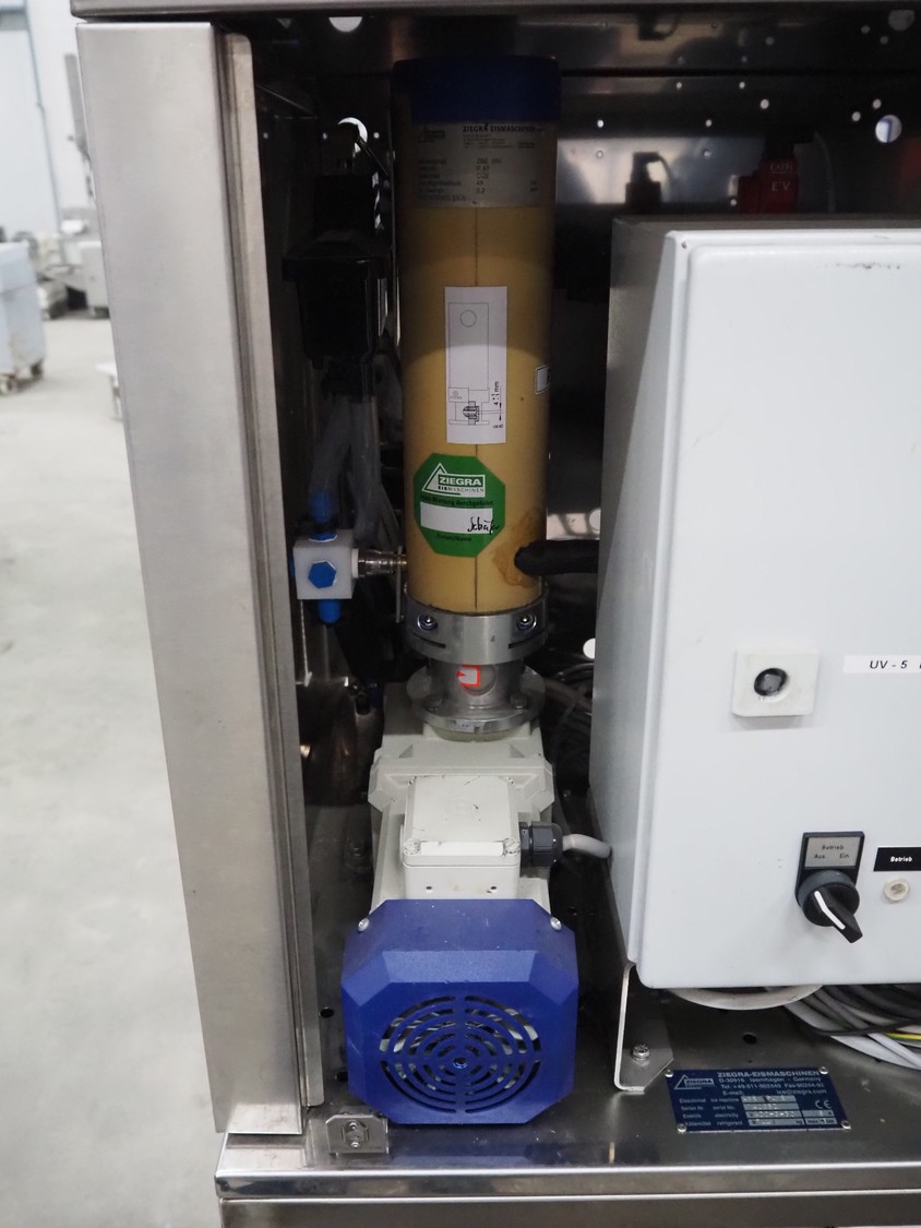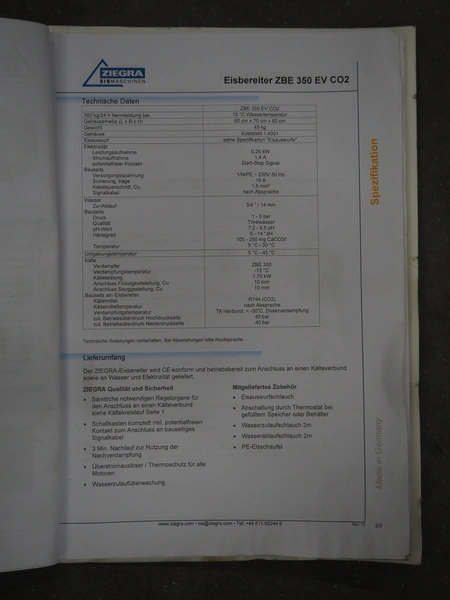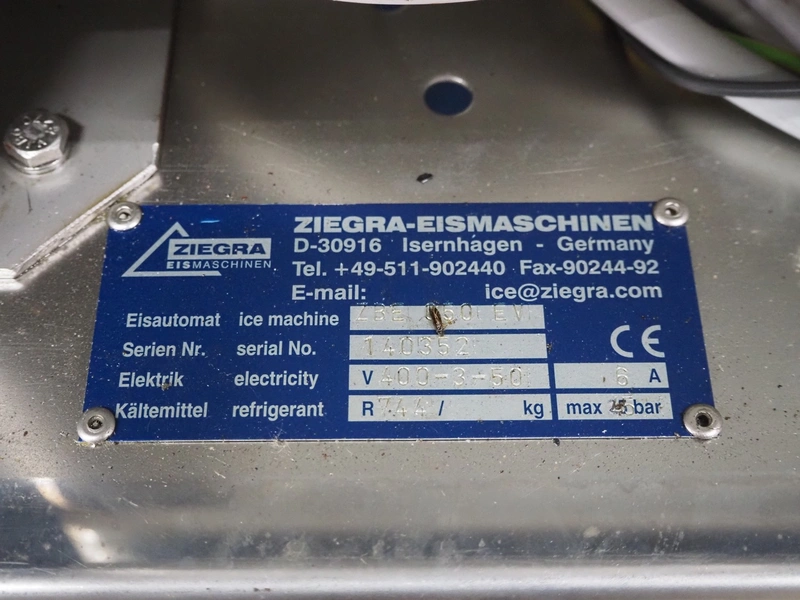 Ziegra-Eismaschinen flake ice machine with BWT water softener, type: ZBE 350 EV, serial number: 140352, 400 V, 3 Ph, 50 Hz, 6 A, refrigerant: R744, dimensions: 700 mm x 750 mm x 1600 mm.