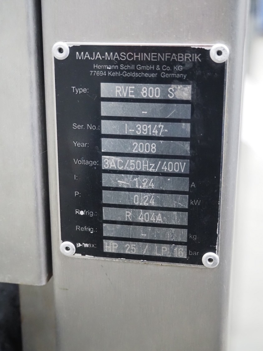 Maja-Maschinenfabrik flake ice machine, type: RVE 800 S, serial number: I-39147, year of construction: 2008, 400 V, 3 Ph, 50 Hz, refrigerant: R 404A, roller width: 340 mm, total dimensions: 1350 mm x 700 mm x 1430 mm.