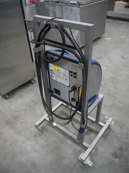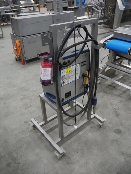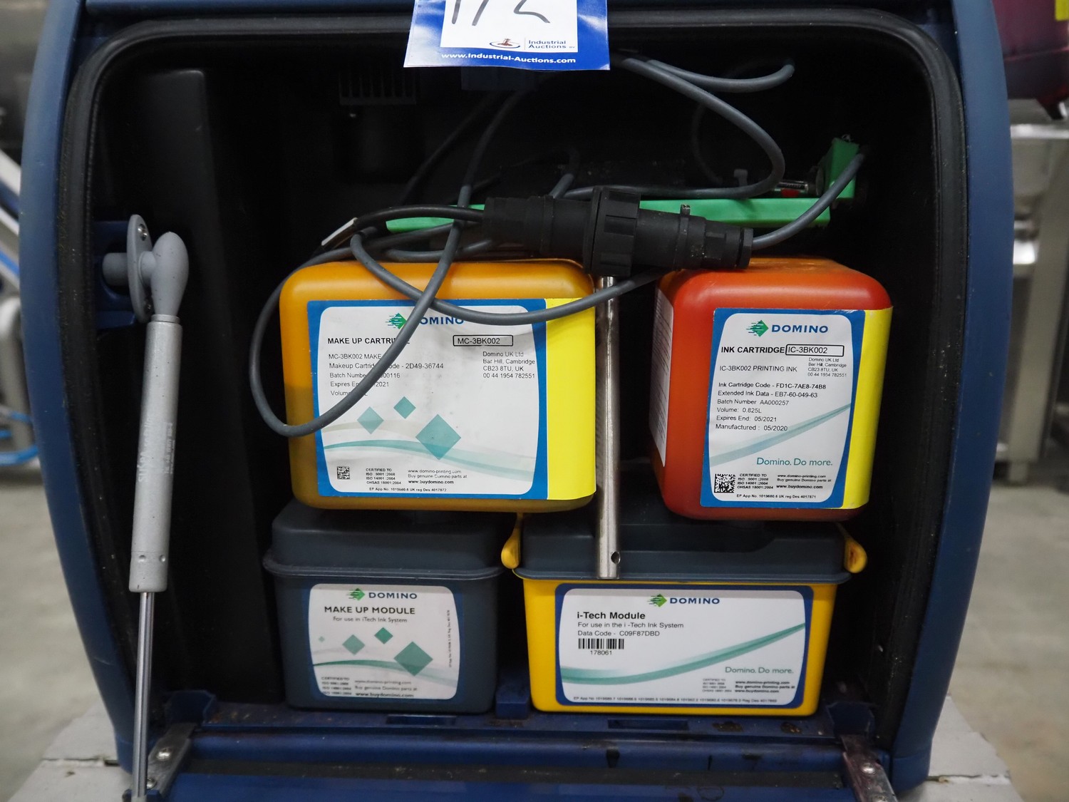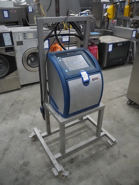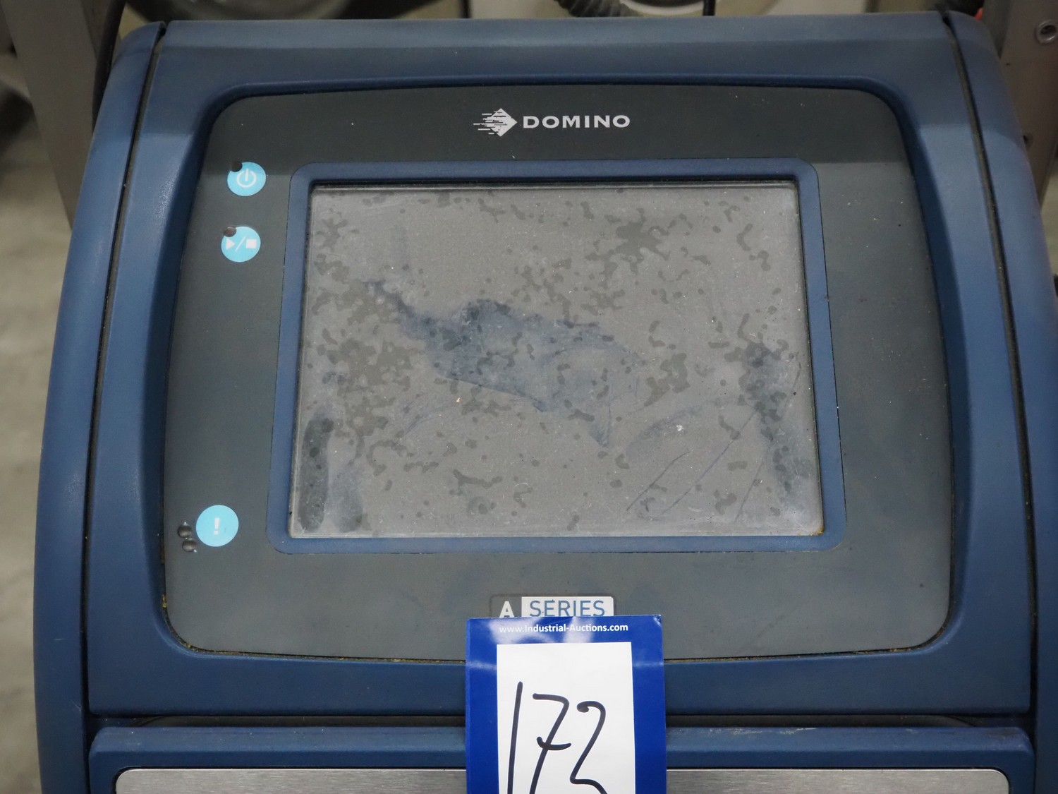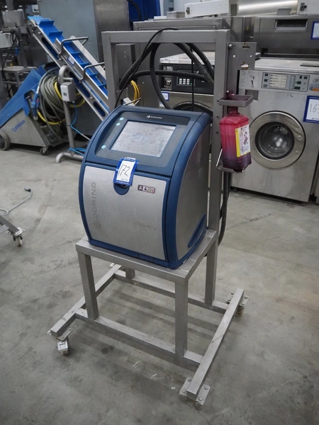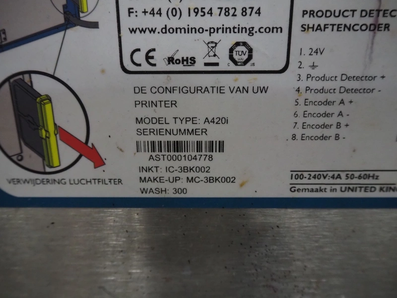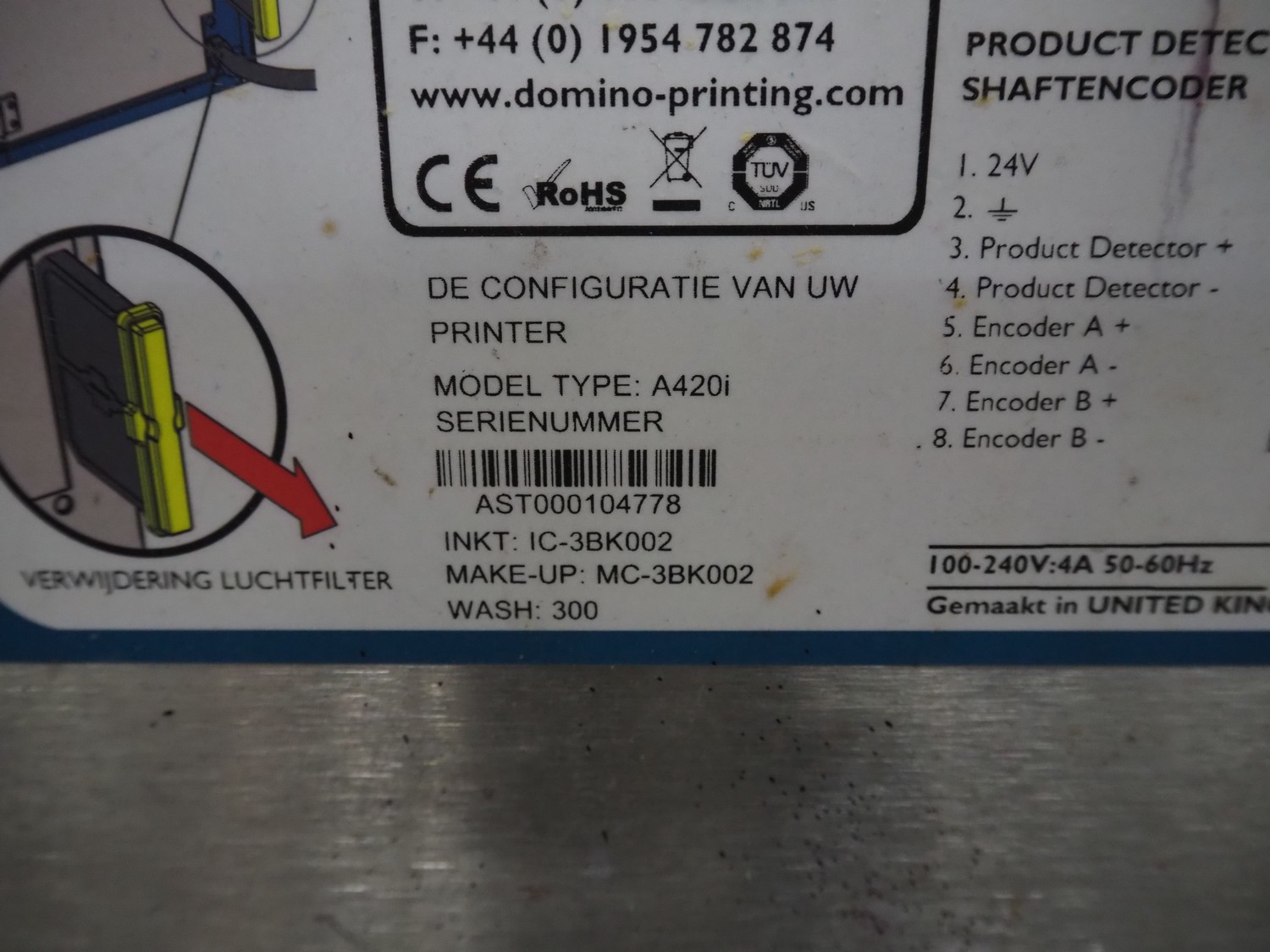 Domino mobile inkjet printer, model: A420i, serial number: AST000104778, 100-240 V, 50-60 Hz, 4 A, dimensions: 820 mm x 680 mm x 1430 mm. Incomplete.