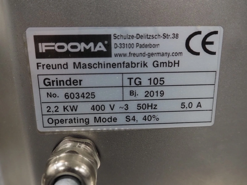 Ifooma / Freund Maschinenfabrik GmbH grinder, type: TG 105, number: 603425, year of construction: 2019, 400 V, 3 Ph, 50 Hz, 5.0 A, 2.2 kW, diameter plate: 98 mm, total dimensions: 700 mm x 590 mm x 590 mm. Never used.