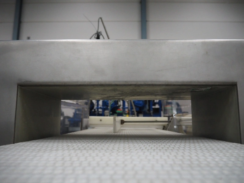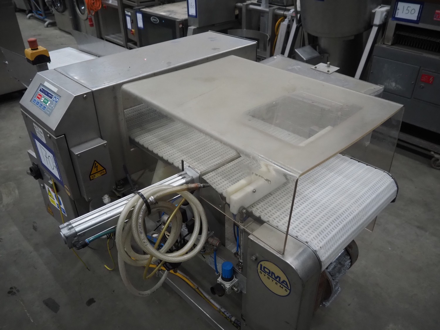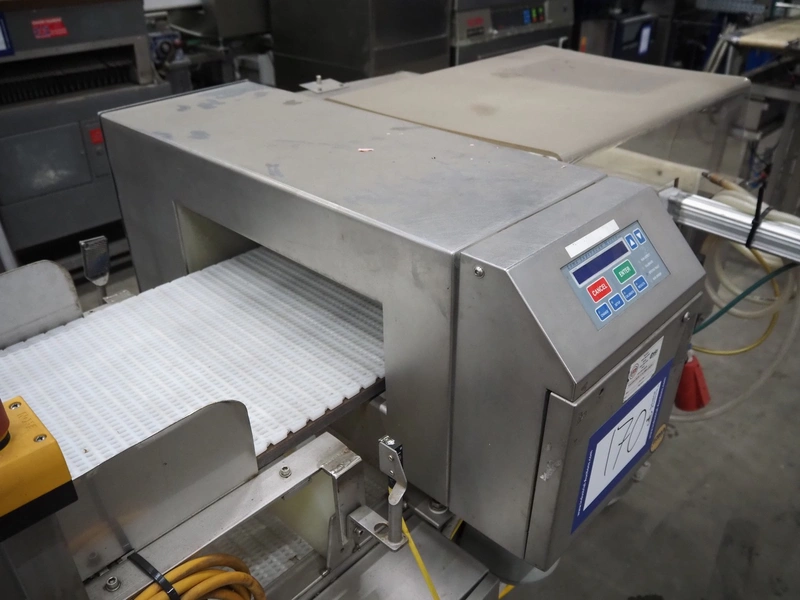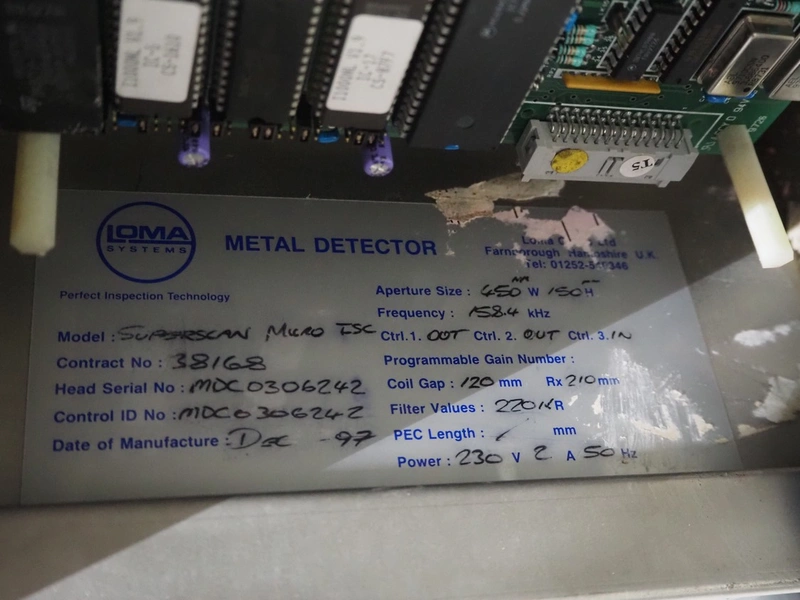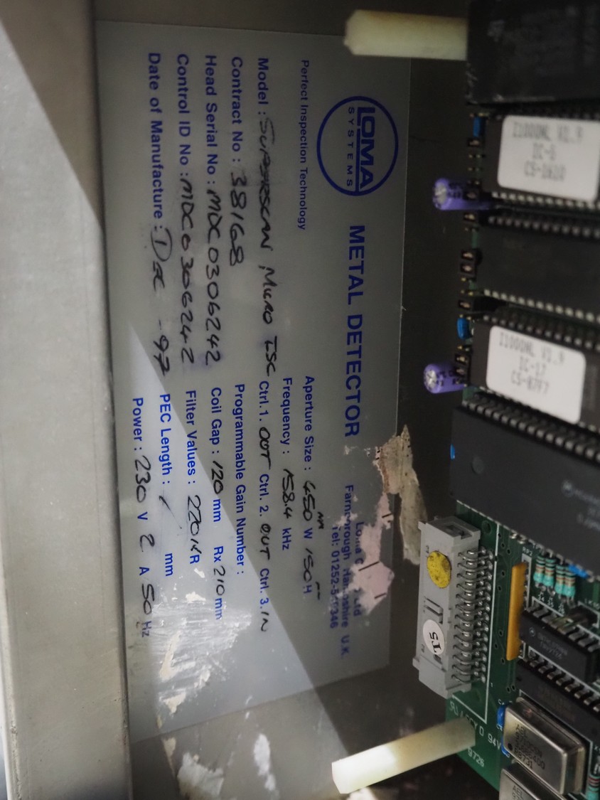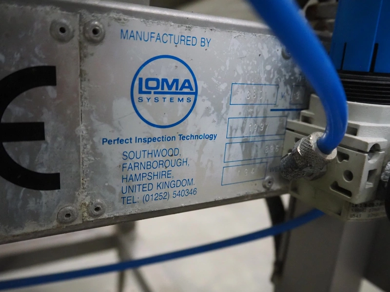 Loma Systems mobile metal detector with rejector, year of construction: 1997, plastic mesh belt, belt width: 400 mm, clearance: 450 mm x 120 mm, total dimensions: 2200 mm x 1200 mm x 1100 mm.