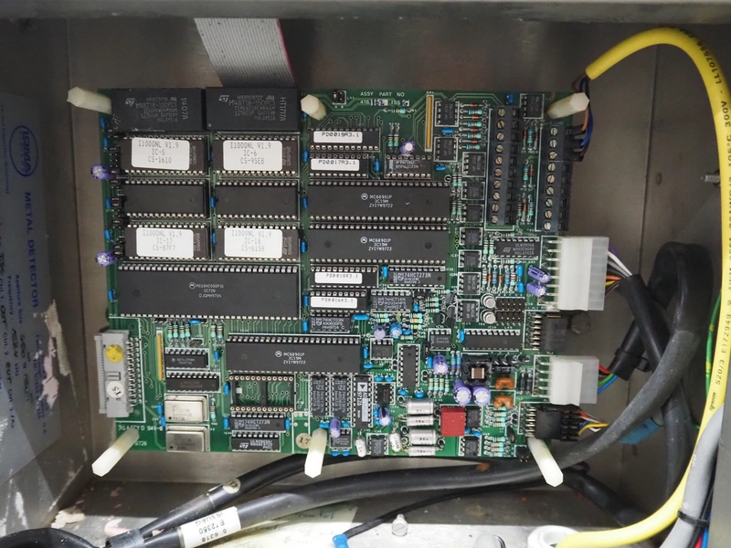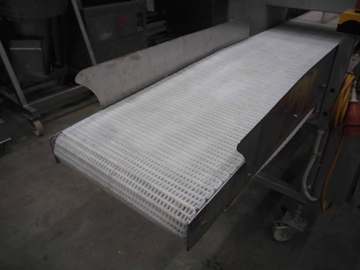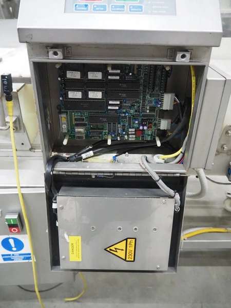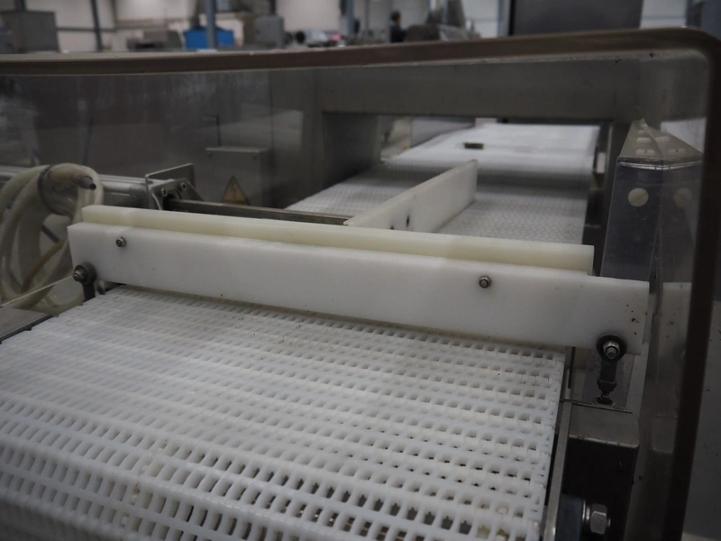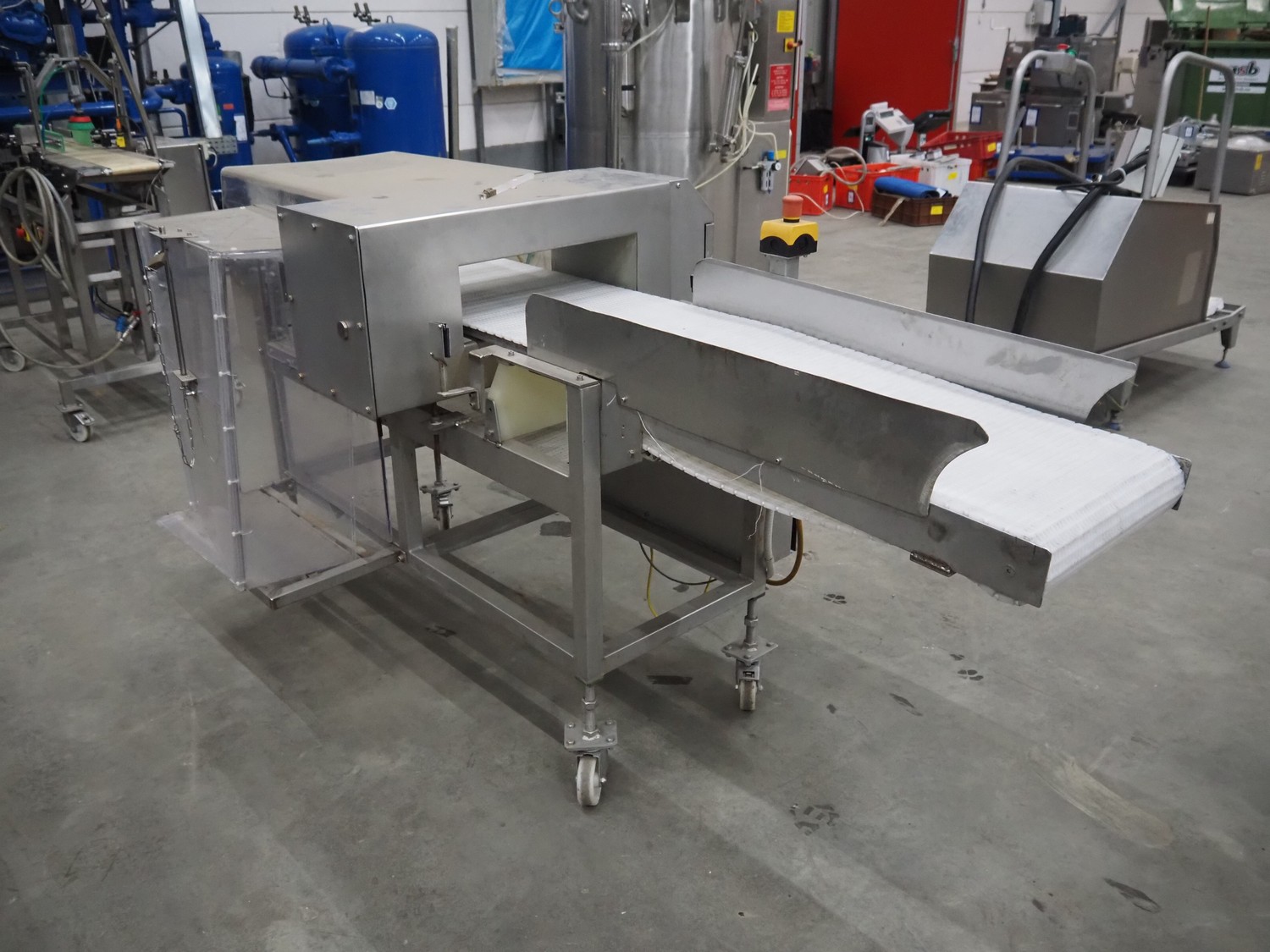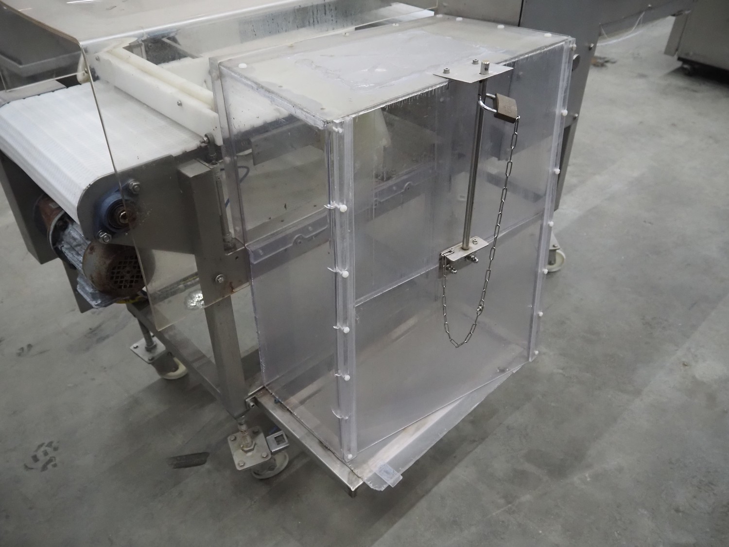 Loma Systems mobile metal detector with rejector, year of construction: 1997, plastic mesh belt, belt width: 400 mm, clearance: 450 mm x 120 mm, total dimensions: 2200 mm x 1200 mm x 1100 mm.