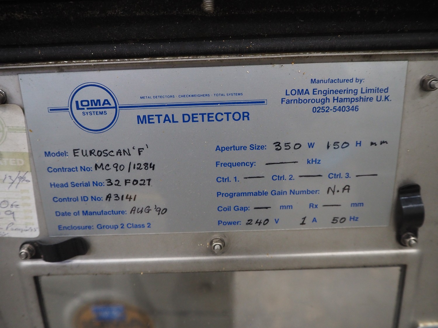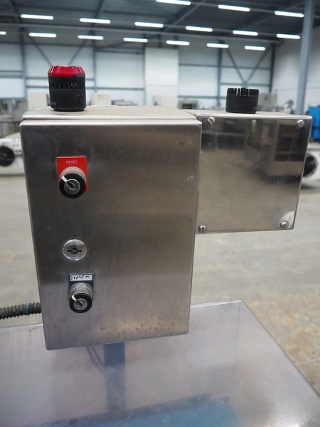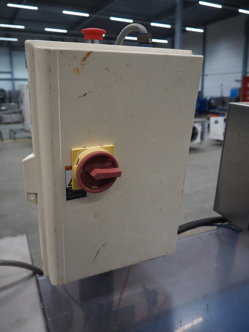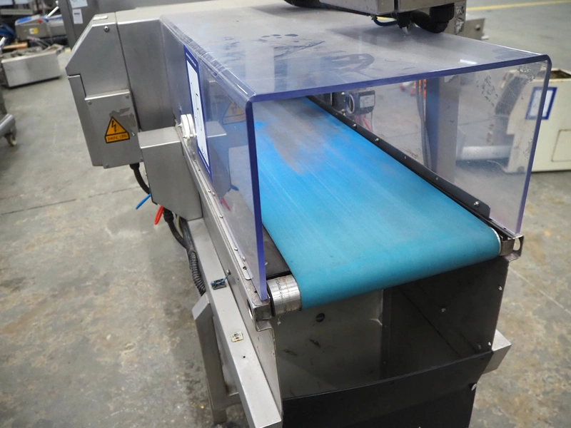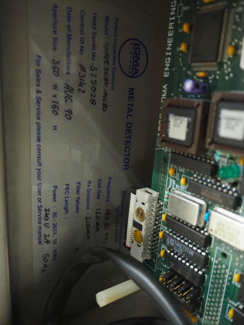 Loma Systems double metal detector with rejector, serial number: 894062, 415/240 V, 3/1 Ph, 50 Hz, clearance: 350 mm x 140 mm, plastic belt, belt width: 290 mm, total dimensions: 2500 mm x 800 mm x 1650 mm.