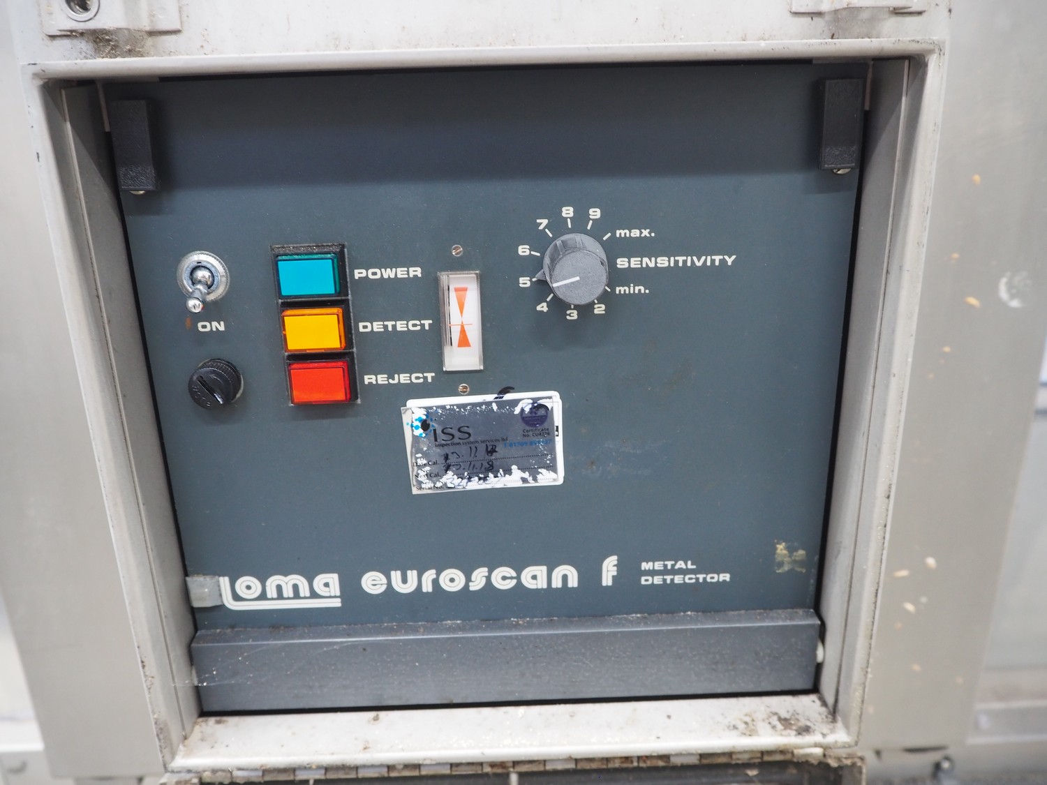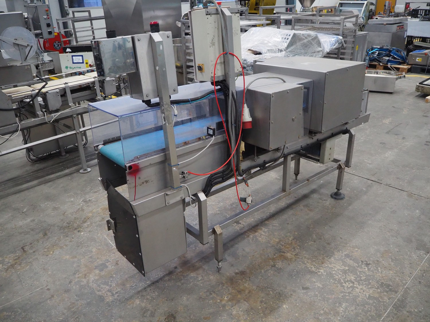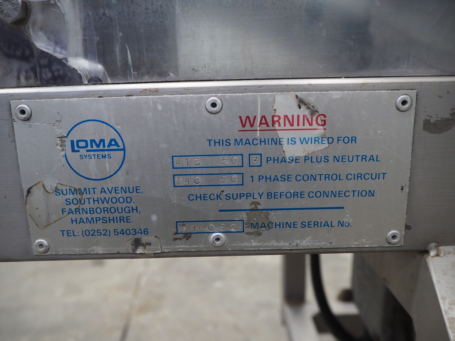 Loma Systems double metal detector with rejector, serial number: 894062, 415/240 V, 3/1 Ph, 50 Hz, clearance: 350 mm x 140 mm, plastic belt, belt width: 290 mm, total dimensions: 2500 mm x 800 mm x 1650 mm.