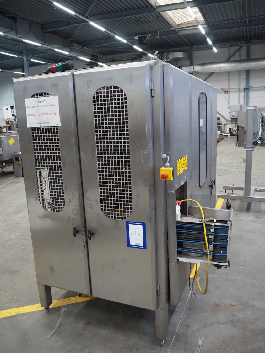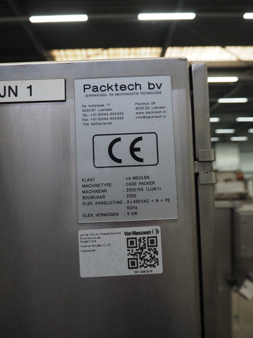 Packtech bv case packer, type: CASE PACKER, machine number: 2002155 (LIJN1), year of construction: 2002, 400 V, 3 Ph, 50 Hz, 5 kW, dimensions: 2700 mm x 1400 mm x 2200 mm. Incomplete.