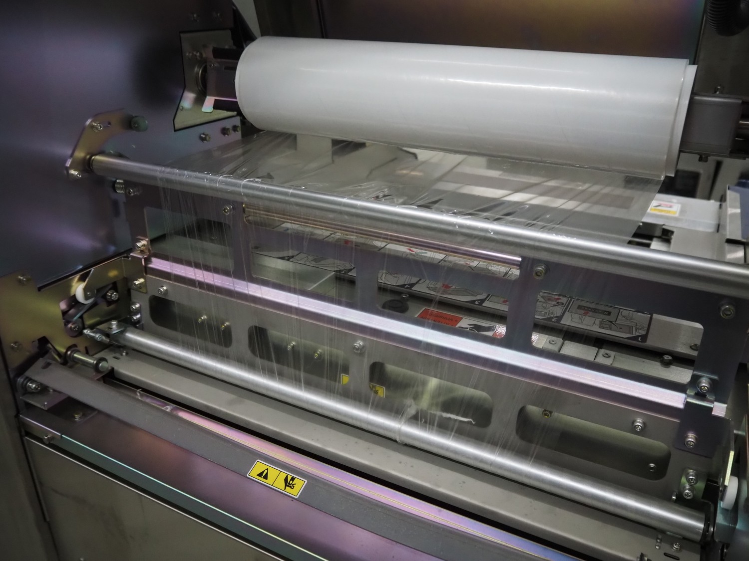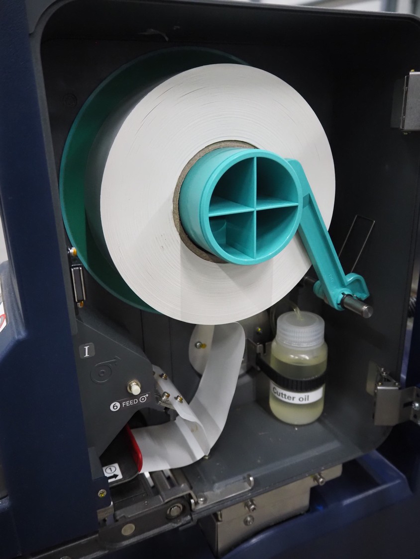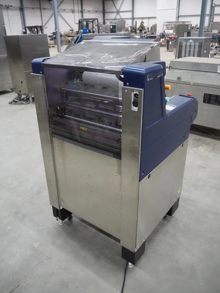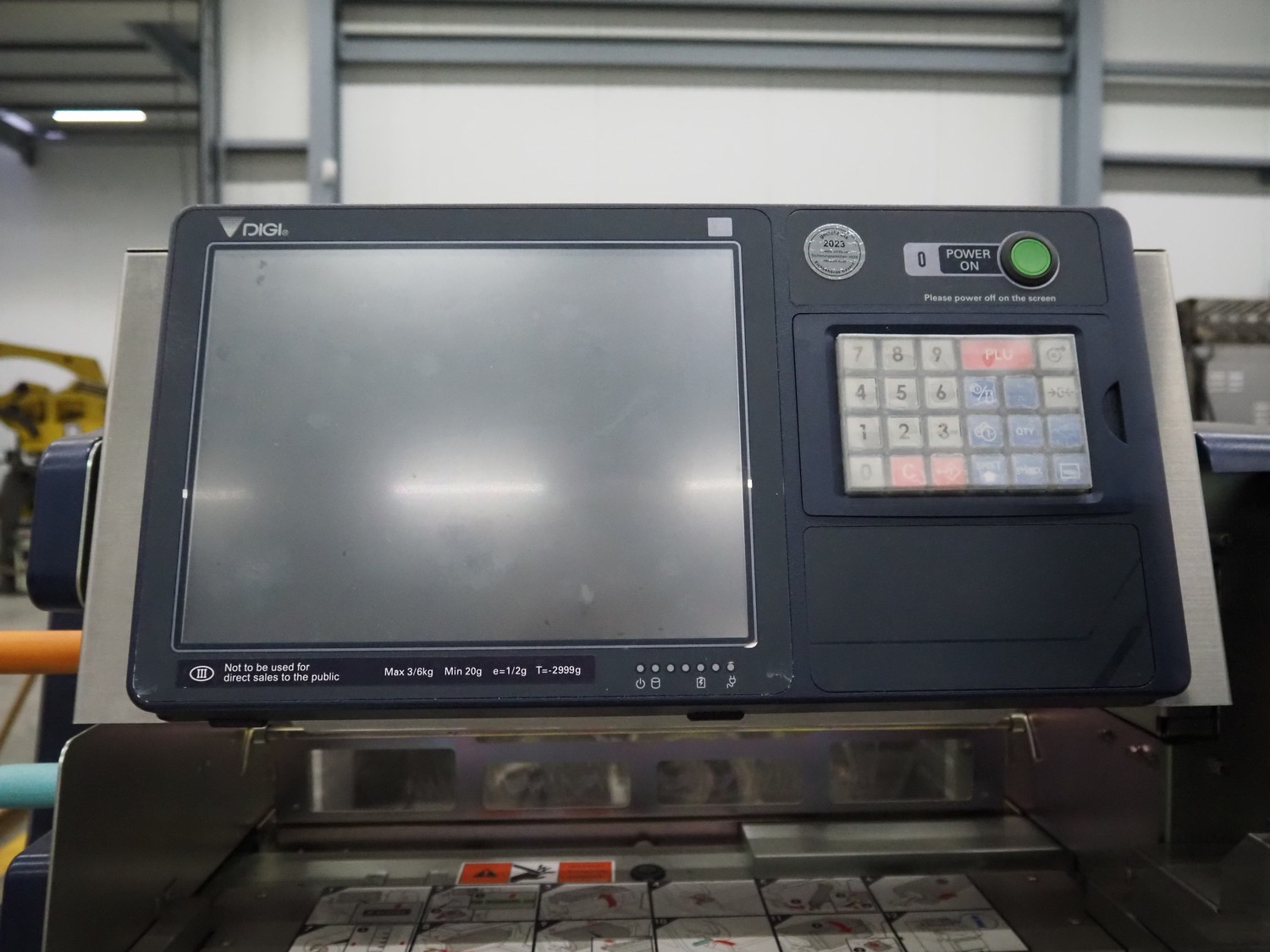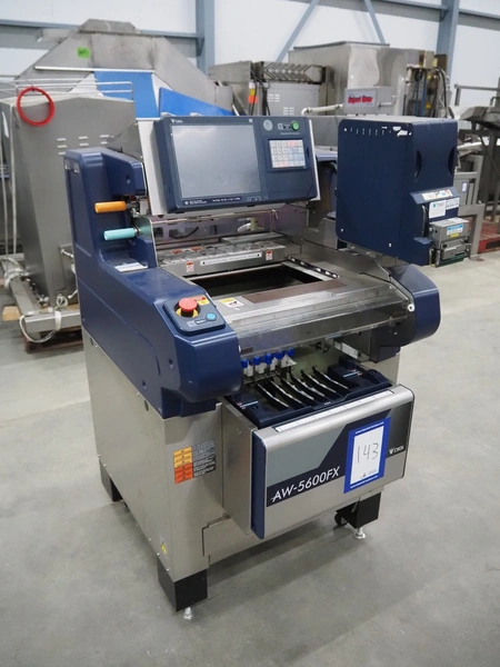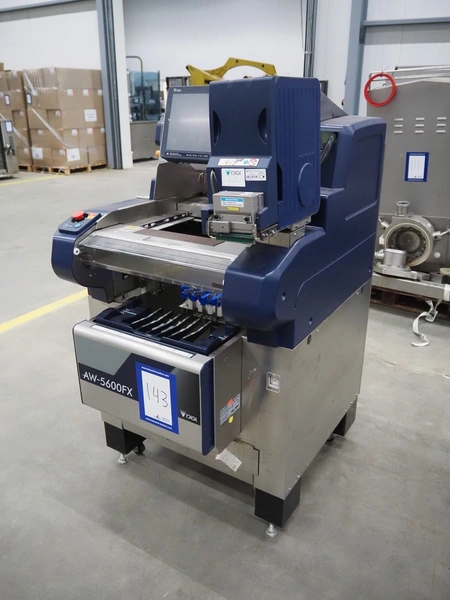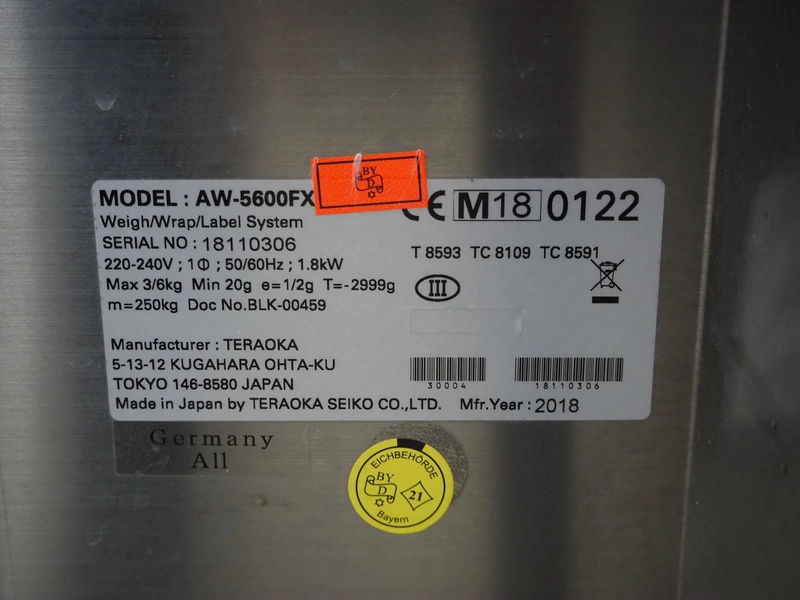 Teraoka Seiko co., LTD. mobile weigh-, wrap-, and label machine, model: AW-5600FX, serial number: 18110306, year of construction: 2018, 220/240 V, 1 Ph, 50/60 Hz, 1.8 kW, maximum: 3/6 kg, minimum: 20g, e=1/2 kg, T=-2999 g, m=250 kg, clearance: 380 mm x 280 mm, film width: 380 mm, total dimensions: 970 mm x 800 mm x 1440 mm.