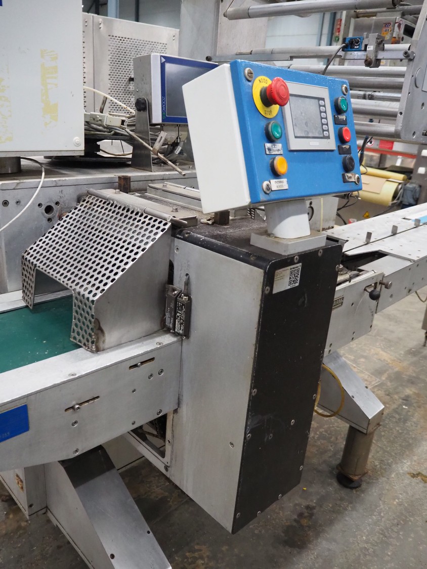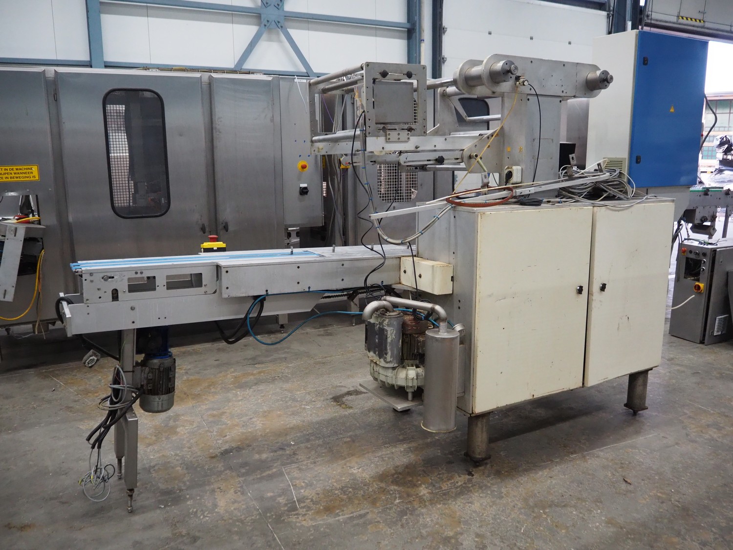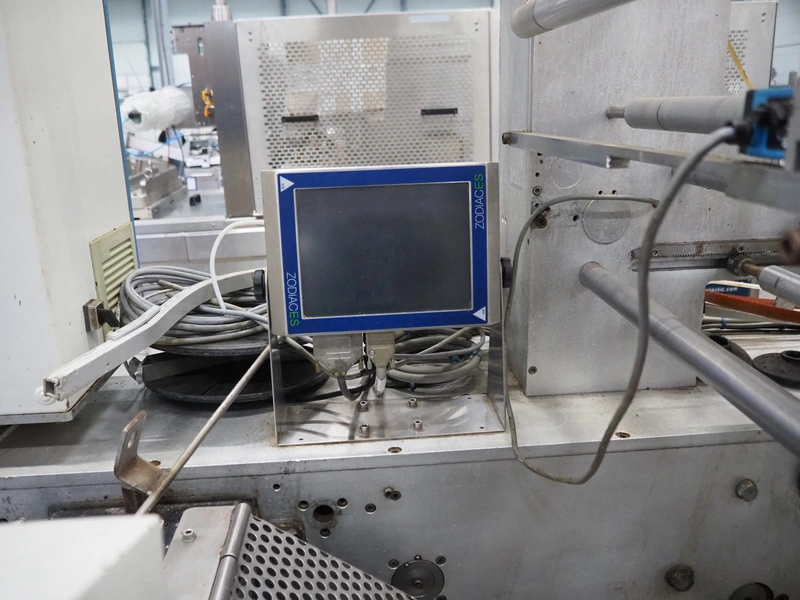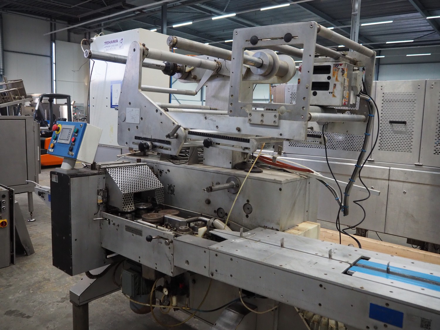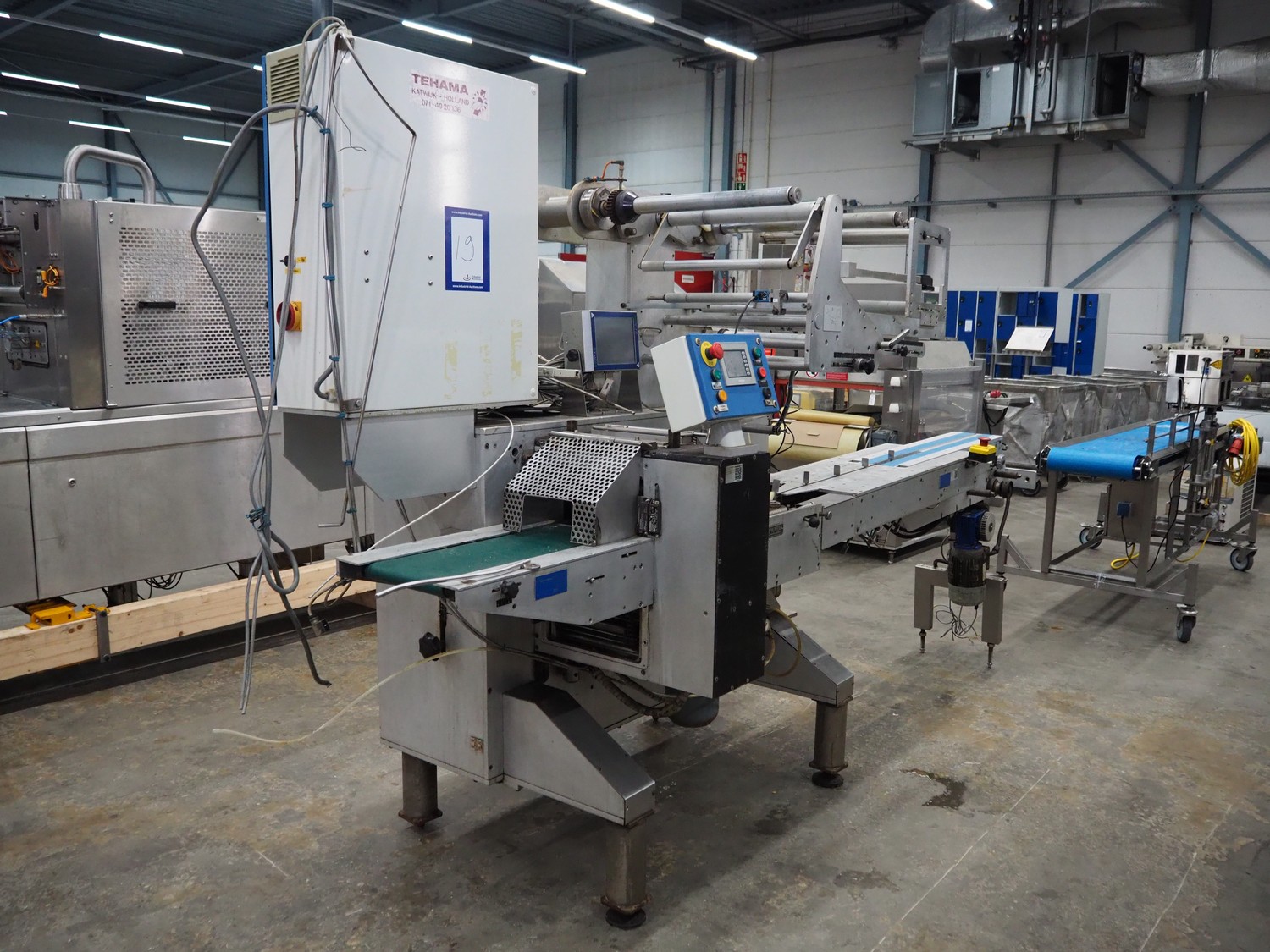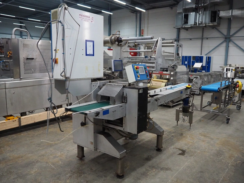 Tevopharm flowpacker with ZodiacES coding attachment, seal width: 190 mm, plastic belt, belt width: 250 mm, total dimensions: 3650 mm x 1150 mm x 2100 mm.