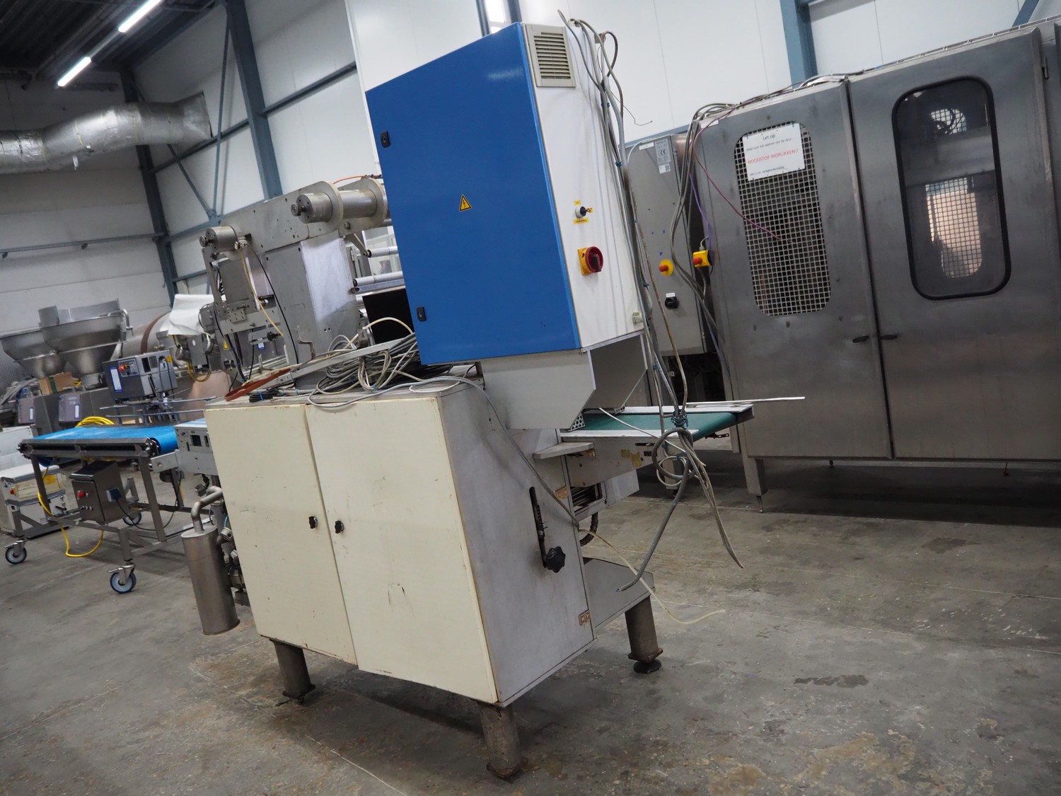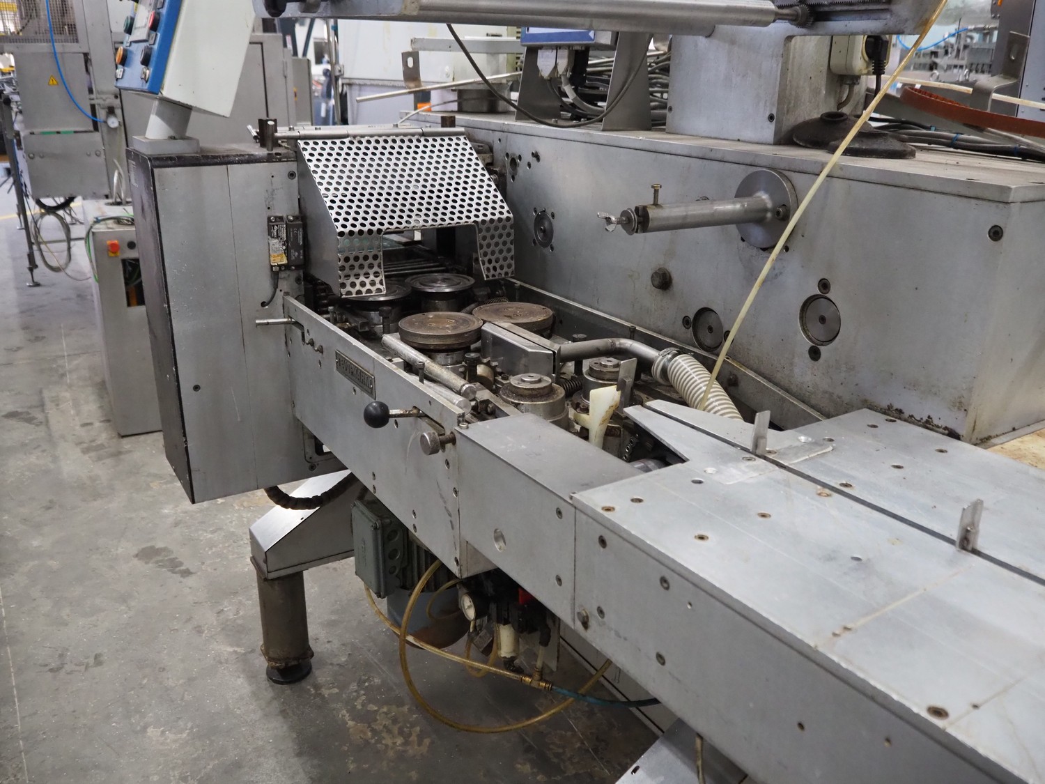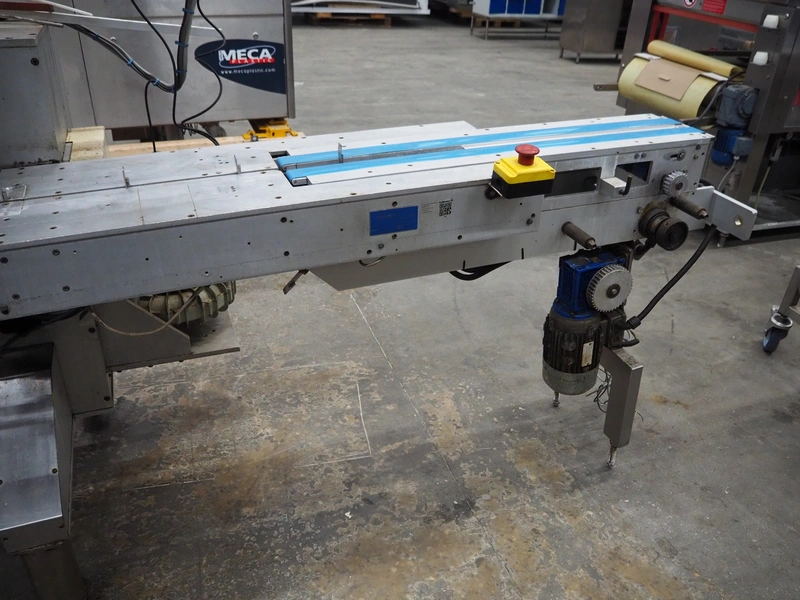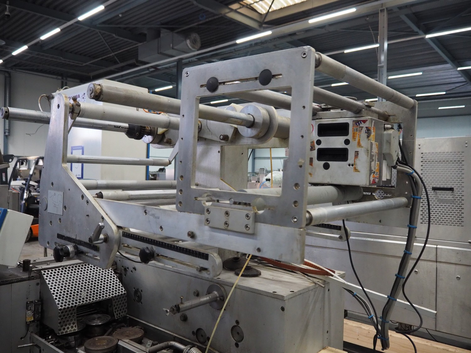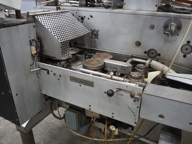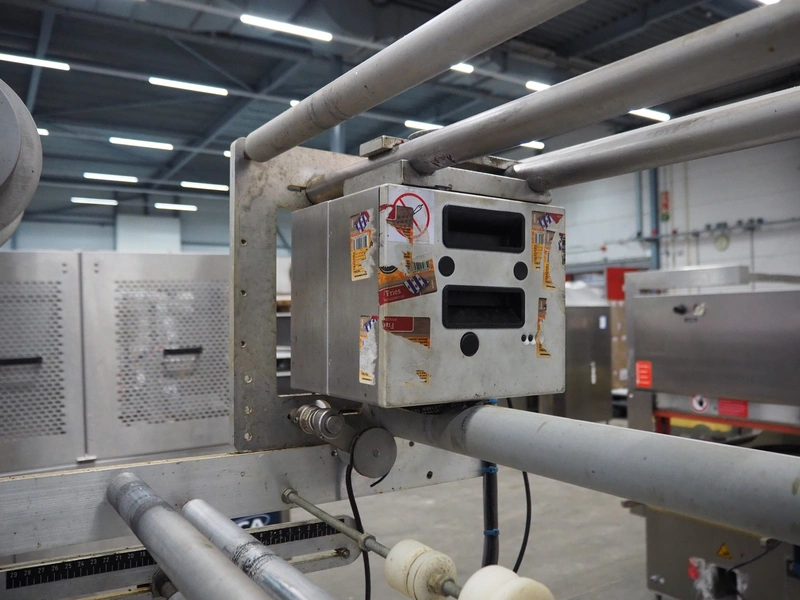 Tevopharm flowpacker with ZodiacES coding attachment, seal width: 190 mm, plastic belt, belt width: 250 mm, total dimensions: 3650 mm x 1150 mm x 2100 mm.