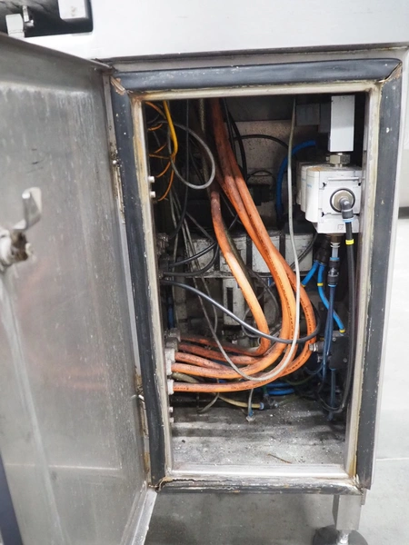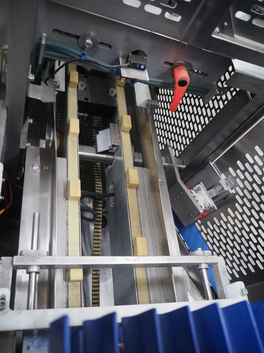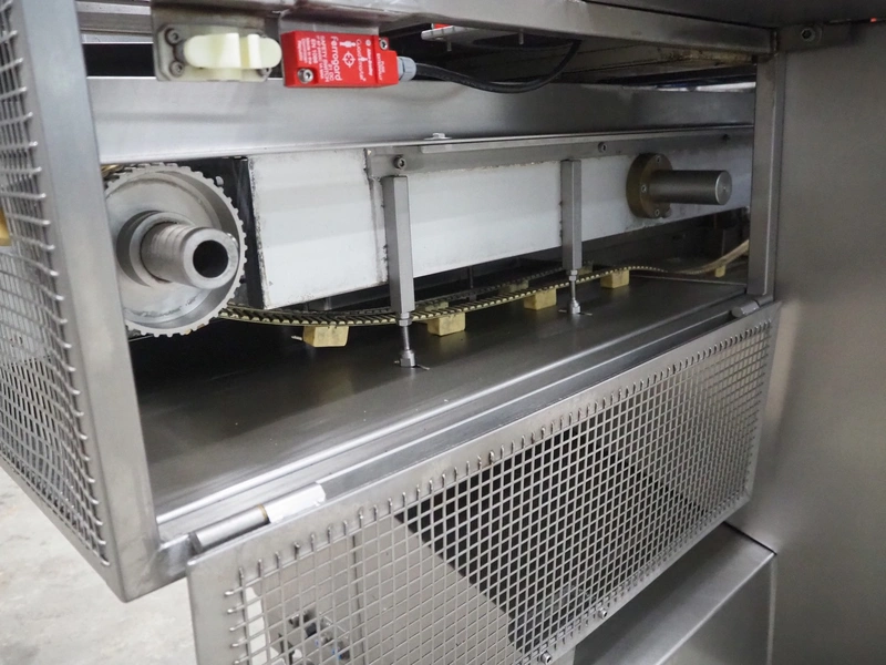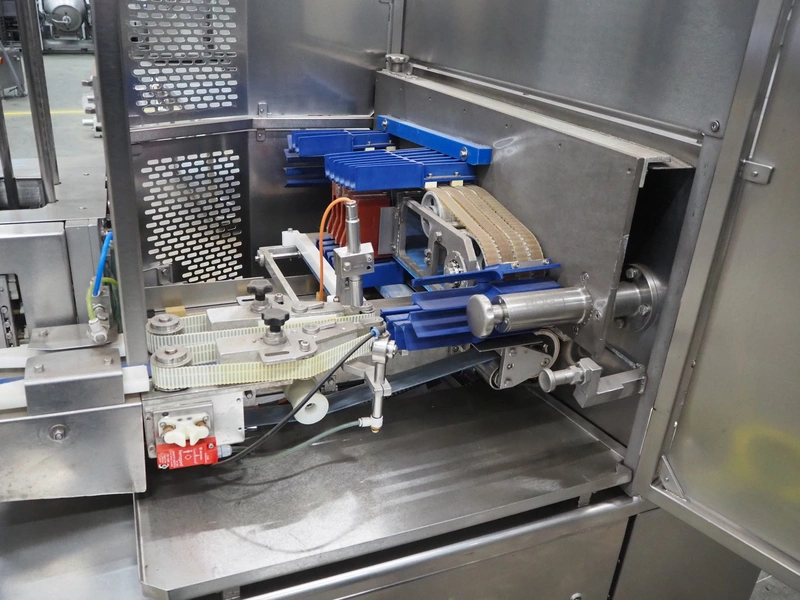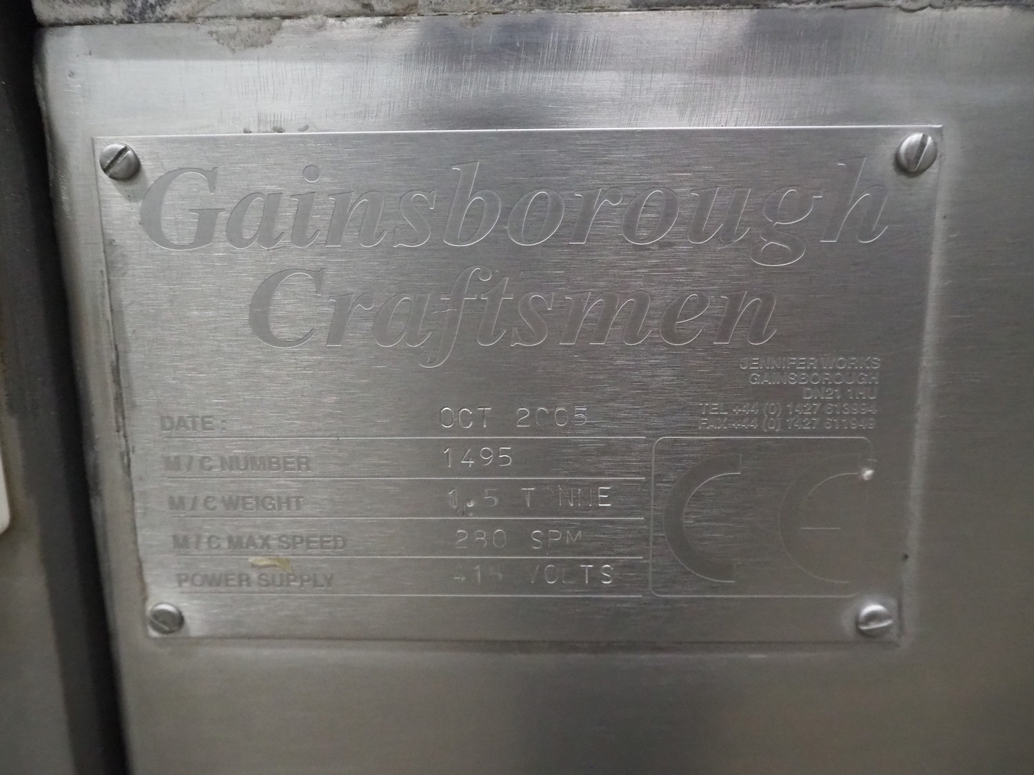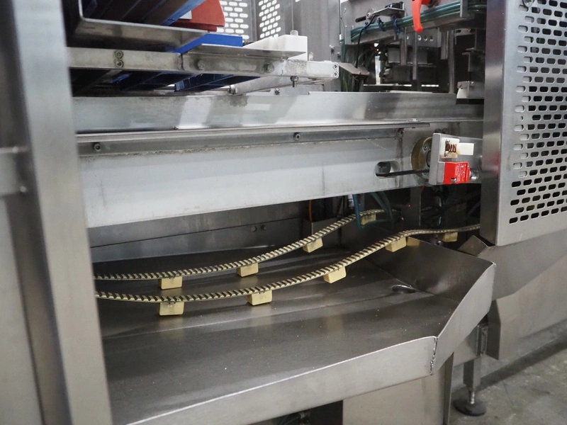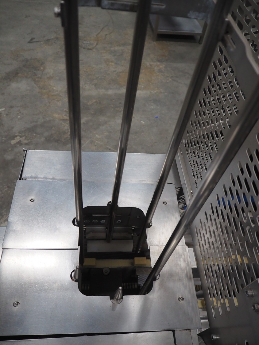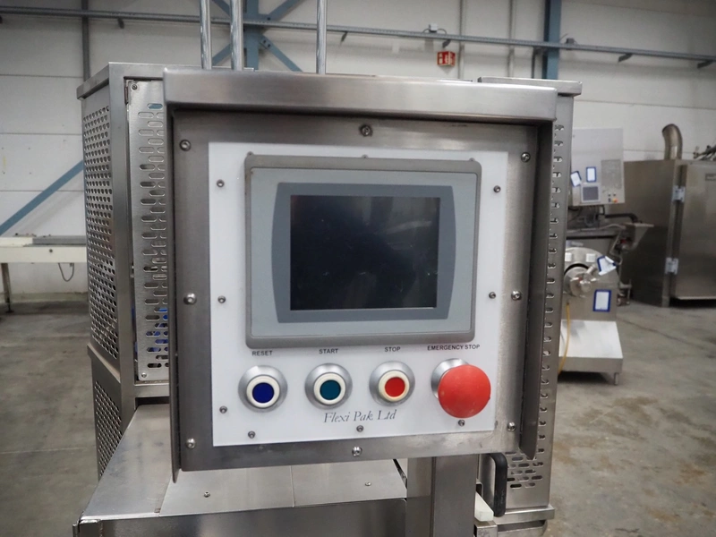 Gainsborough Craftsmen packaging machine for sausages with tray denester, machine number: 1495, year of construction: oct 2005, 415 V, weight: 1500 kg, plastic belt, belt width: 50 mm, tray dimensions: 140 mm x 190 mm, total dimensions: 3350 mm x 1050 mm x 1950 mm. Incomplete.