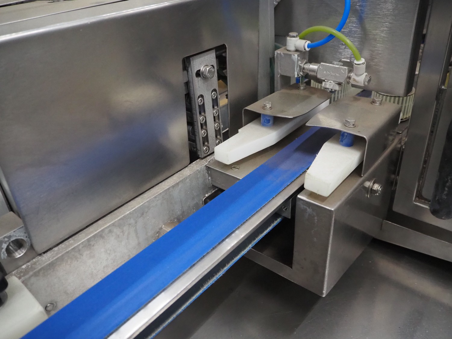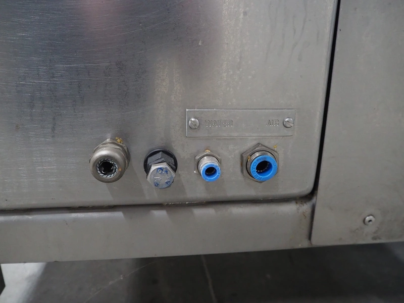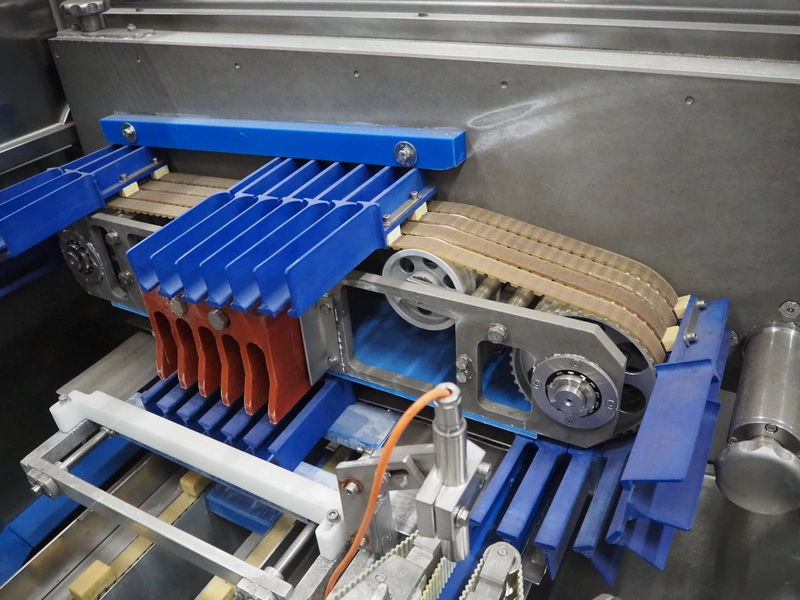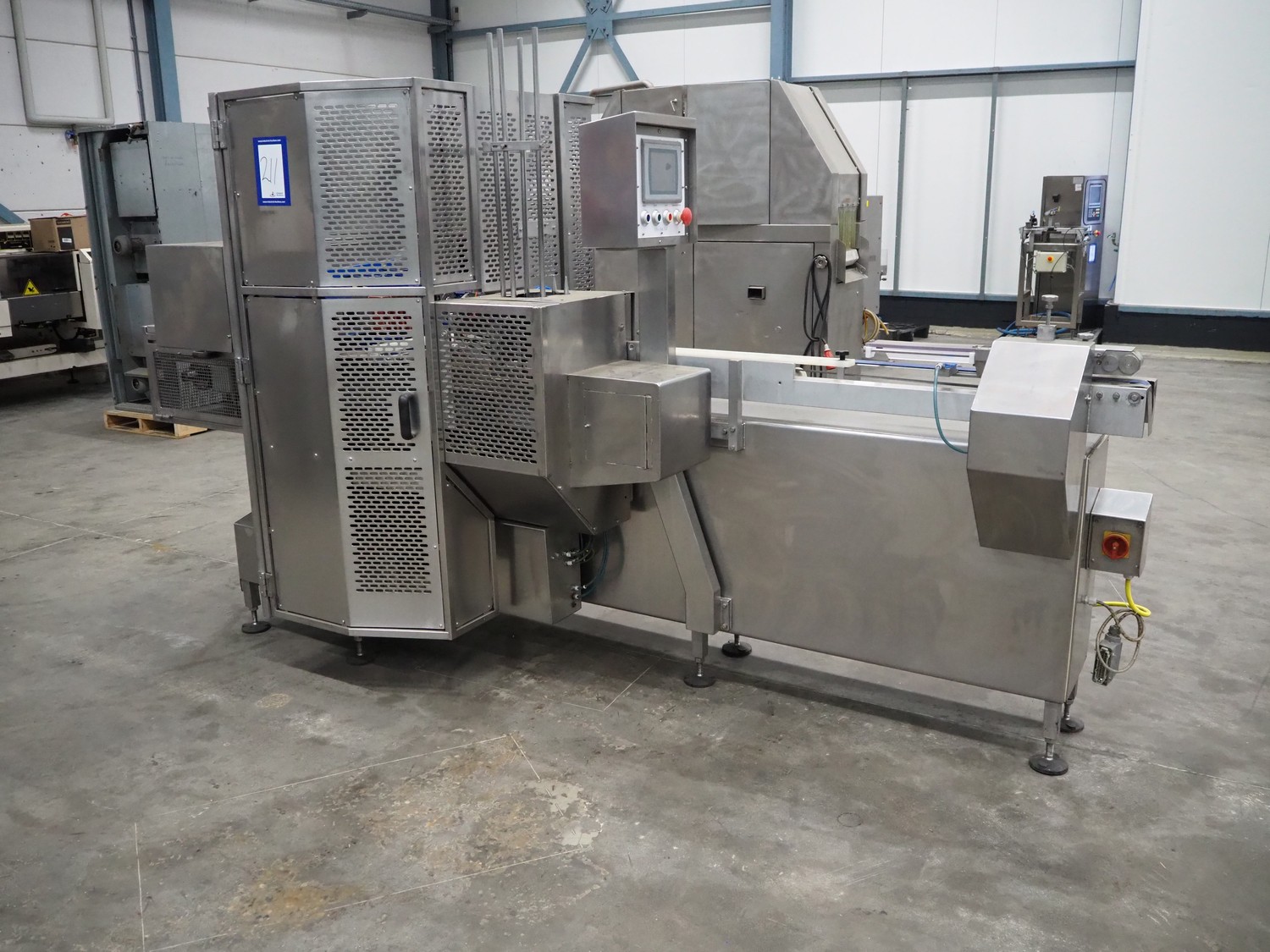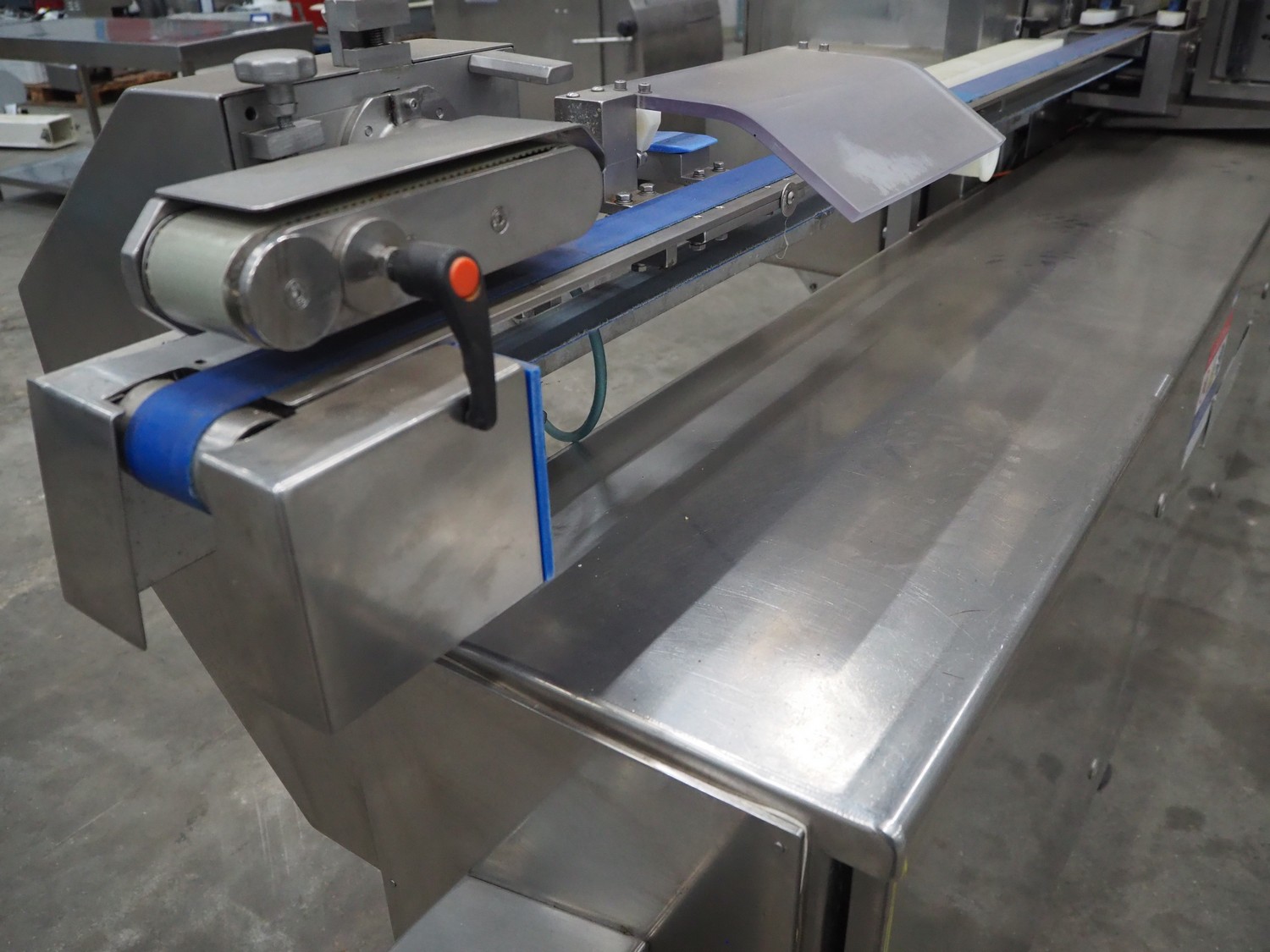 Gainsborough Craftsmen packaging machine for sausages with tray denester, machine number: 1495, year of construction: oct 2005, 415 V, weight: 1500 kg, plastic belt, belt width: 50 mm, tray dimensions: 140 mm x 190 mm, total dimensions: 3350 mm x 1050 mm x 1950 mm. Incomplete.