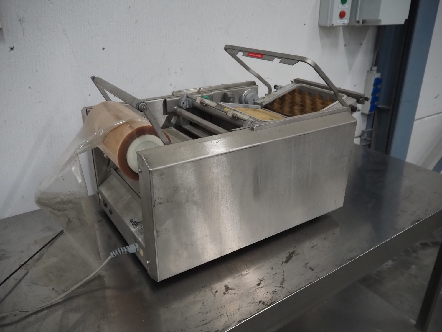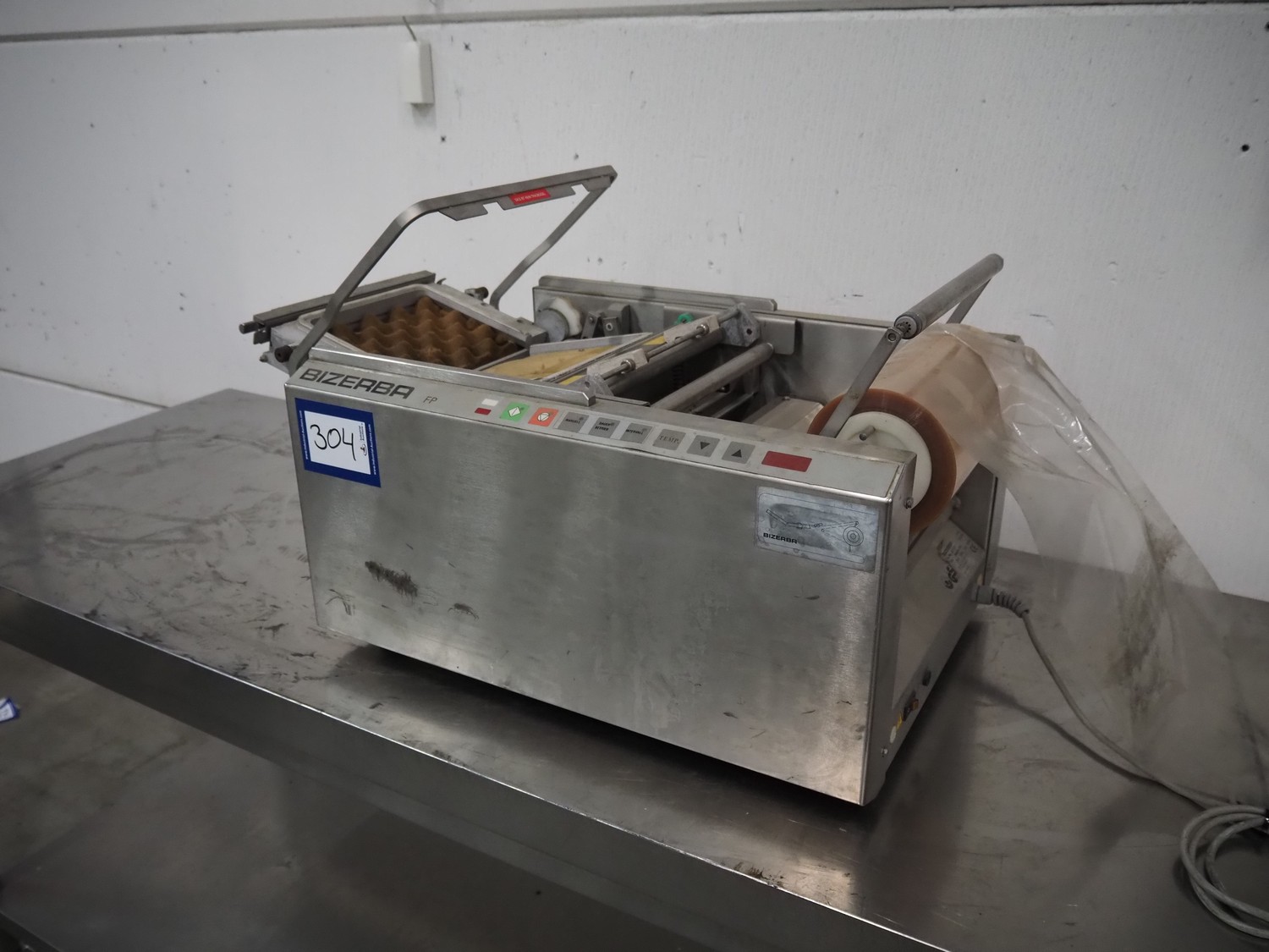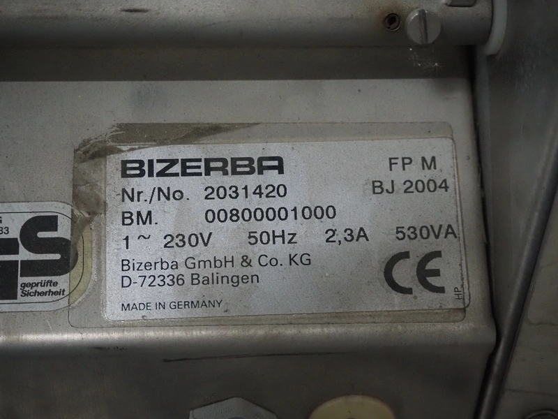 Bizerba packaging machine, type: FP M, number: 2031420, year of construction: 2004, 230 V, 1 Ph, 50 Hz, 2.3 A, 530 VA, dye: 220 mm x 170 mm, film width: 250 mm, total dimensions: 780 mm x 500 mm x 420 mm.