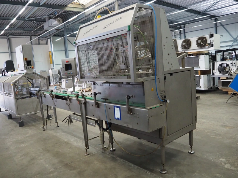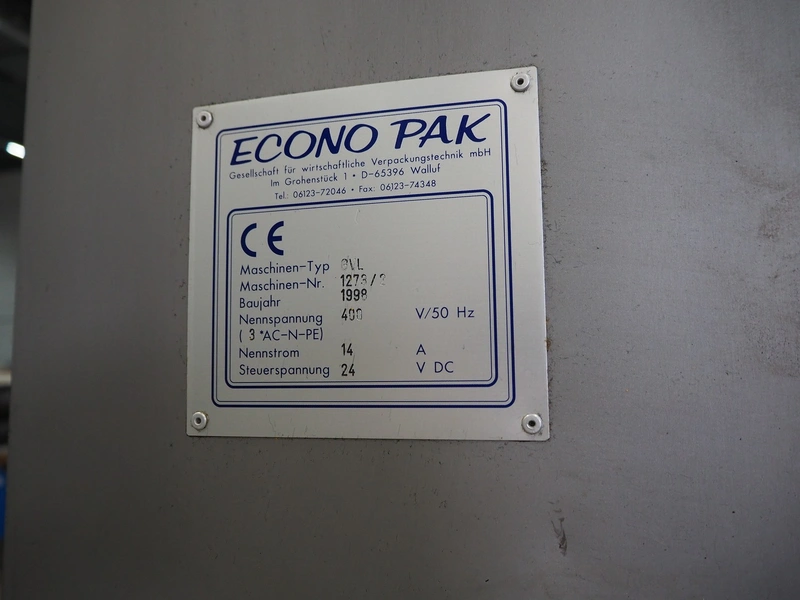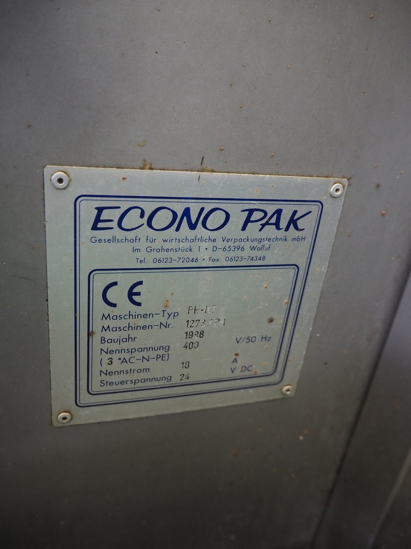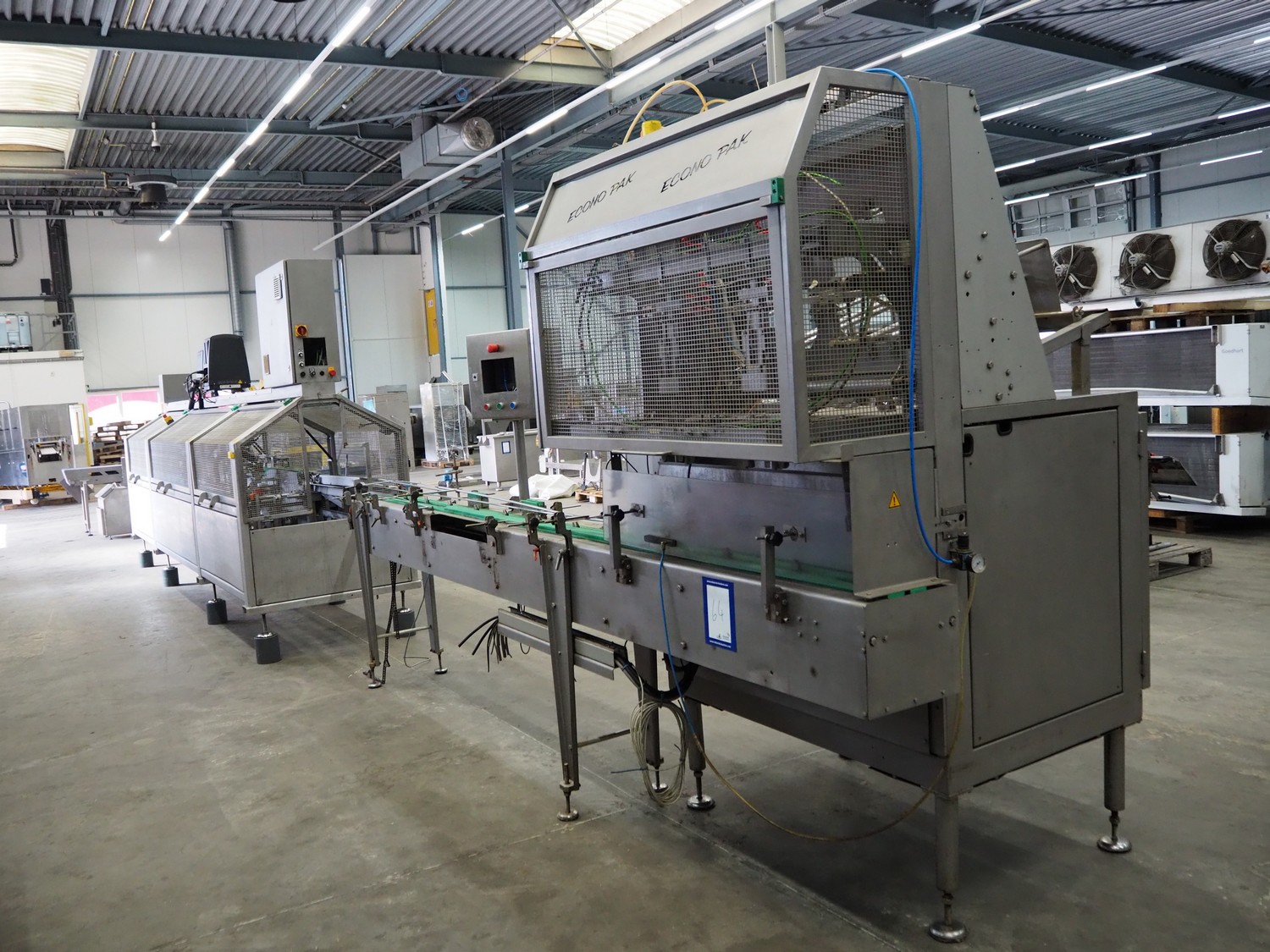 Econo Pak case packing line consisting of: Econo Pak carton denester, type: PH-KT, machine number: 1273/PH, year of construction: 1998, 400 V, 3 Ph, 50 Hz, 10 A, dimensions: 4800 mm x 1400 mm x 2450 mm and Econo Pak box closing machine, type: GVL, machine number: 1273/2, year of construction: 1998, 400 V, 3 Ph, 50 Hz, 14 A, dimensions: 7000 mm x 1200 mm x 2450 mm. Incomplete.