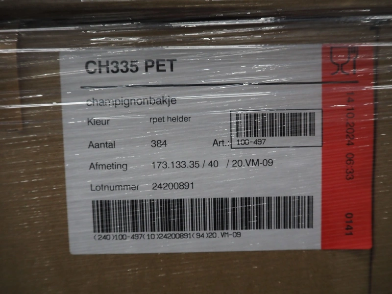 3 pallets with approximately 9600 plastic CH335 PET trays, tray dimensions: 173 mm x 133 mm x 35 mm.