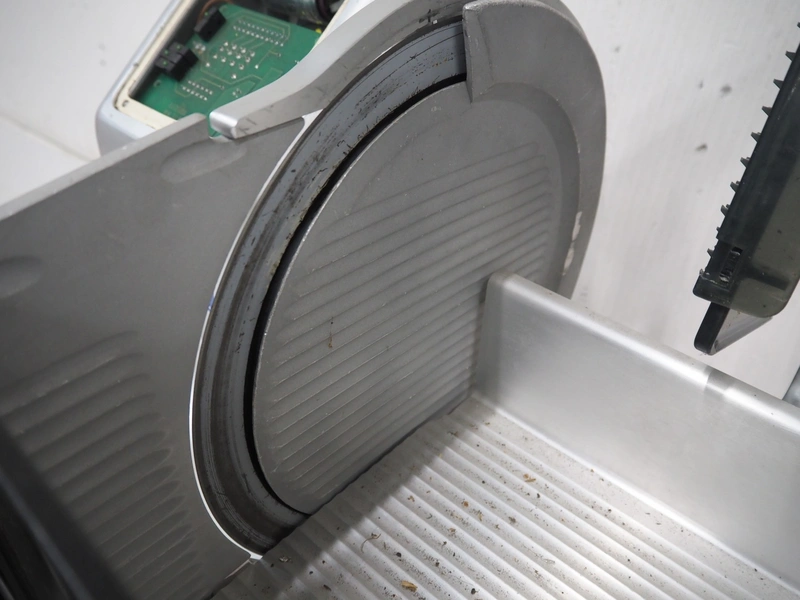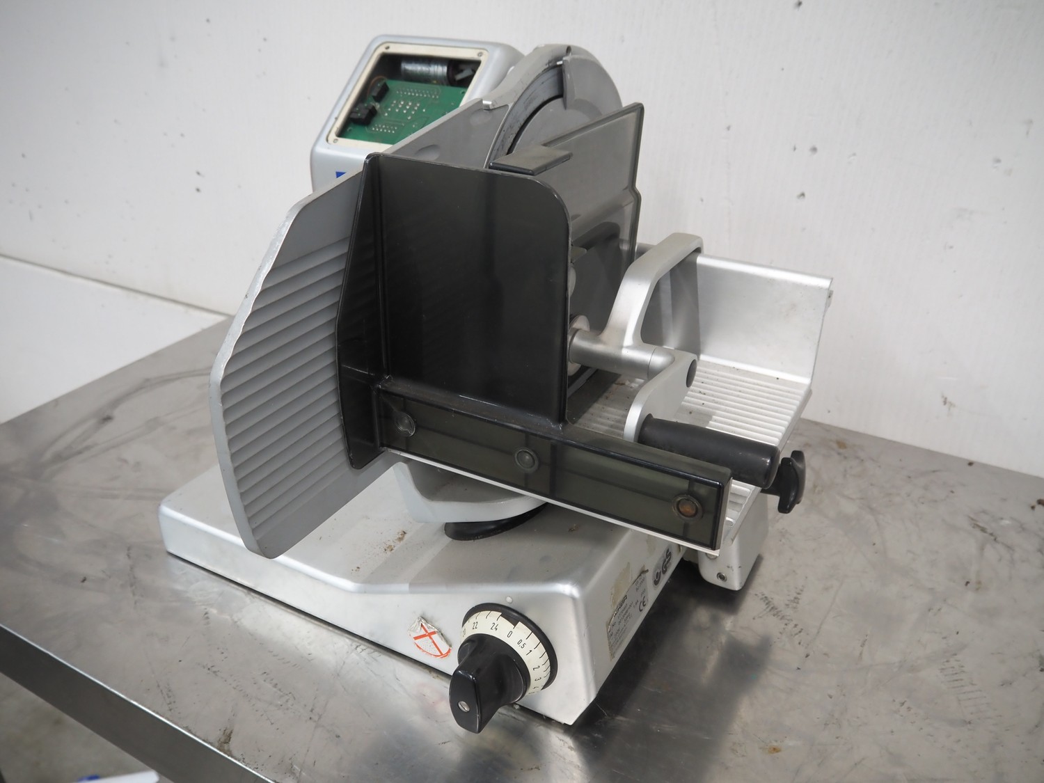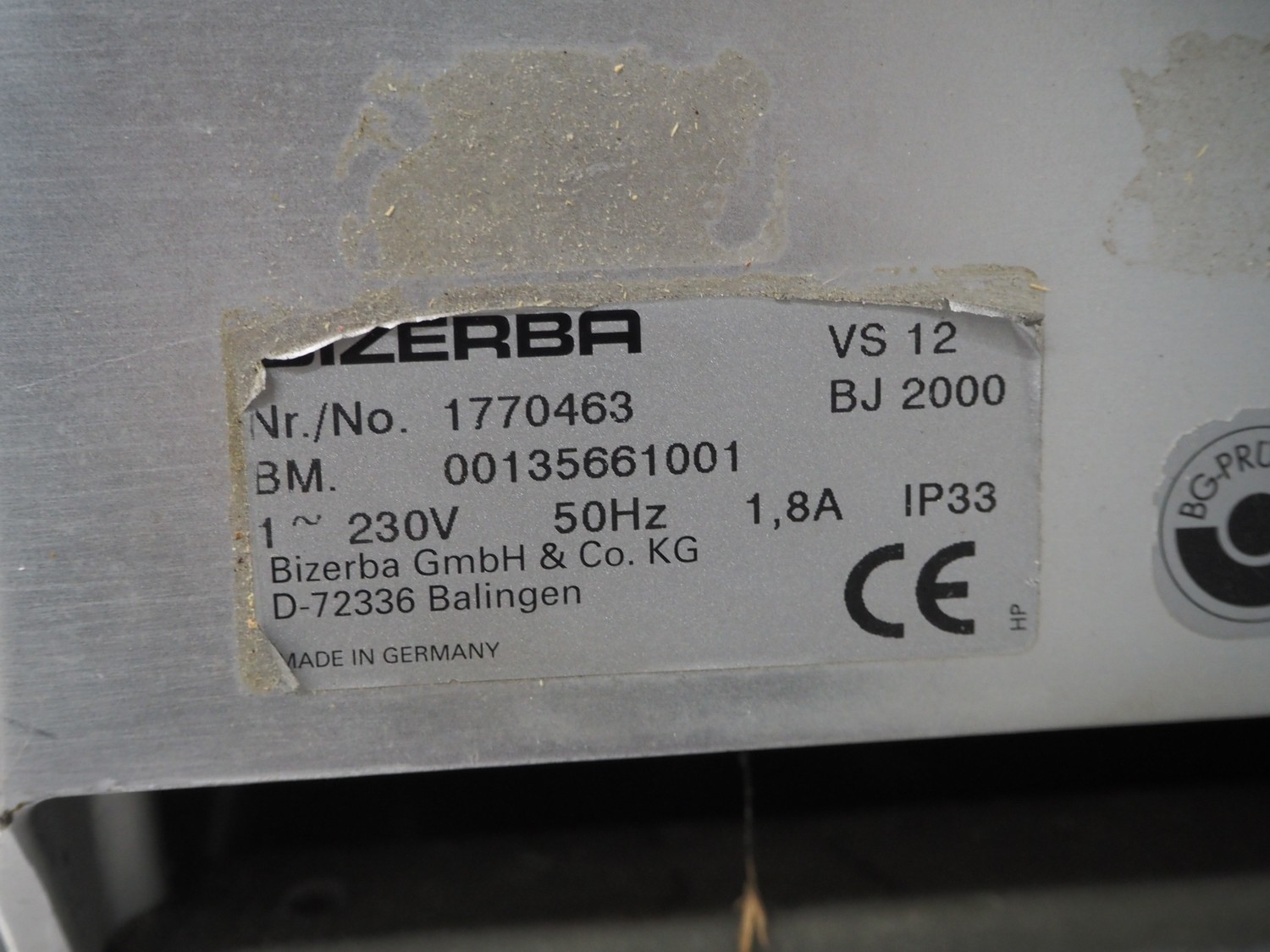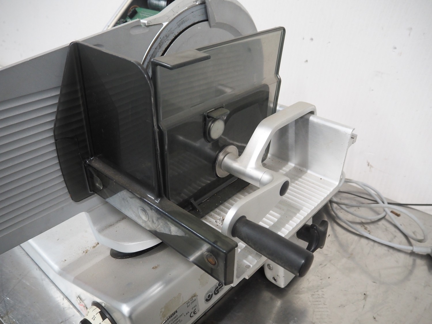 Bizerba slicer, type: VS 12, number: 1770463, year of construction: 2000, 230 V, 1 Ph, 50 Hz, 1.8 A, dimensions: 580 mm x 700 mm x 425 mm. Incomplete.