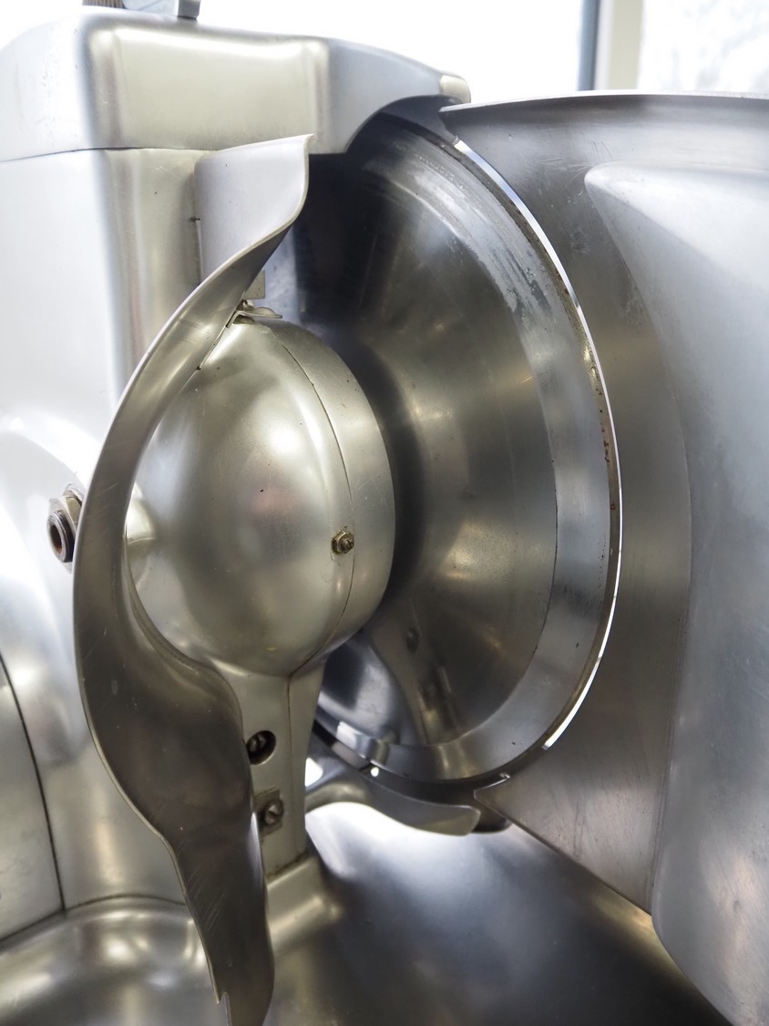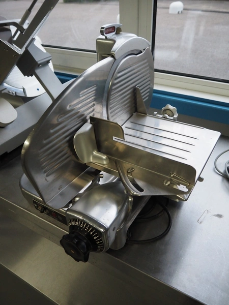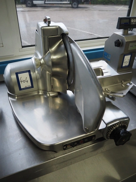 Berkel slicer, model: 834, number: 61514, 220 V, 50 Hz, 220 W, dimensions: 600 mm x 600 mm x 450 mm.
