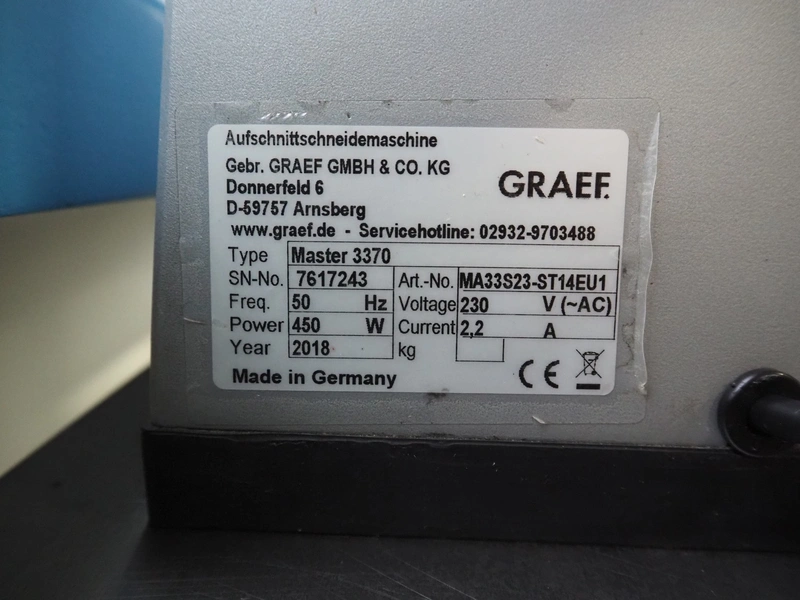 Graef slicer, type: Master 3370, serial number: 7617243, year of construction: 2018, 230 V, 50 Hz, 2.2 A, 450 W, dimensions: 710 mm x 630 mm x 650 mm.