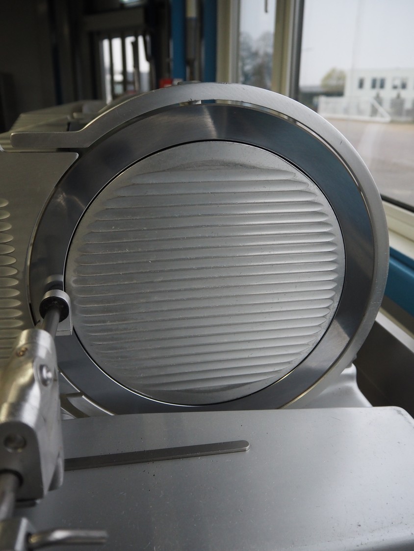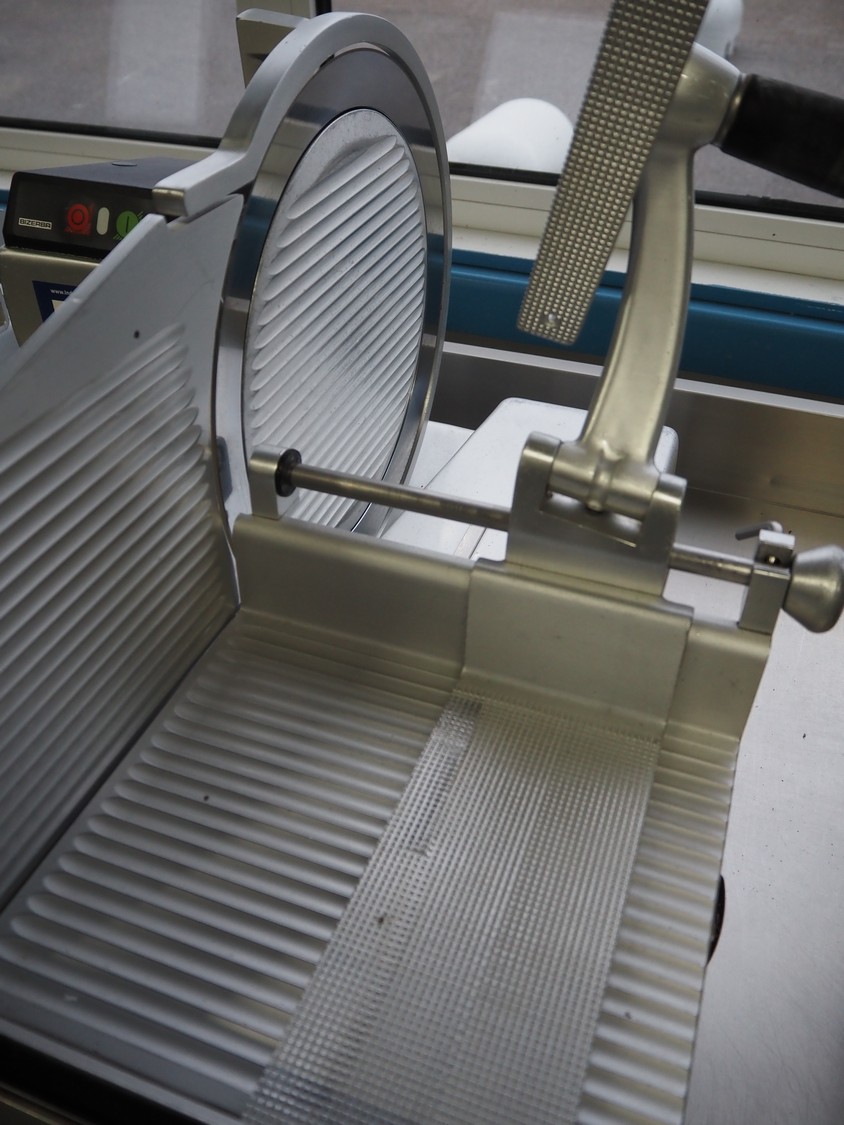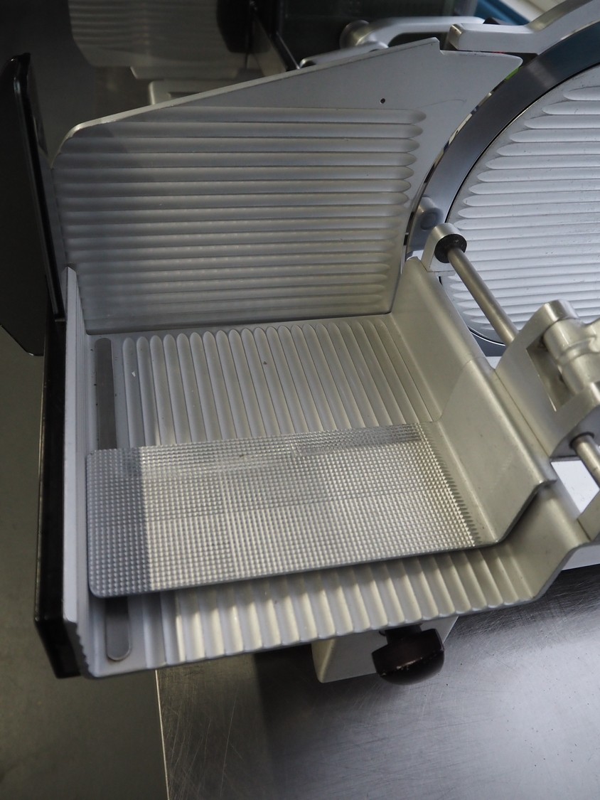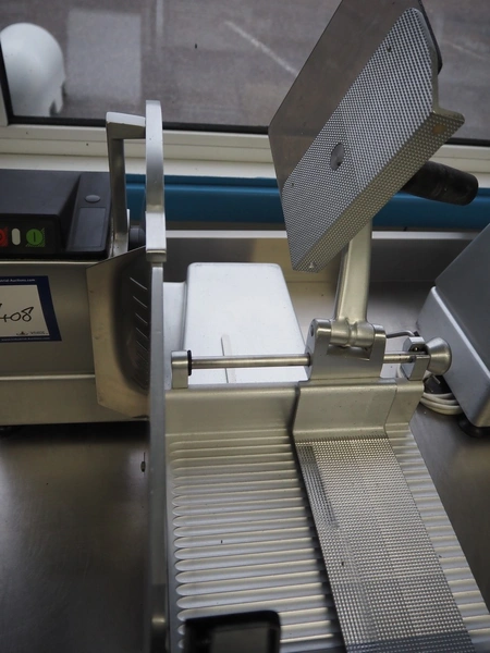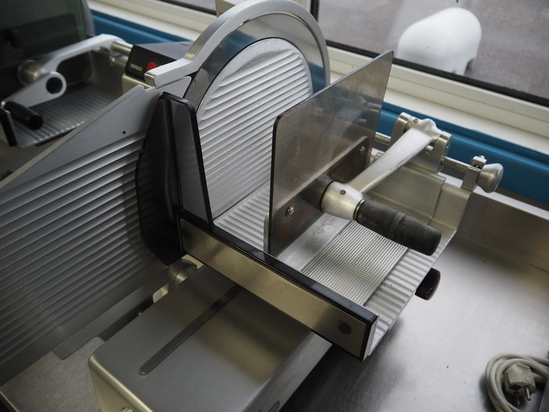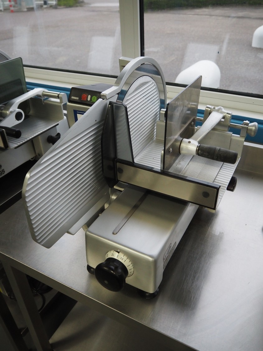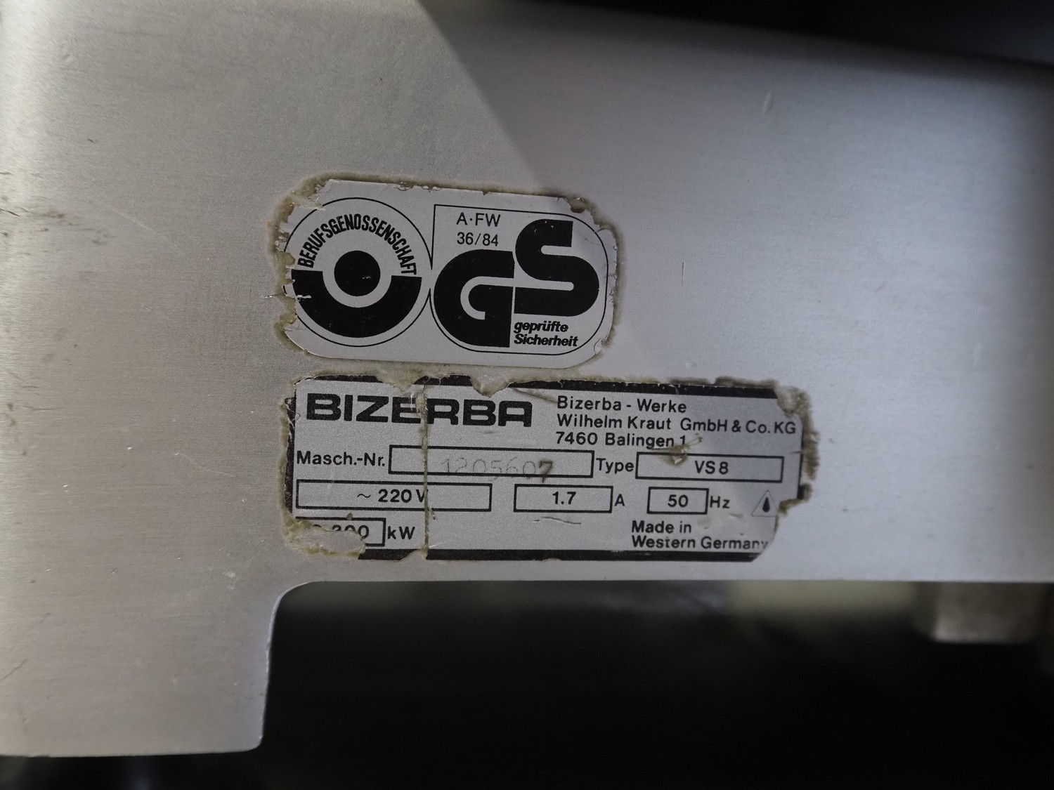 Bizerba slicer, type: VS 8, machine number: 1205607, 220 V, 50 Hz, 1.7 A, 0.3 kW, dimensions: 550 mm x 600 mm x 550 mm.