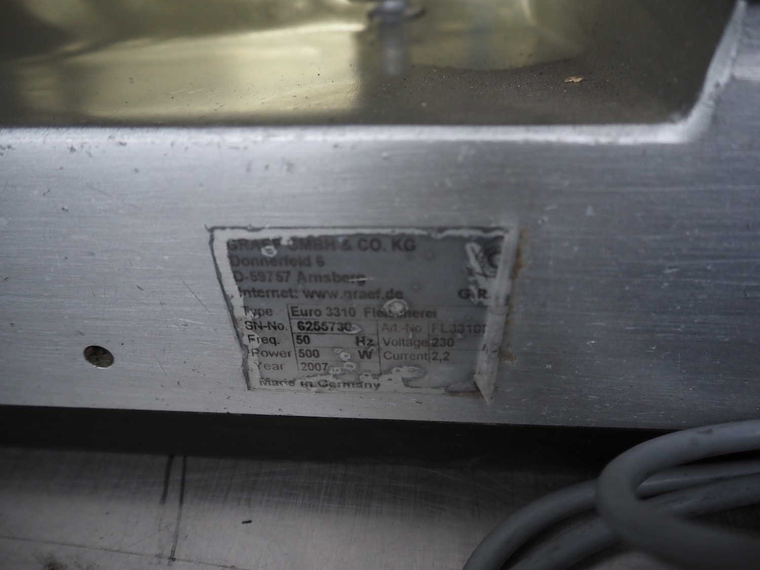 Graef slicer, type: Euro 331, serial number: 6255730, year of construction: 2007, 230 V, 50 Hz, 2.2 A, 500 Watt, dimensions: 650 mm x 700 mm x 450 mm.