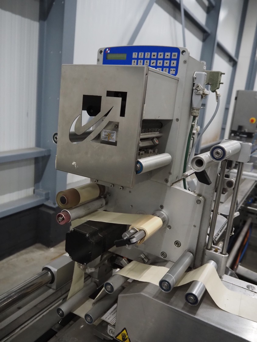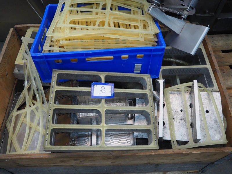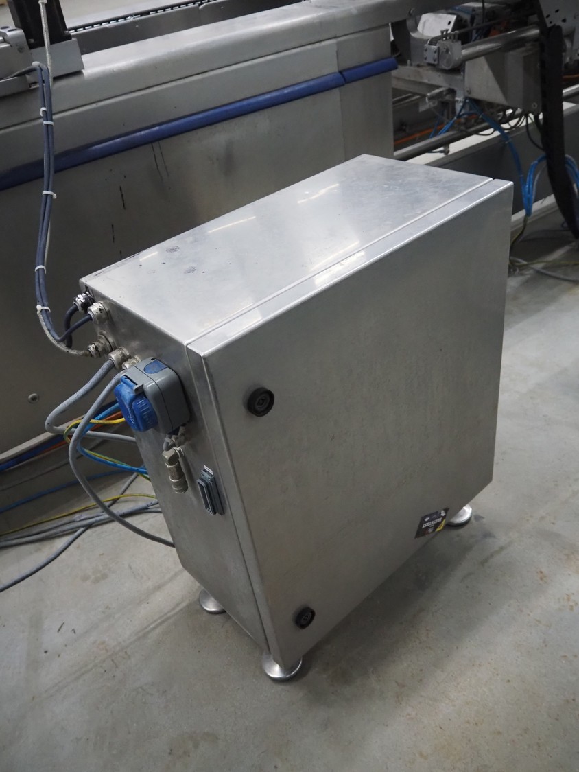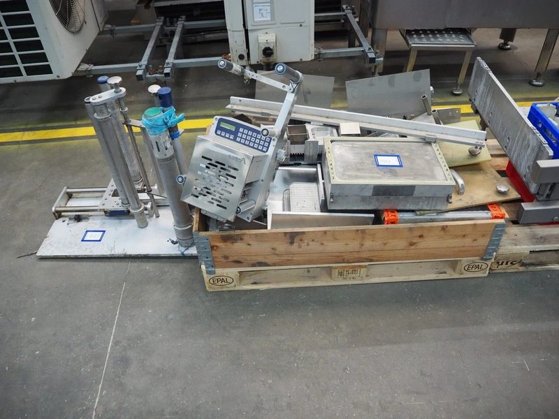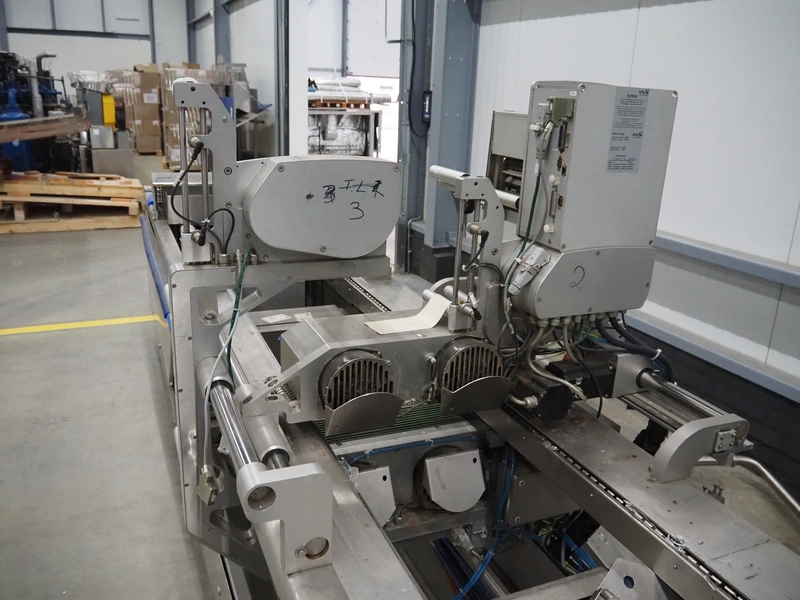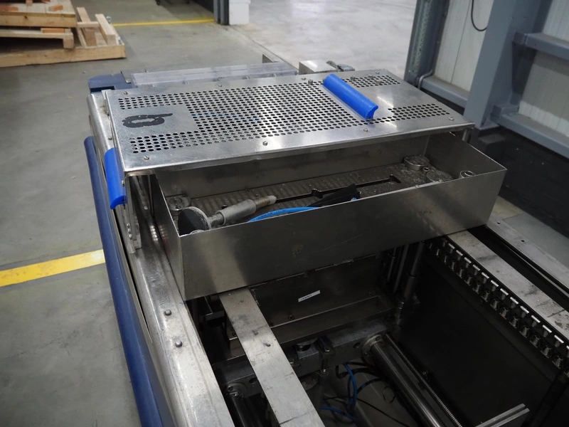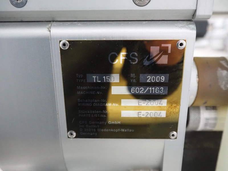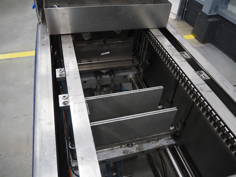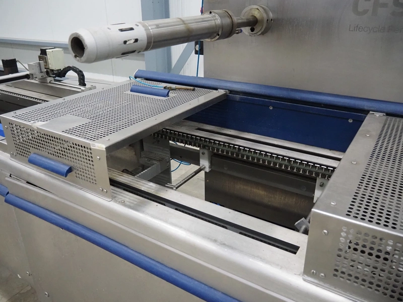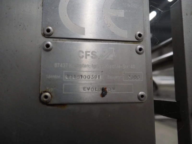 CFS thermoformer, type: EVOLUTION, serial number: 4046100391, year of construction: 2008, 400 V, 3 Ph, 50 Hz, 20 A, 10 kW, film width: 350 mm, dyes: (4x) 300 mm x 90 mm, index: 470 mm, belt width: 430 mm, label width: 85 mm, plastic belt, belt width: 420 mm, total dimensions: 13400 mm x 1300 mm x 2160 mm. Including 5 pallets with machine parts, among others: dyes: (8x) 200 mm x 65 mm, (3x) 255 mm x 130 mm. Transport rollies not included.