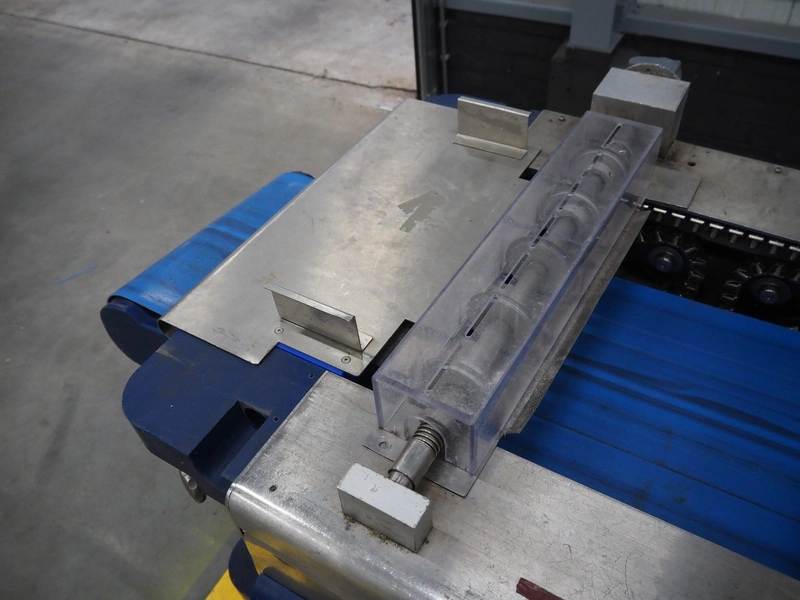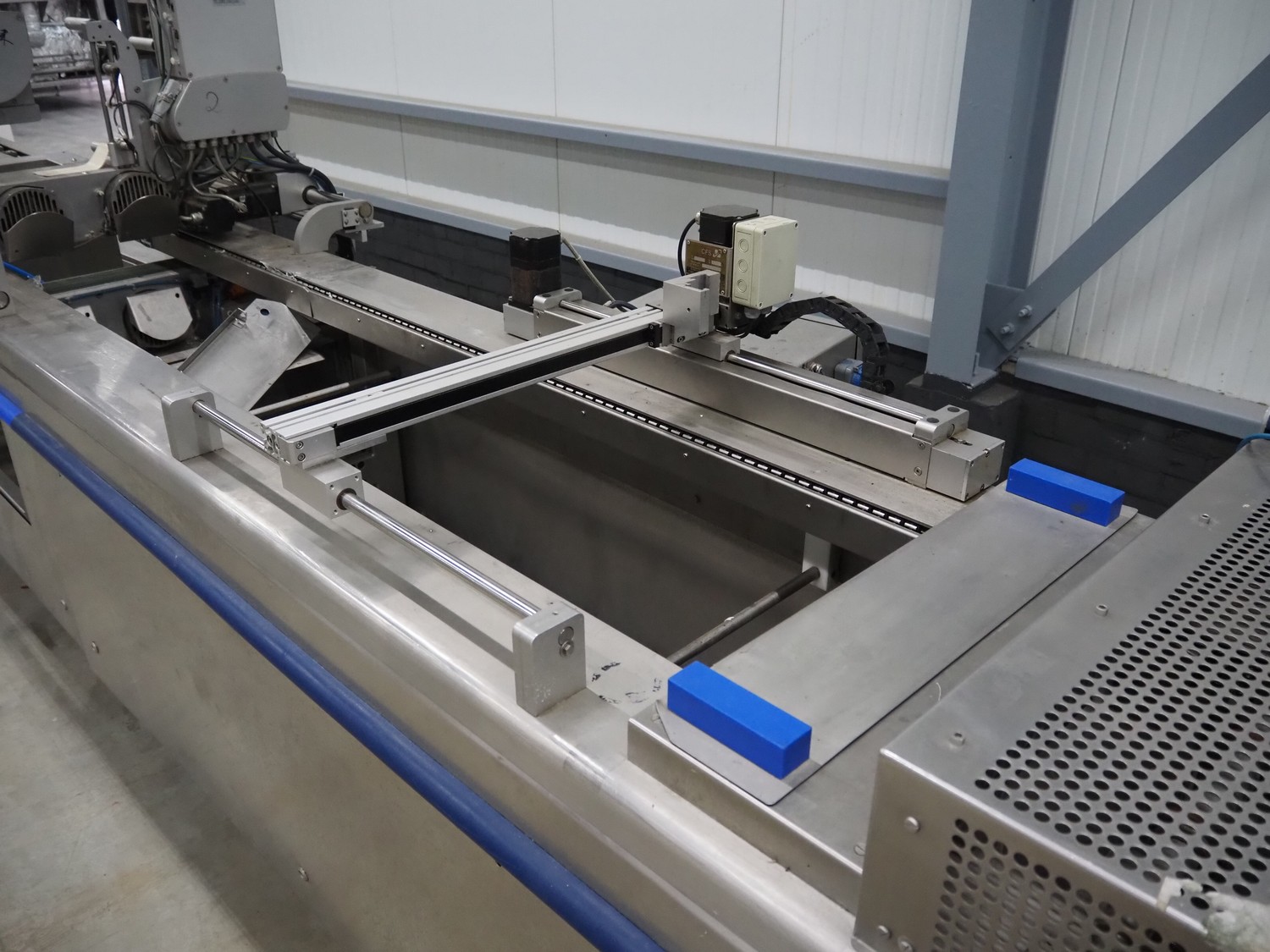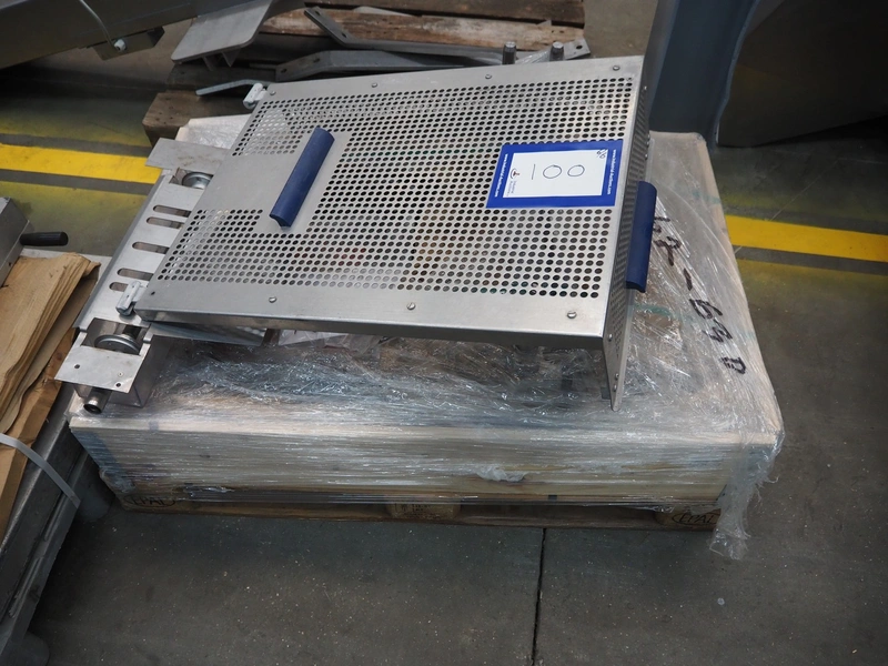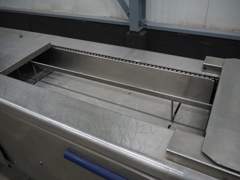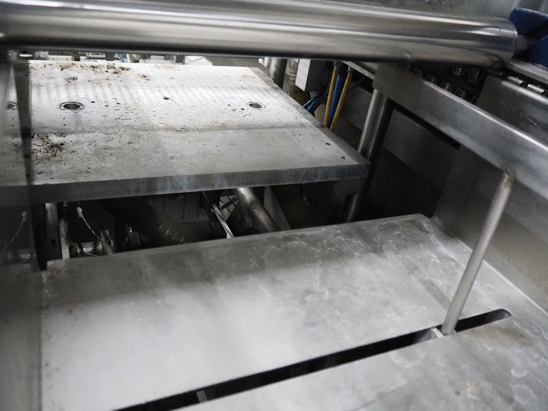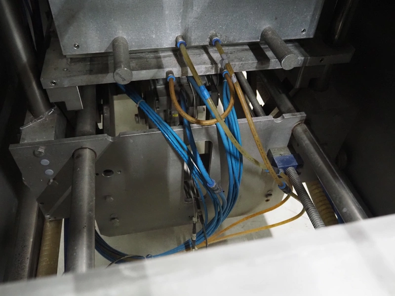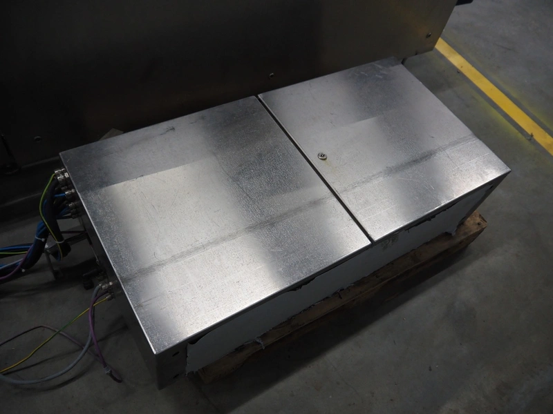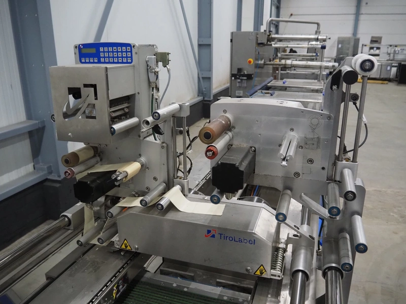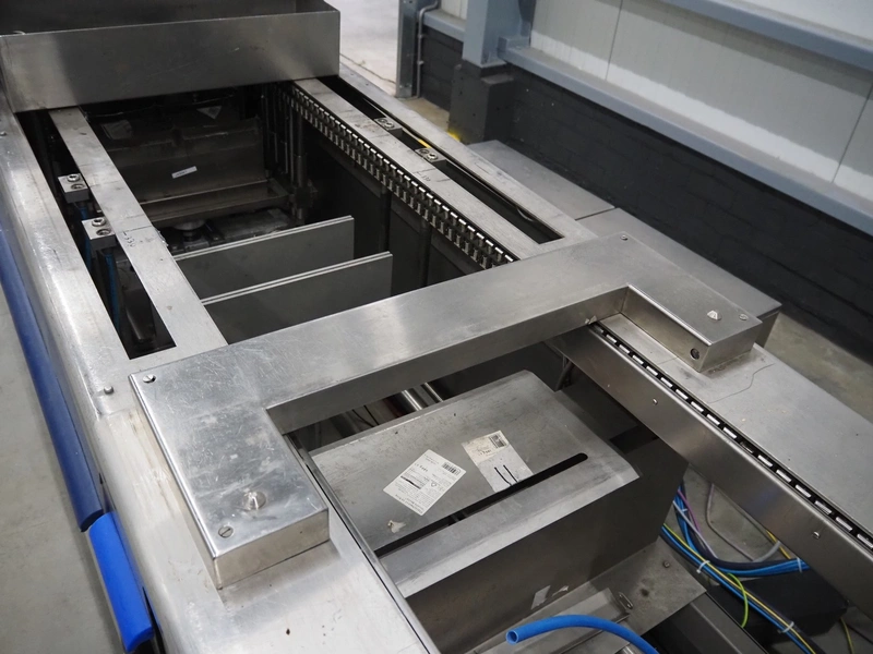 CFS thermoformer, type: EVOLUTION, serial number: 4046100391, year of construction: 2008, 400 V, 3 Ph, 50 Hz, 20 A, 10 kW, film width: 350 mm, dyes: (4x) 300 mm x 90 mm, index: 470 mm, belt width: 430 mm, label width: 85 mm, plastic belt, belt width: 420 mm, total dimensions: 13400 mm x 1300 mm x 2160 mm. Including 5 pallets with machine parts, among others: dyes: (8x) 200 mm x 65 mm, (3x) 255 mm x 130 mm. Transport rollies not included.