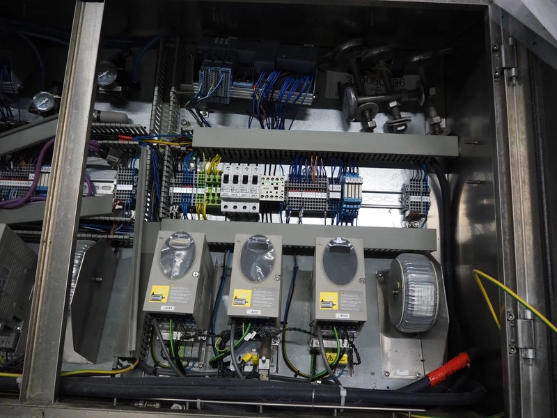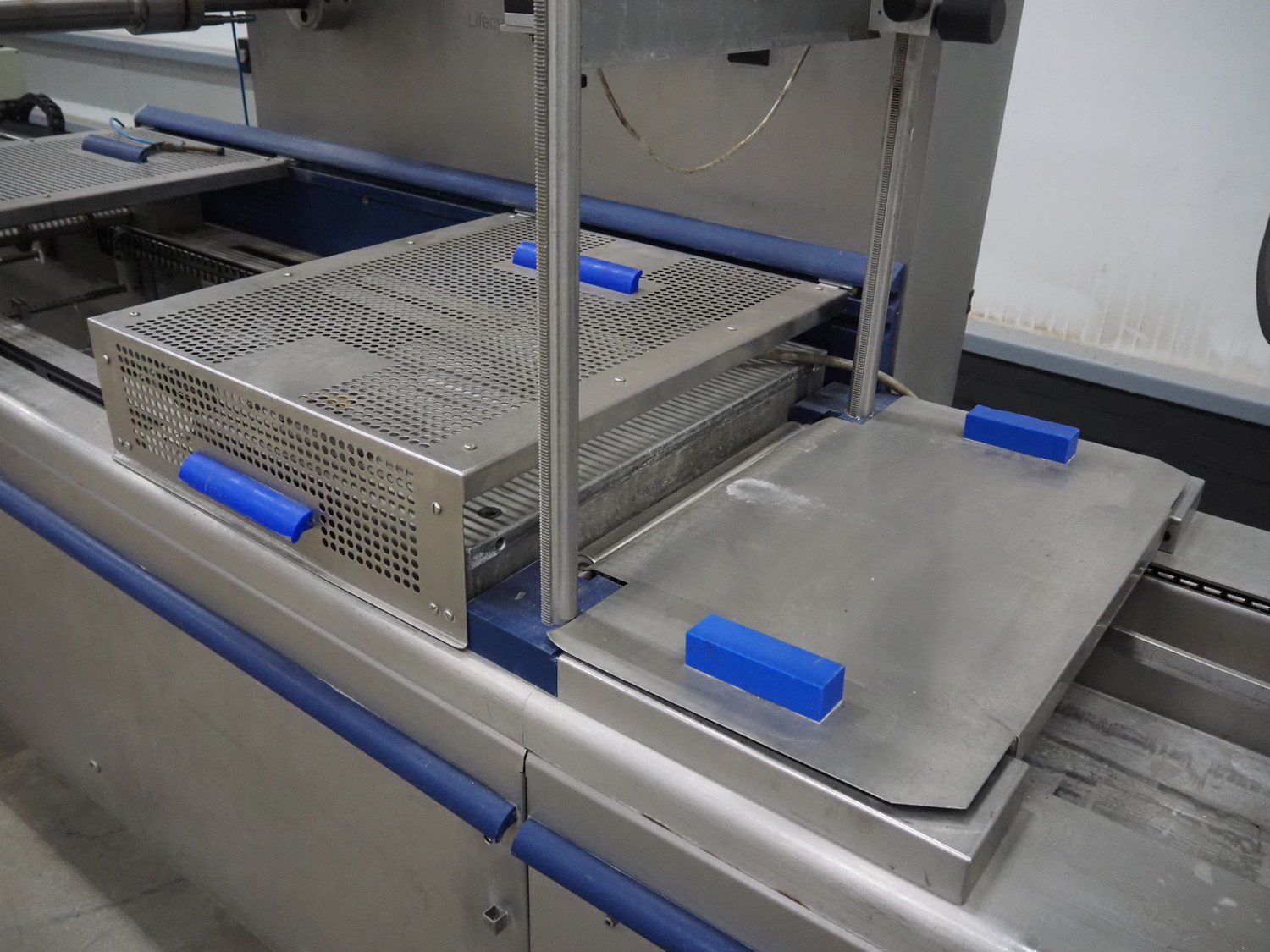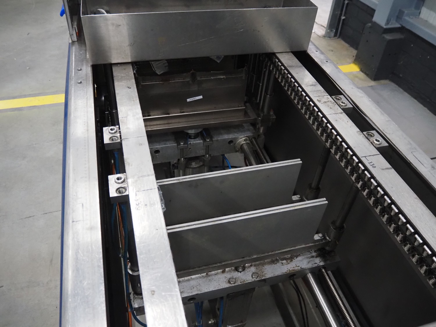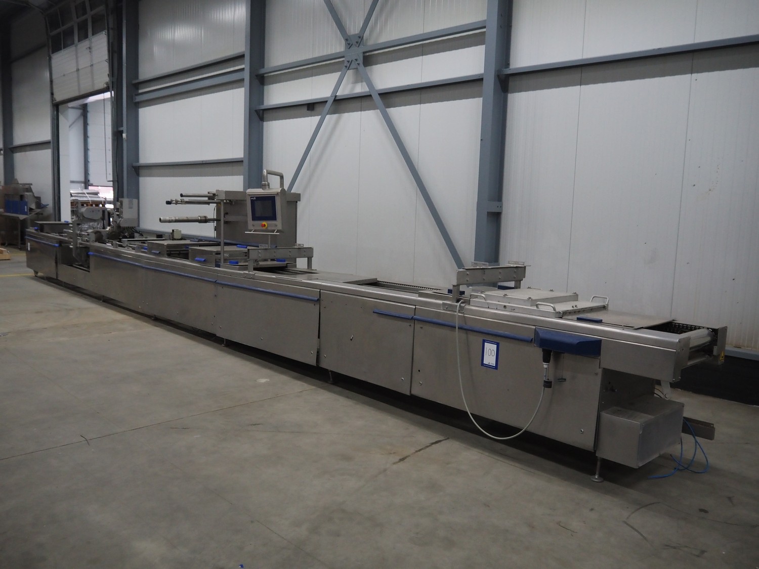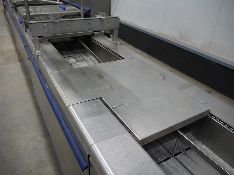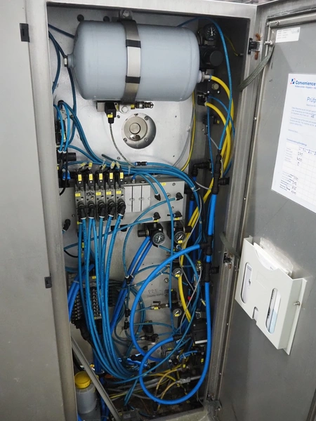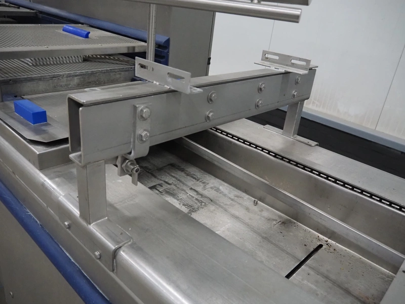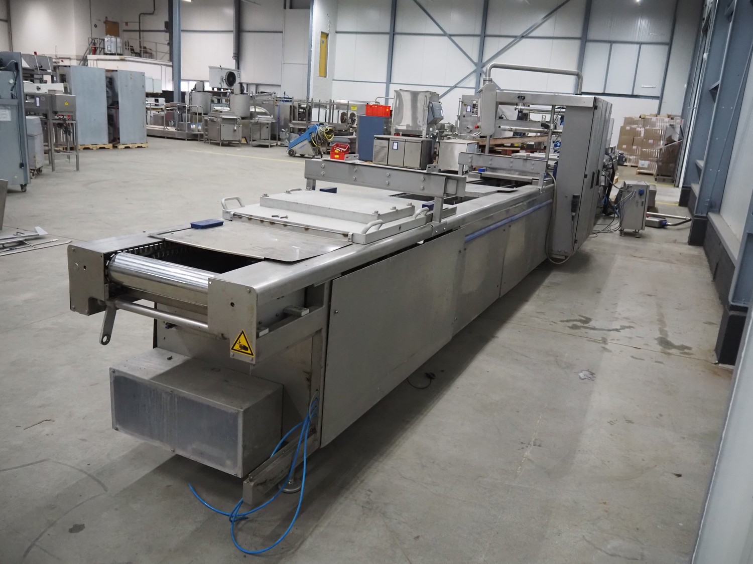 CFS thermoformer, type: EVOLUTION, serial number: 4046100391, year of construction: 2008, 400 V, 3 Ph, 50 Hz, 20 A, 10 kW, film width: 350 mm, dyes: (4x) 300 mm x 90 mm, index: 470 mm, belt width: 430 mm, label width: 85 mm, plastic belt, belt width: 420 mm, total dimensions: 13400 mm x 1300 mm x 2160 mm. Including 5 pallets with machine parts, among others: dyes: (8x) 200 mm x 65 mm, (3x) 255 mm x 130 mm. Transport rollies not included.