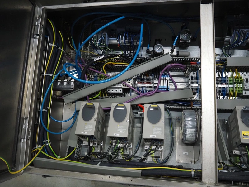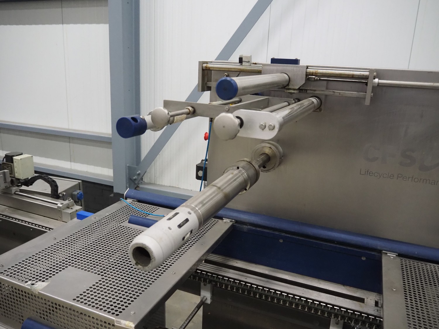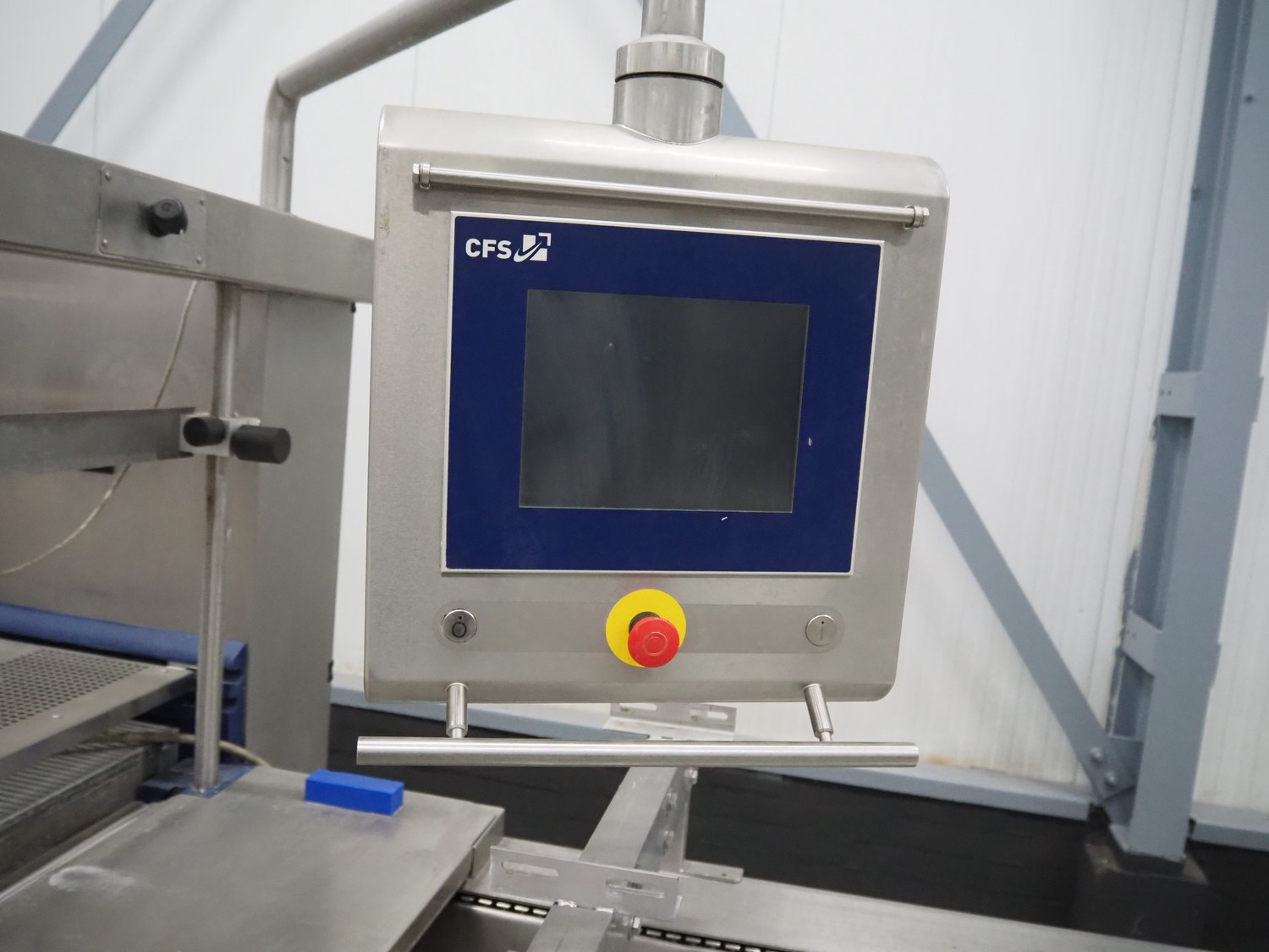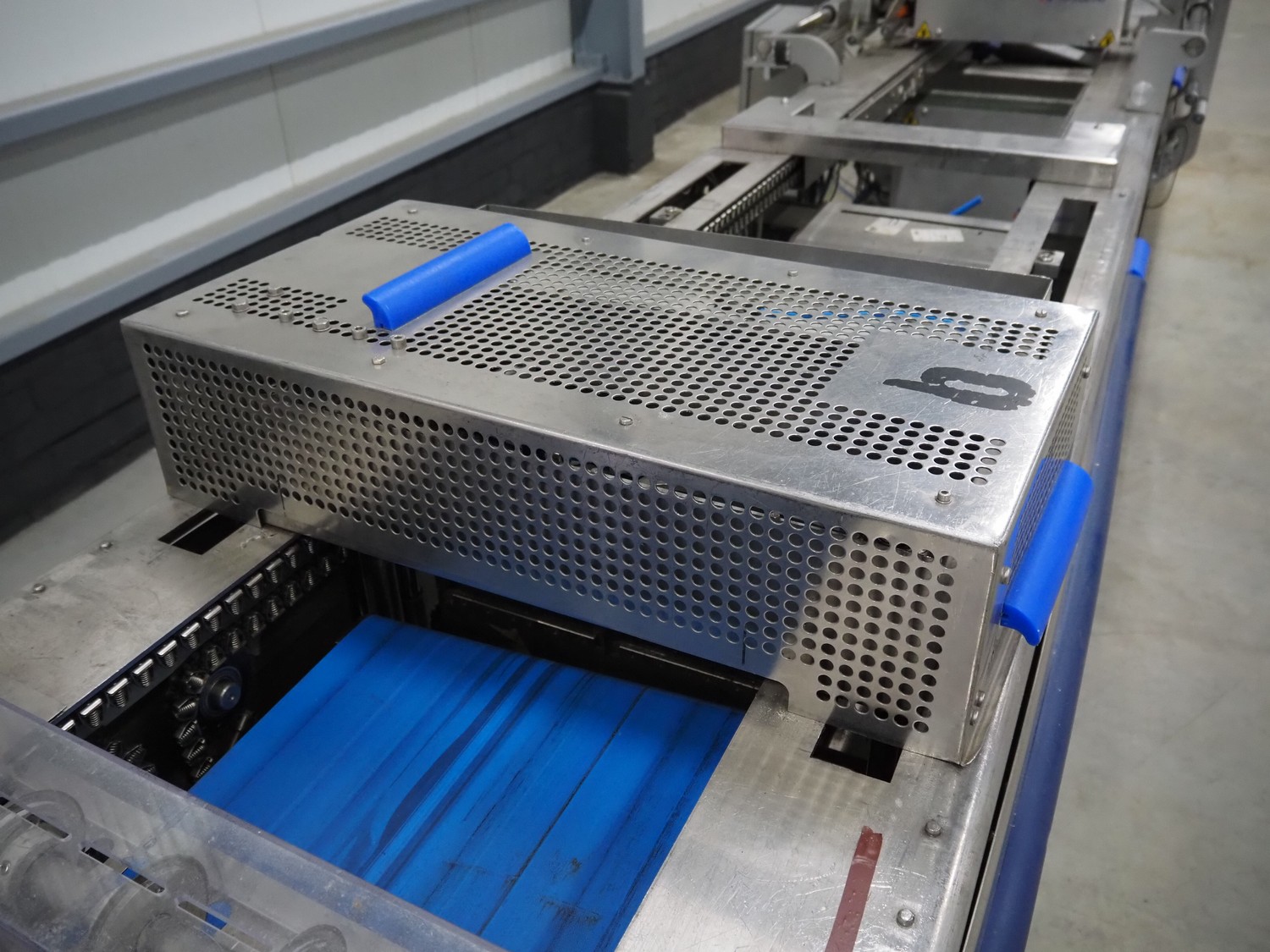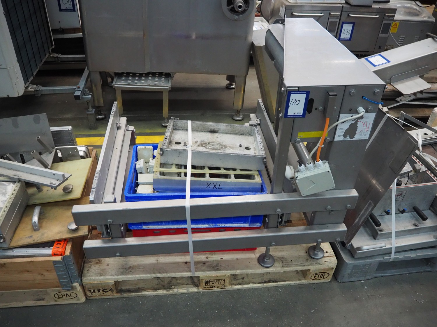 CFS thermoformer, type: EVOLUTION, serial number: 4046100391, year of construction: 2008, 400 V, 3 Ph, 50 Hz, 20 A, 10 kW, film width: 350 mm, dyes: (4x) 300 mm x 90 mm, index: 470 mm, belt width: 430 mm, label width: 85 mm, plastic belt, belt width: 420 mm, total dimensions: 13400 mm x 1300 mm x 2160 mm. Including 5 pallets with machine parts, among others: dyes: (8x) 200 mm x 65 mm, (3x) 255 mm x 130 mm. Transport rollies not included.