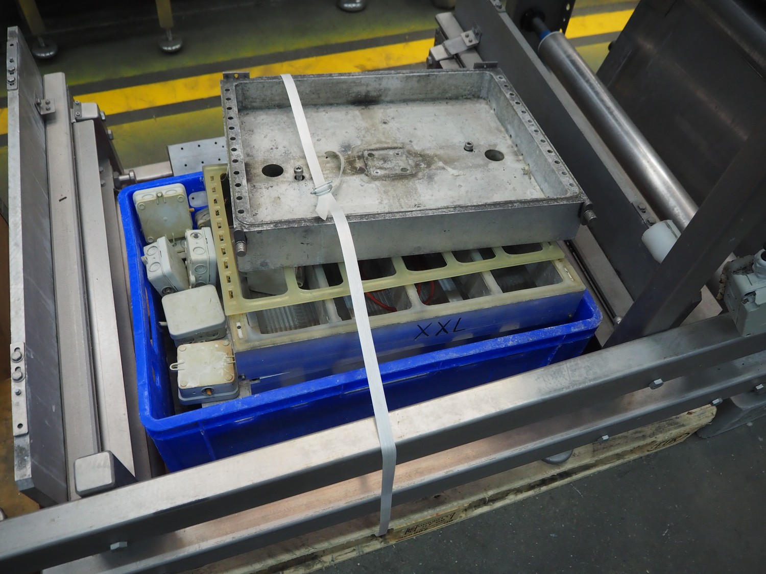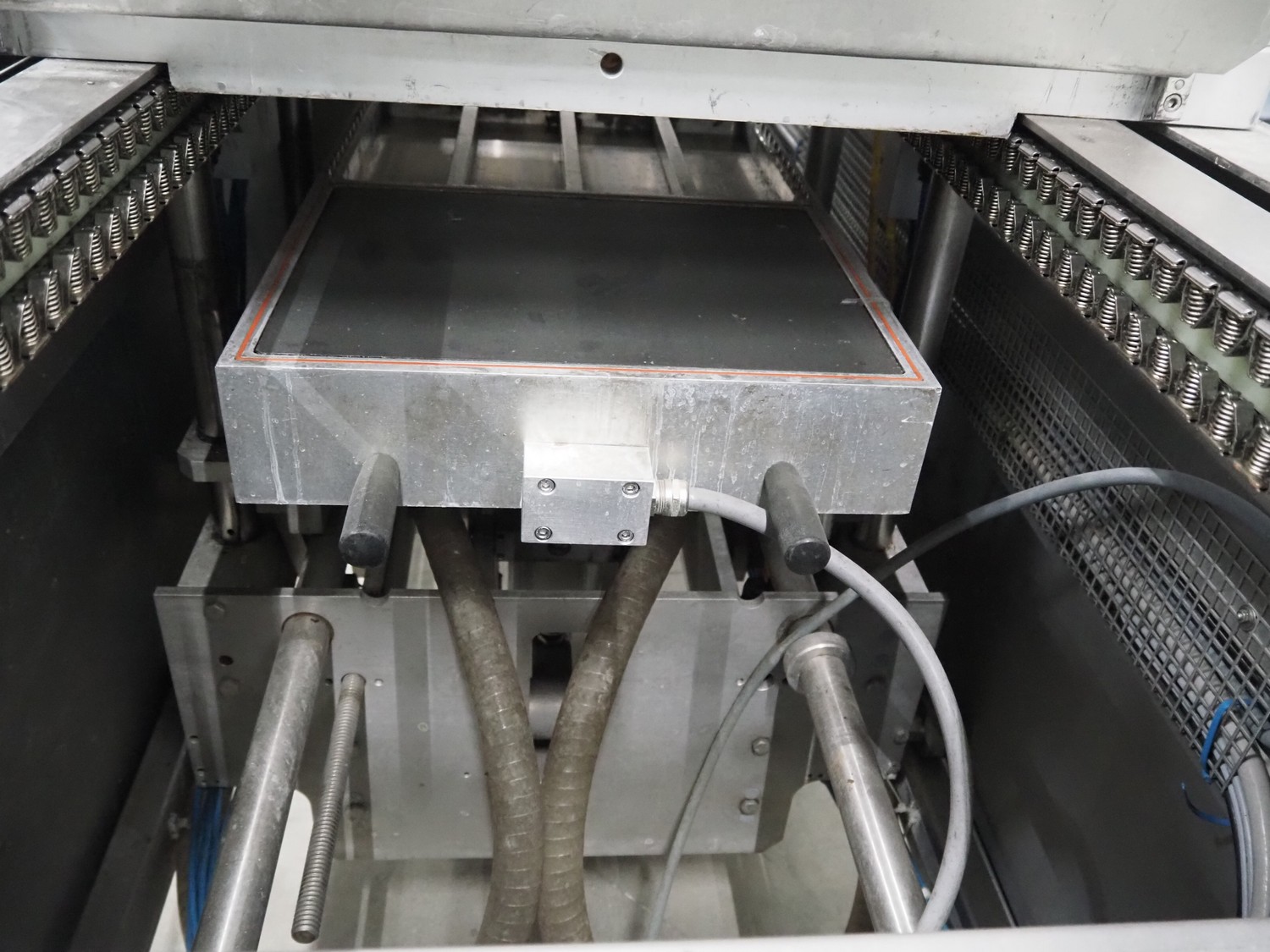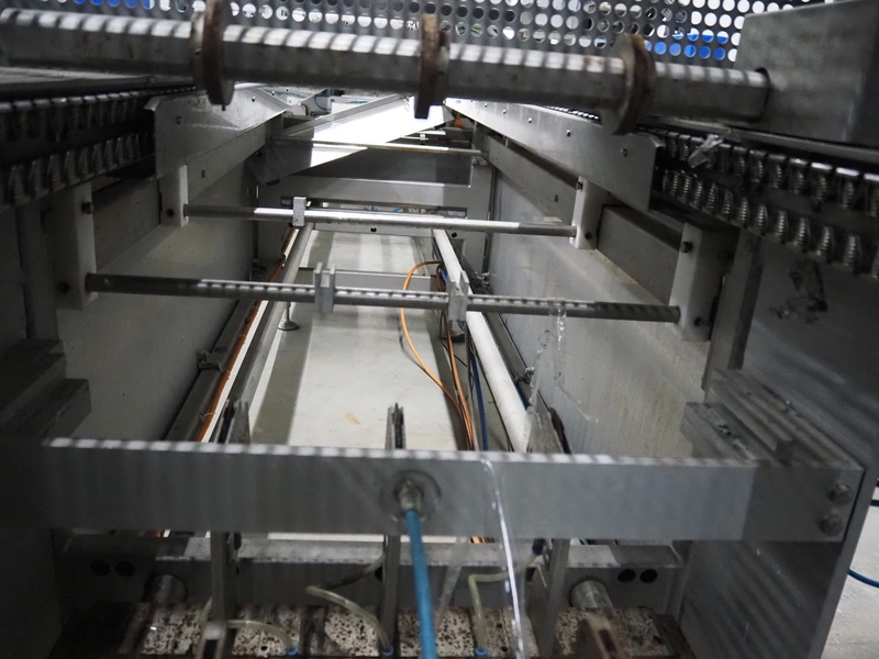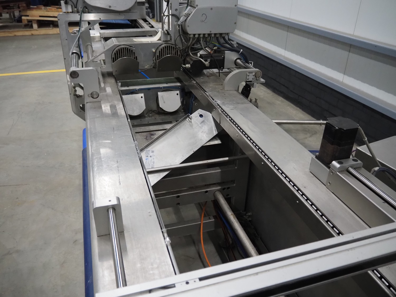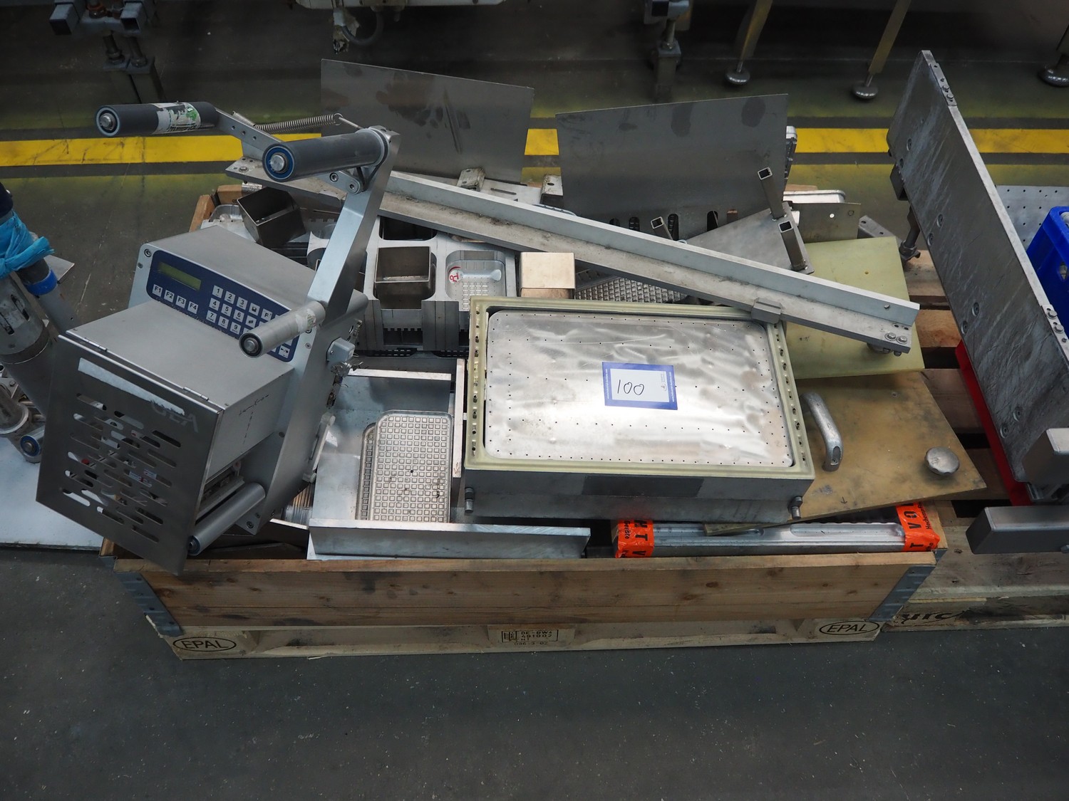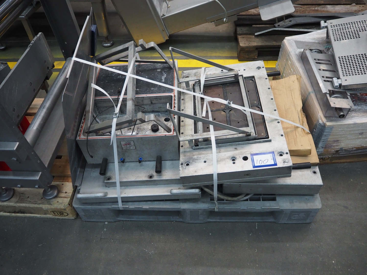 CFS thermoformer, type: EVOLUTION, serial number: 4046100391, year of construction: 2008, 400 V, 3 Ph, 50 Hz, 20 A, 10 kW, film width: 350 mm, dyes: (4x) 300 mm x 90 mm, index: 470 mm, belt width: 430 mm, label width: 85 mm, plastic belt, belt width: 420 mm, total dimensions: 13400 mm x 1300 mm x 2160 mm. Including 5 pallets with machine parts, among others: dyes: (8x) 200 mm x 65 mm, (3x) 255 mm x 130 mm. Transport rollies not included.
