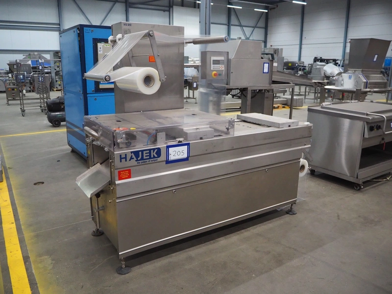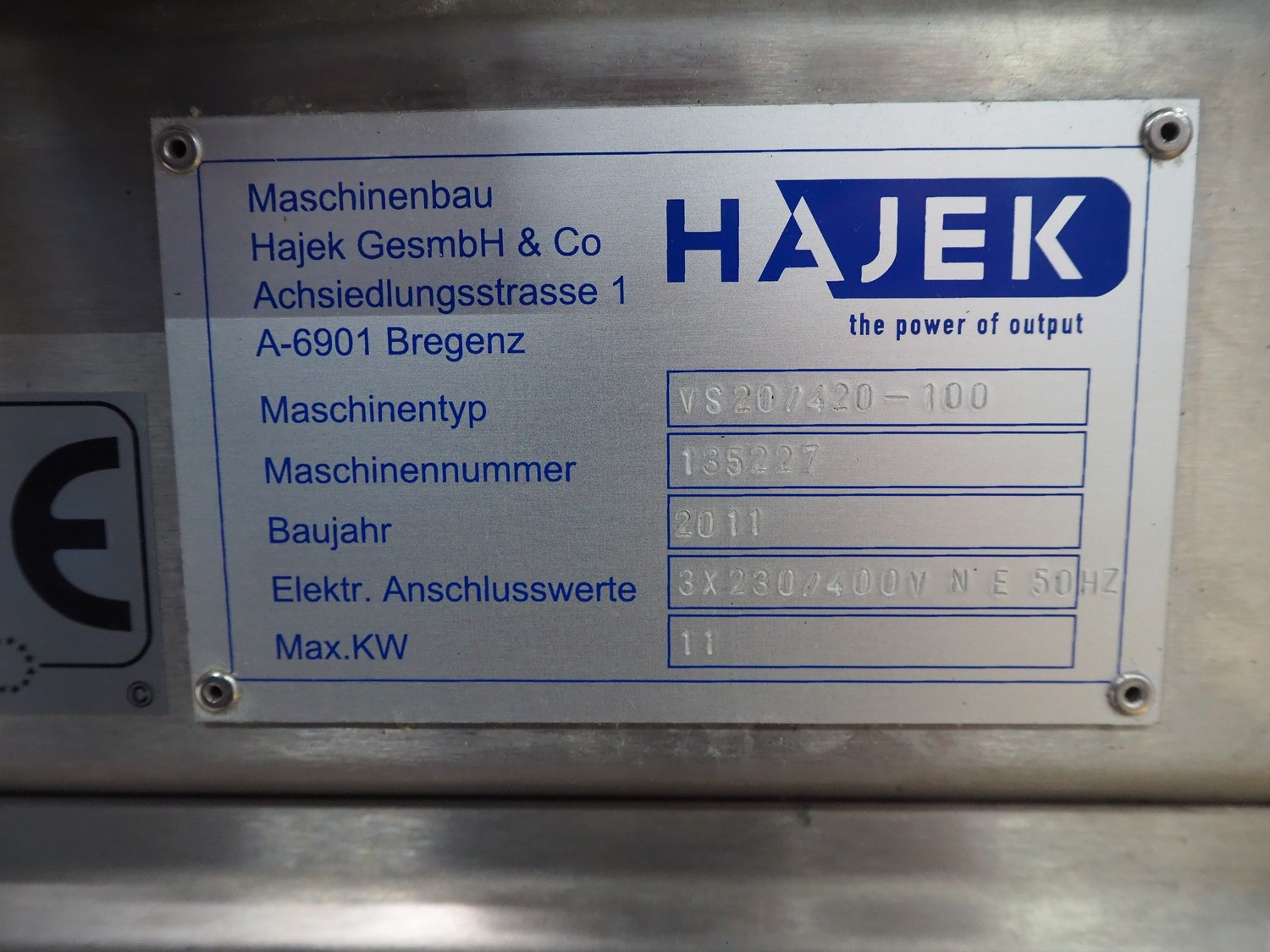 Hajek thermoformer, type: VS20/420-100, number: 135227, year of construction: 2011, 230/400 V, 3 Ph, 50 Hz, 11 kW, film width: 420 mm, dyes: 180 m x 180 mm, total dimensions: 2320 mm x 960 mm x 1770 mm.