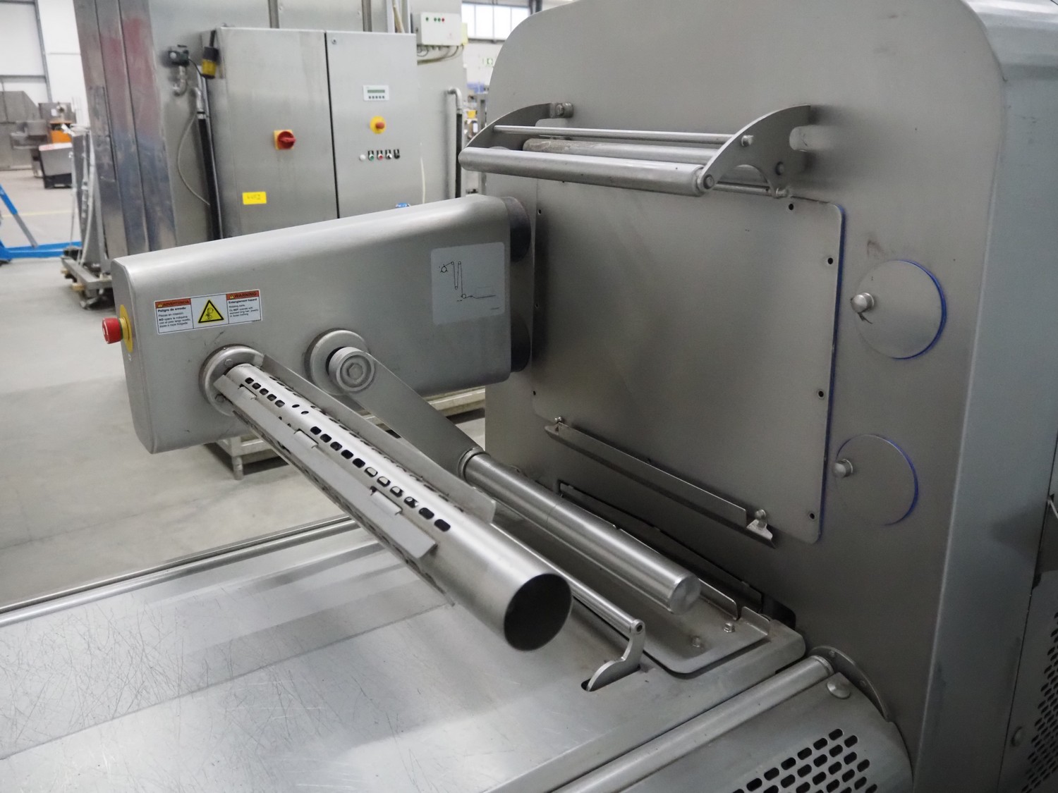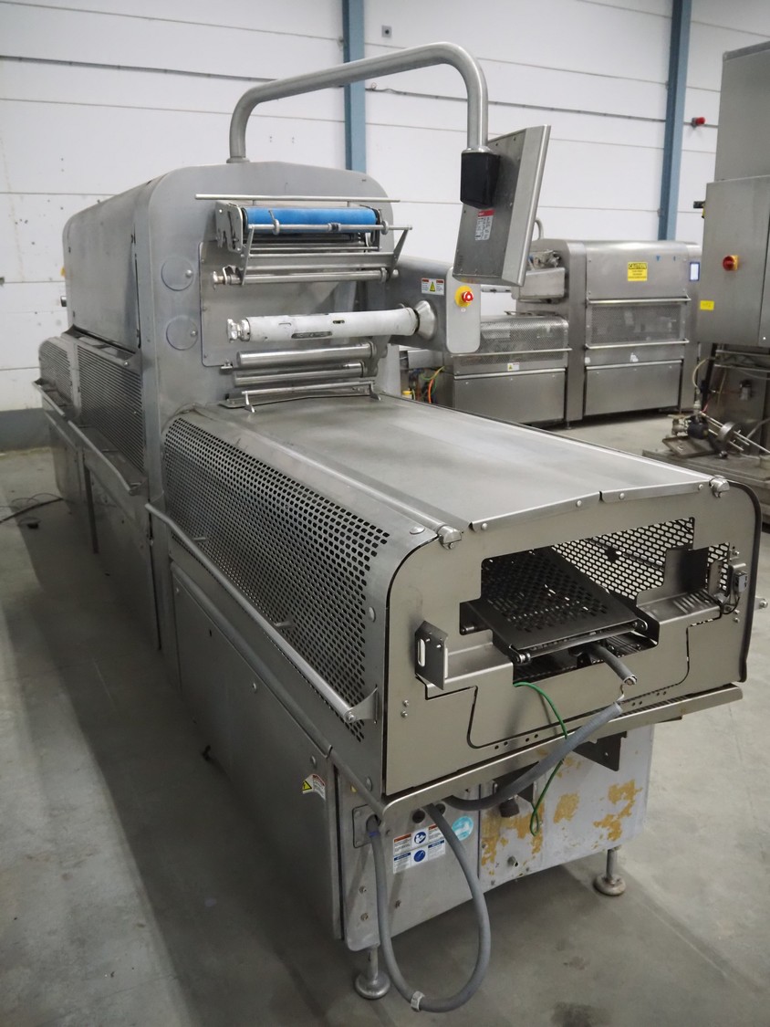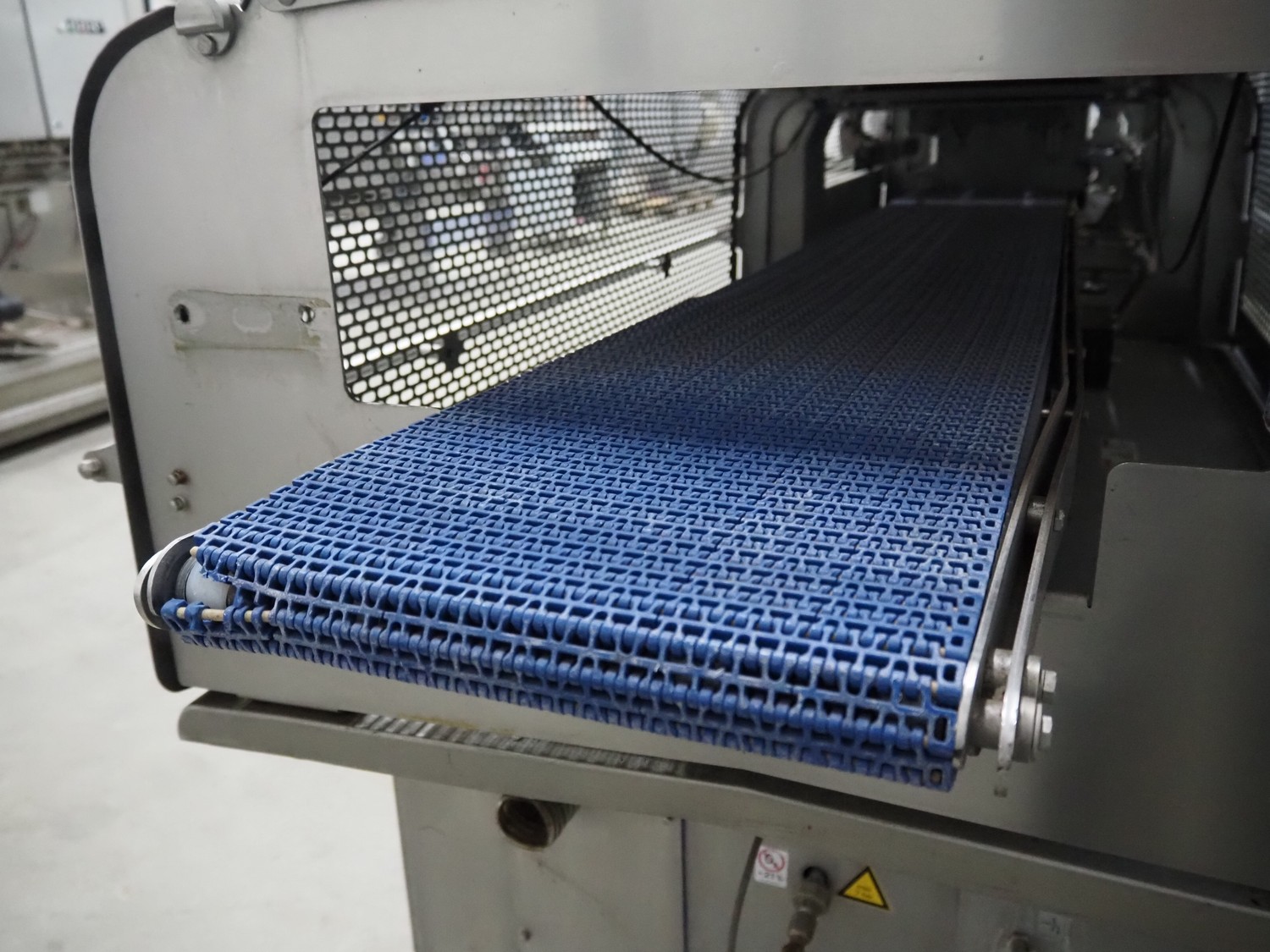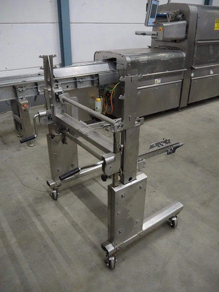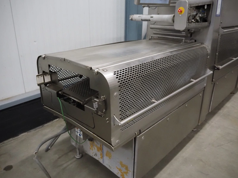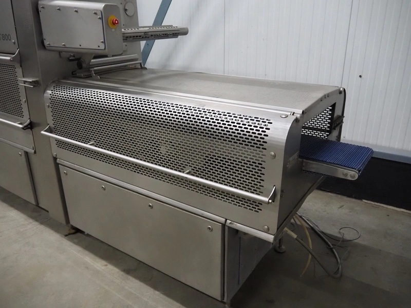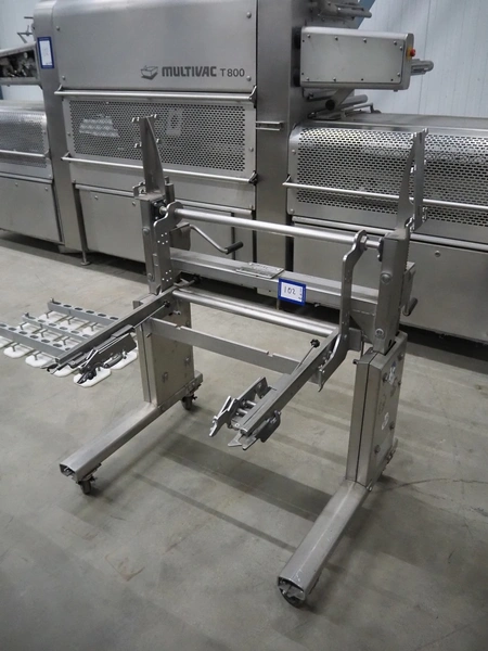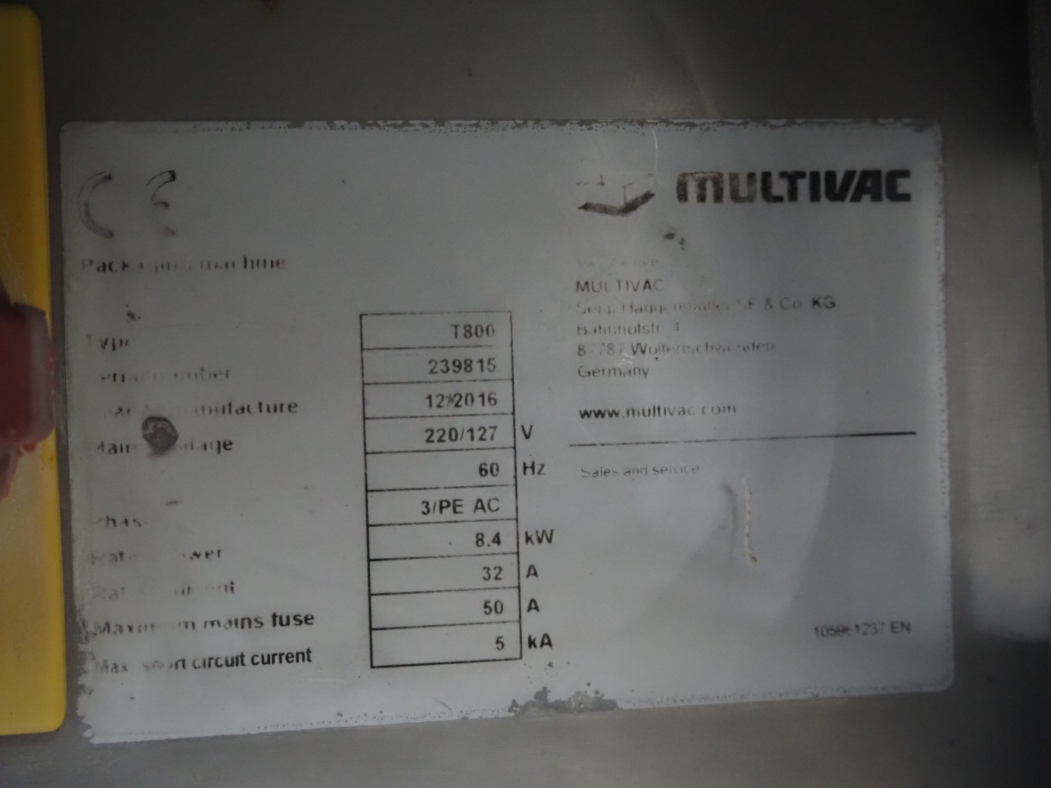 Multivac traysealer, model: T 800, serial number: 239815, year of construction: 12-2016, 220/127 V, 3 Ph, 60 Hz, 32/50 A, 8.4 kW, plastic mesh belt, belt width: 300 mm, clearance: 500 mm x 170 mm, film width: 520 mm, total dimensions: 5400 mm x 1020 mm x 2100 mm. Including trolley with dye, dye: (5x) 190 mm x 130 mm, dimensions trolley: 1050 mm x 1050 mm x 1320 mm.