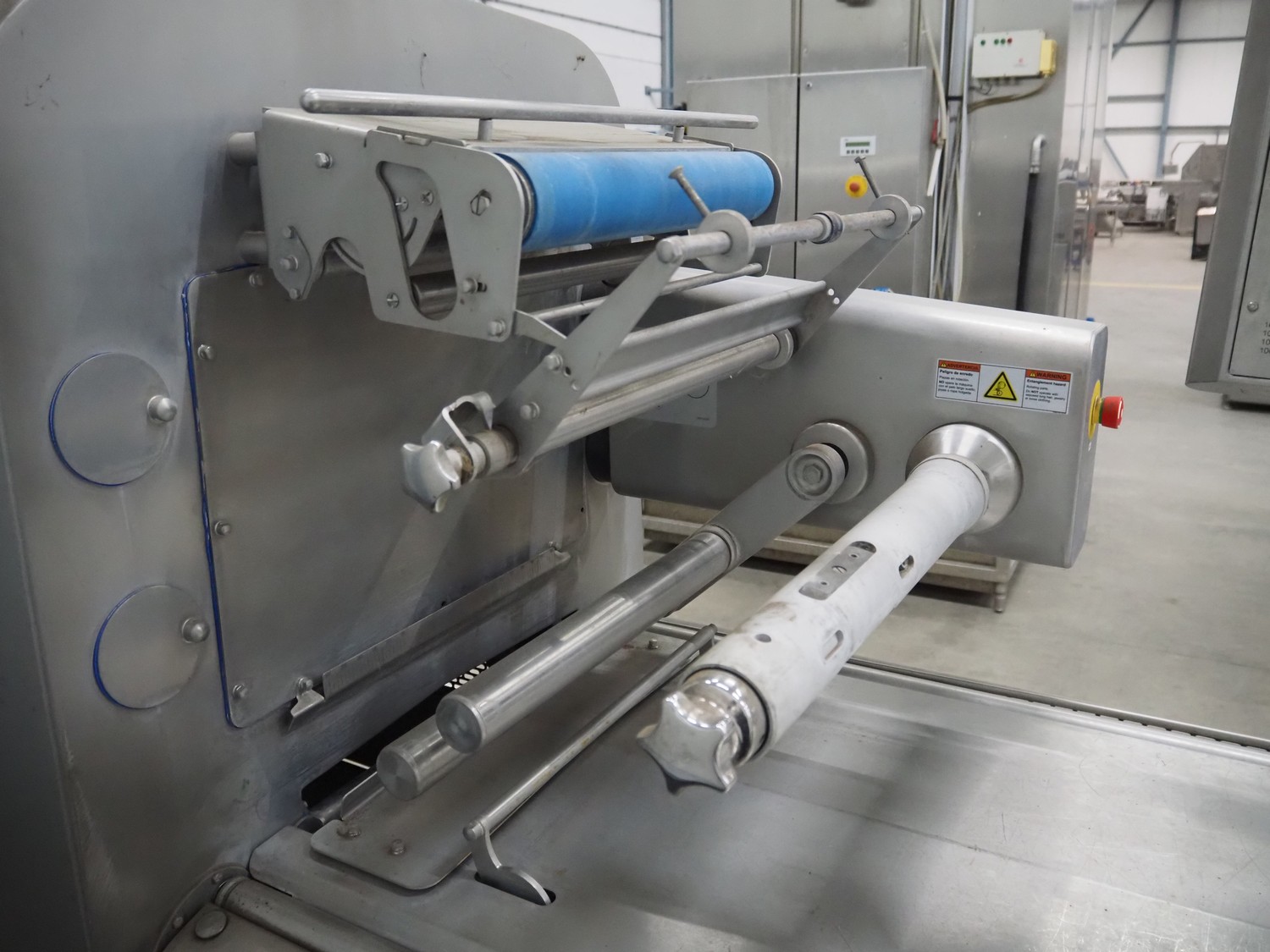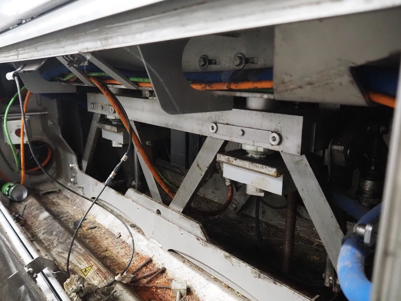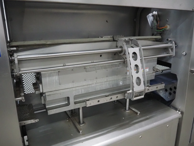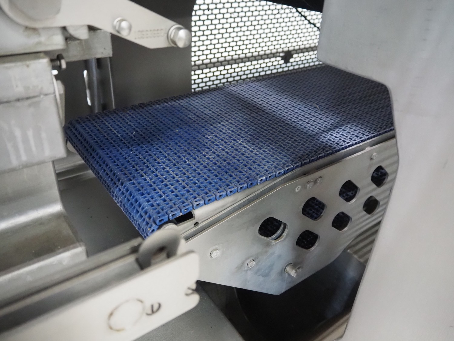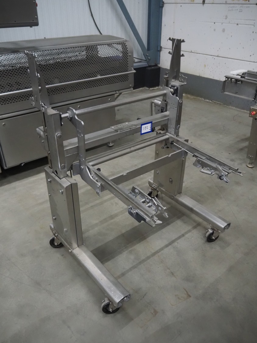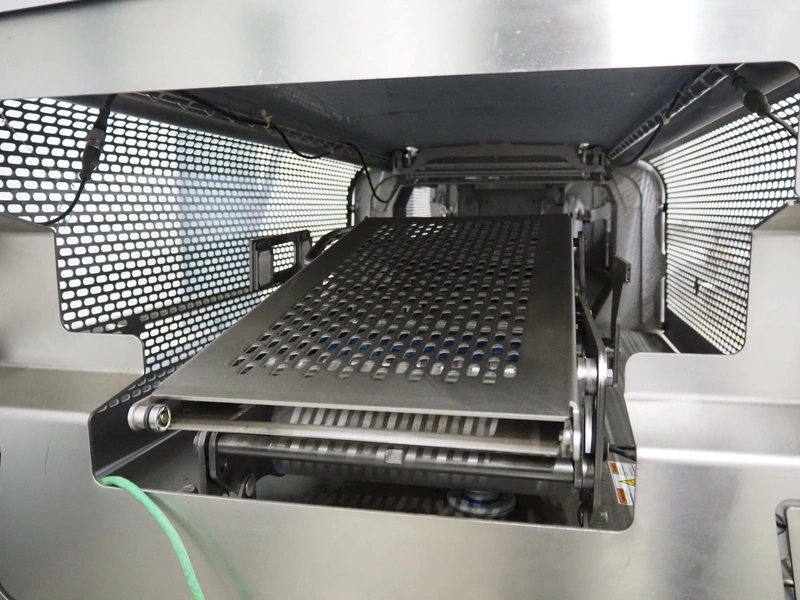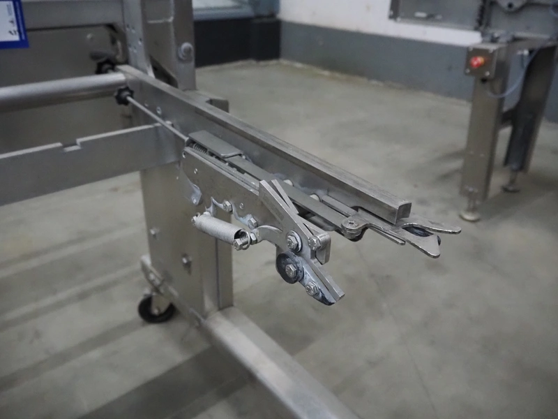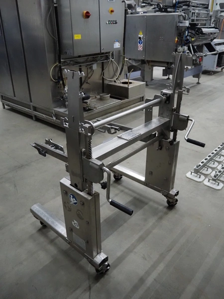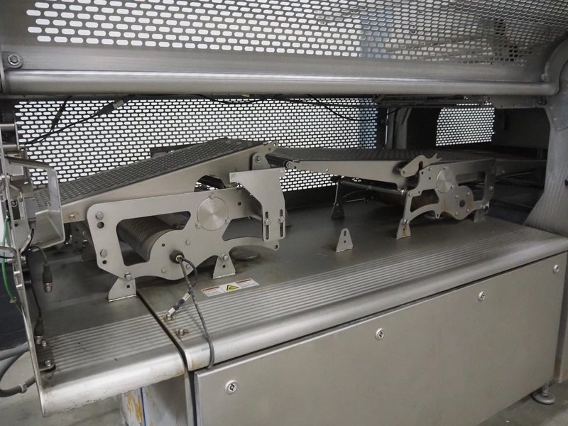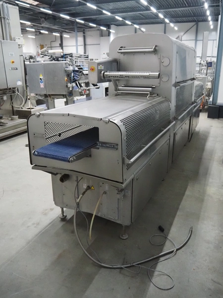 Multivac traysealer, model: T 800, serial number: 239815, year of construction: 12-2016, 220/127 V, 3 Ph, 60 Hz, 32/50 A, 8.4 kW, plastic mesh belt, belt width: 300 mm, clearance: 500 mm x 170 mm, film width: 520 mm, total dimensions: 5400 mm x 1020 mm x 2100 mm. Including trolley with dye, dye: (5x) 190 mm x 130 mm, dimensions trolley: 1050 mm x 1050 mm x 1320 mm.