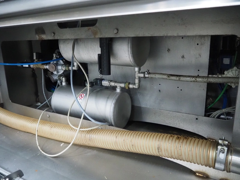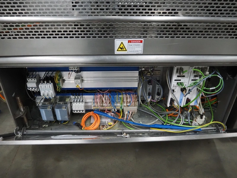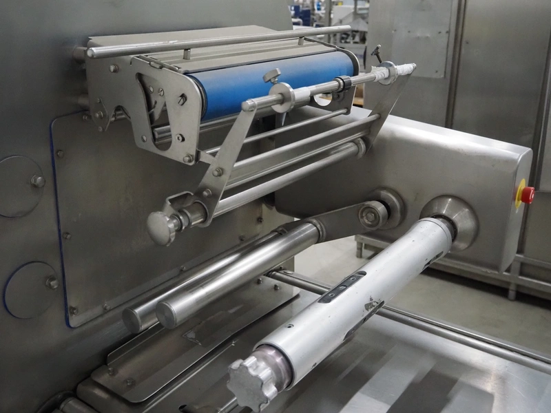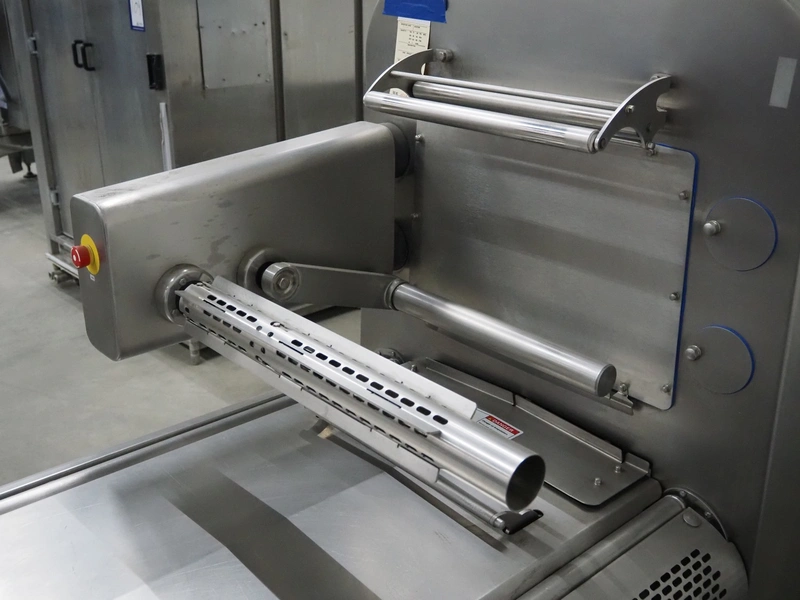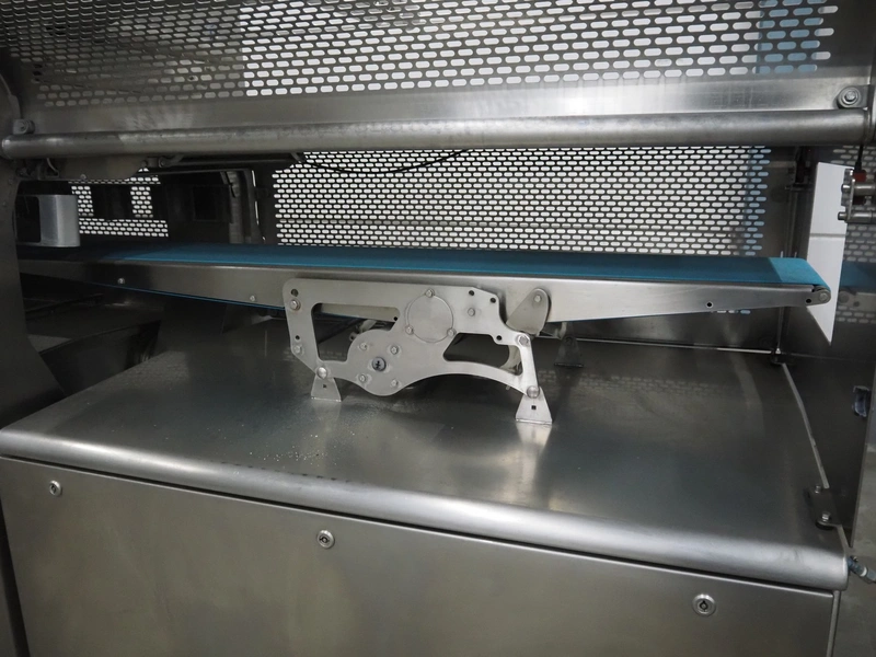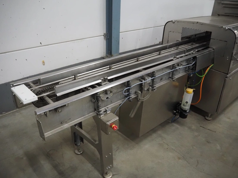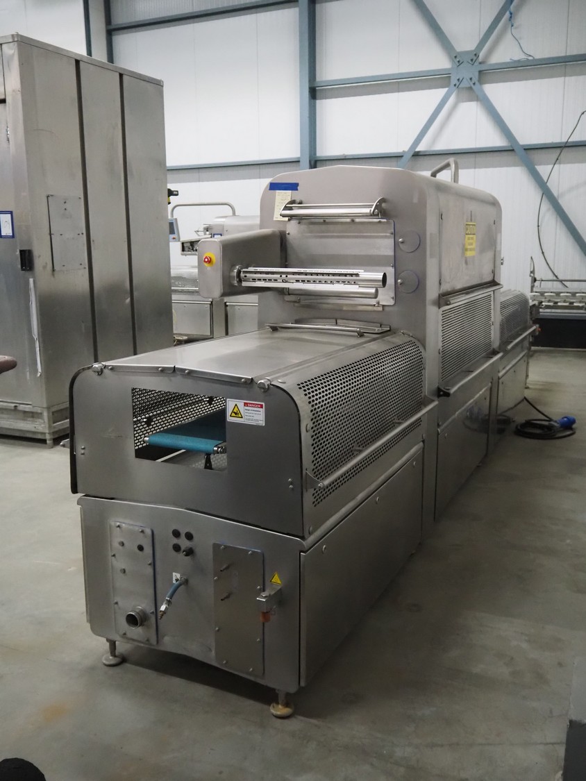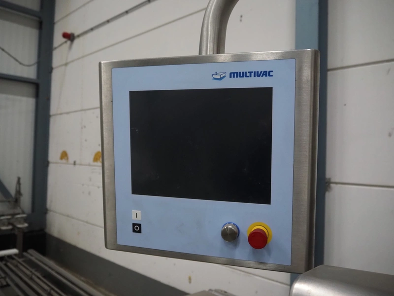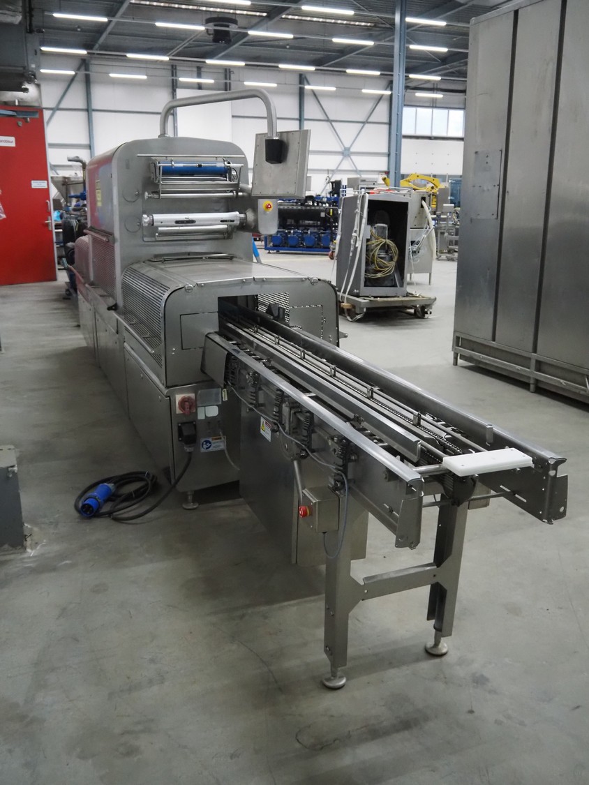 Multivac traysealer, model: T 800, plastic mesh belt, belt width: 250 mm, clearance: 350 mm x 170 mm, film width: 520 mm, infeed belt, belt with dividers, belt width: 205 mm, dividers height: 35 mm, distance between dividers: 290 mm, total dimensions: 6450 mm x 1050 mm x 2060 mm.
