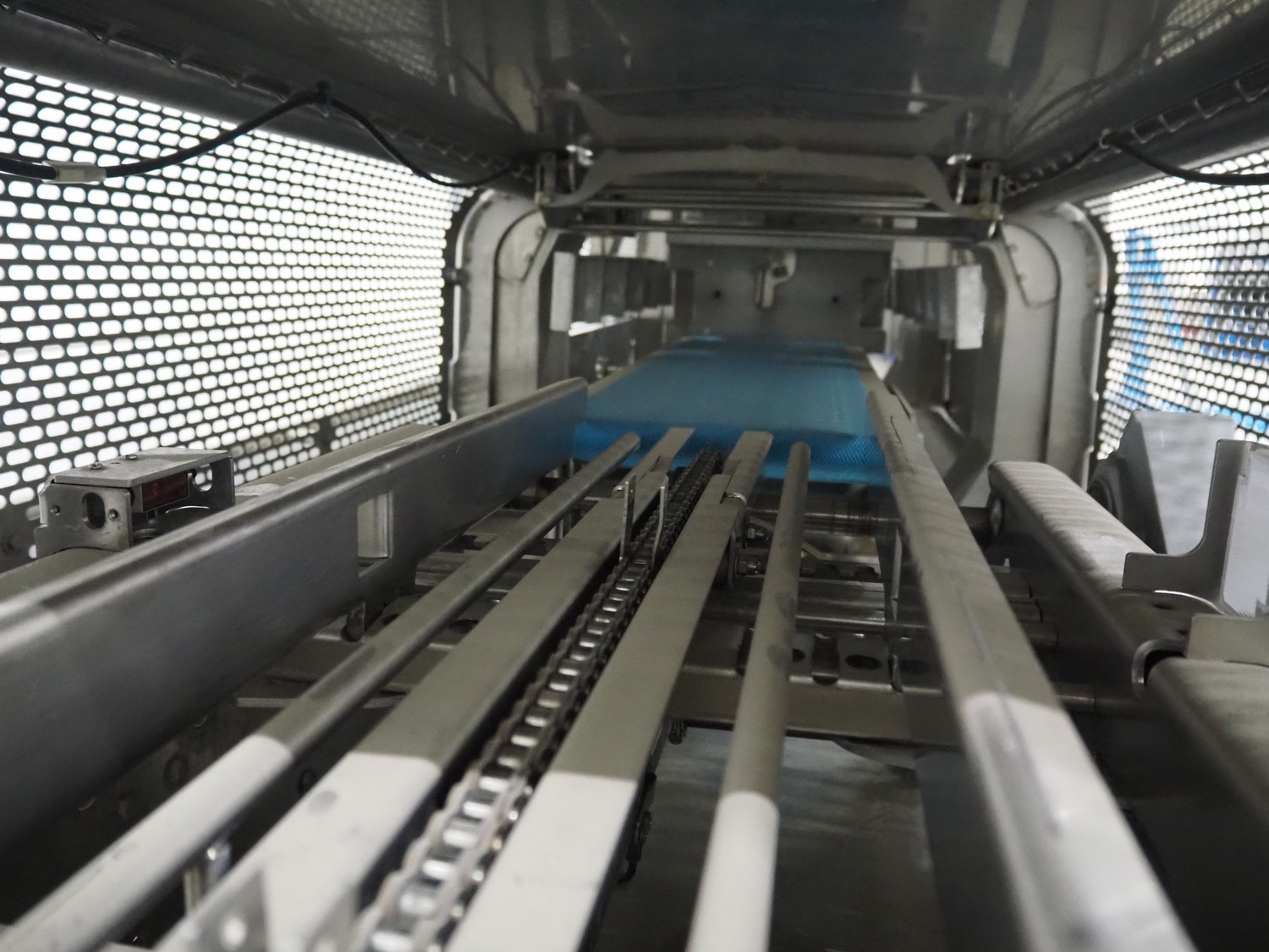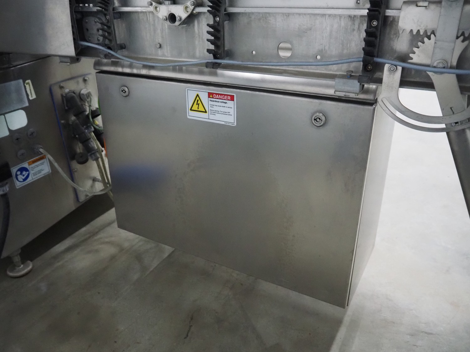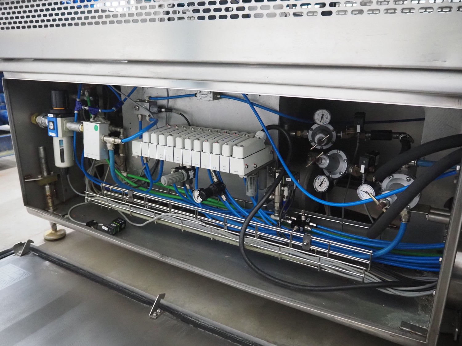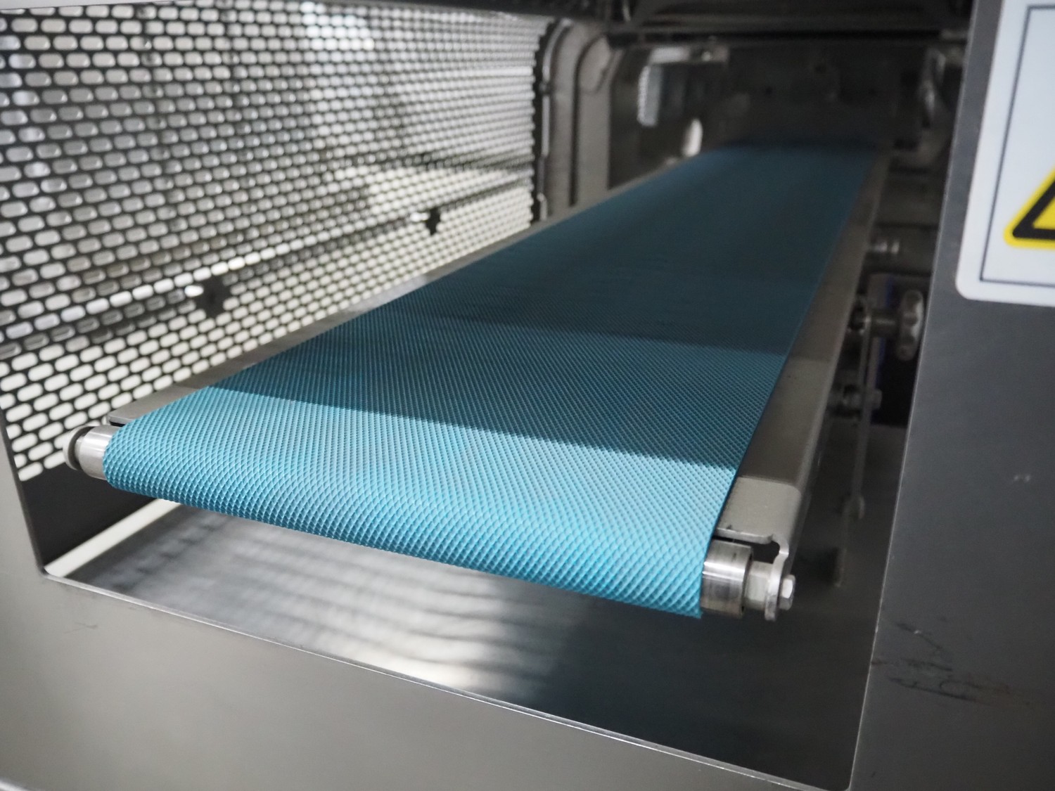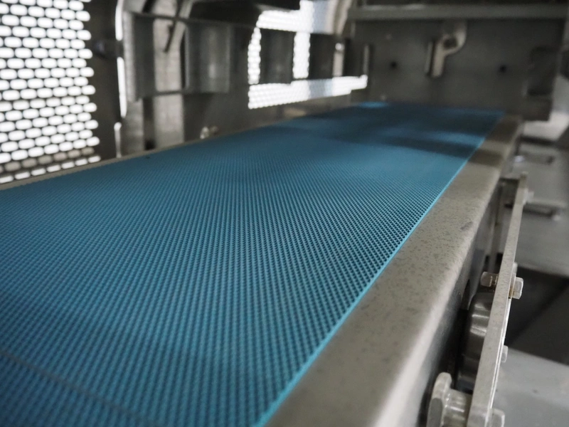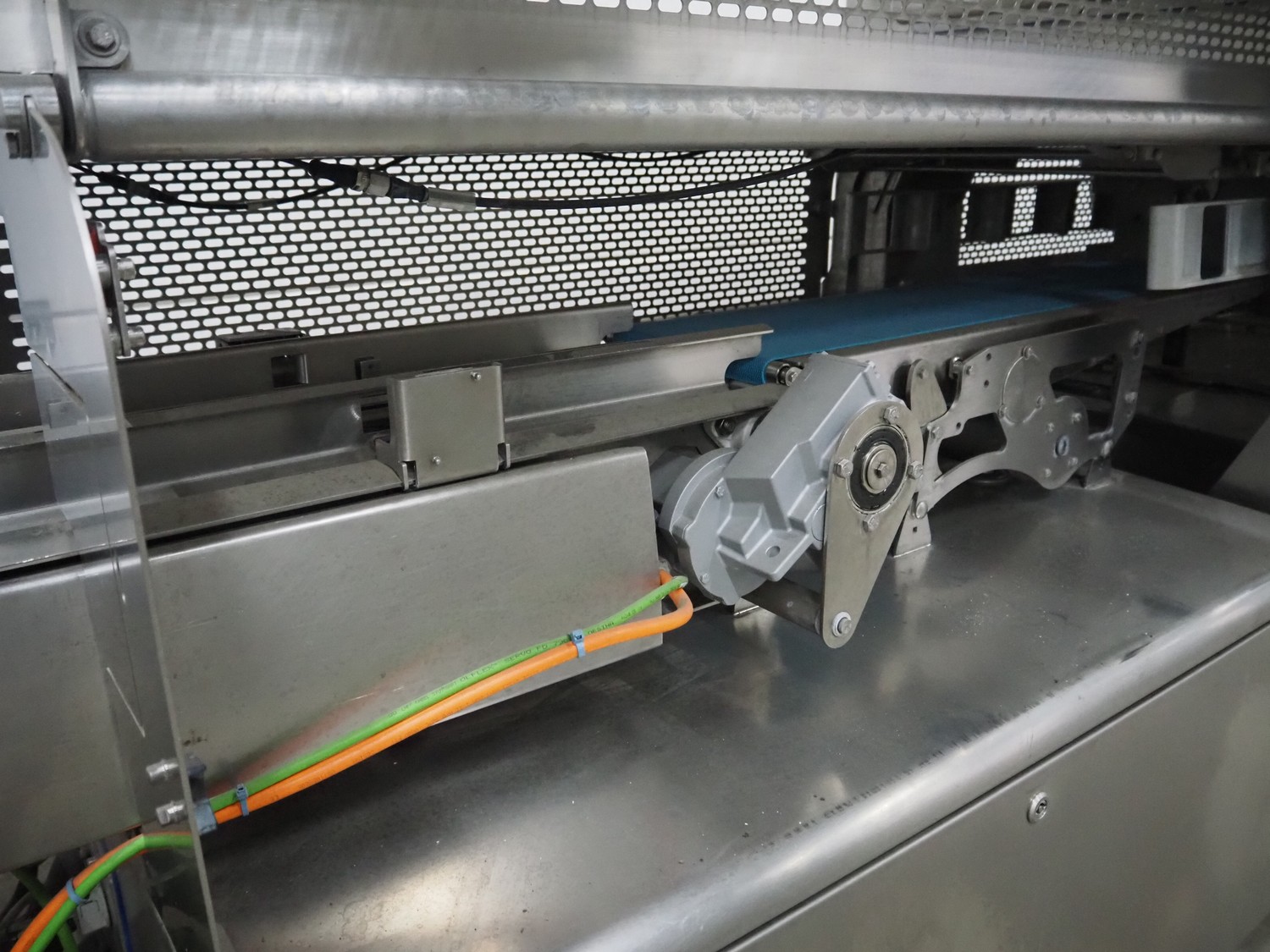 Multivac traysealer, model: T 800, plastic mesh belt, belt width: 250 mm, clearance: 350 mm x 170 mm, film width: 520 mm, infeed belt, belt with dividers, belt width: 205 mm, dividers height: 35 mm, distance between dividers: 290 mm, total dimensions: 6450 mm x 1050 mm x 2060 mm.