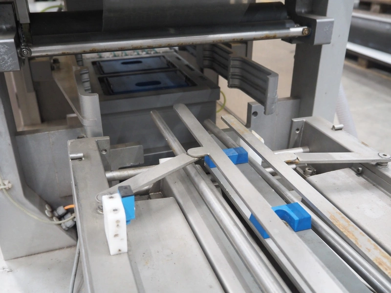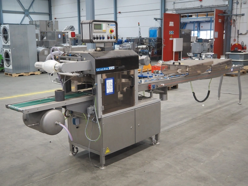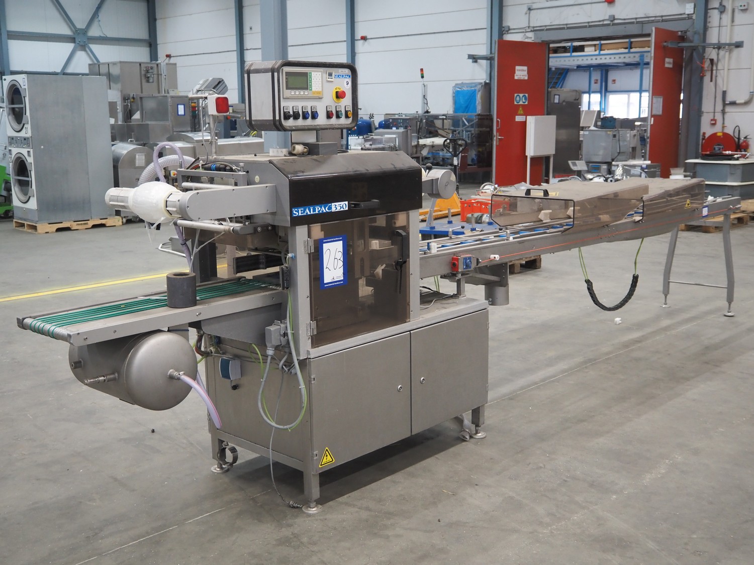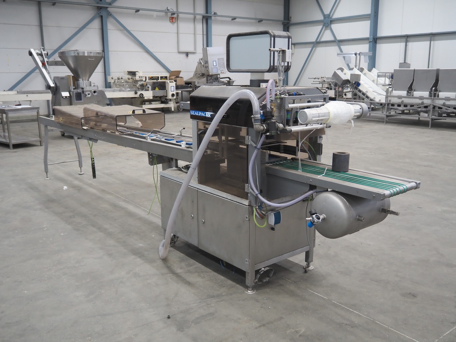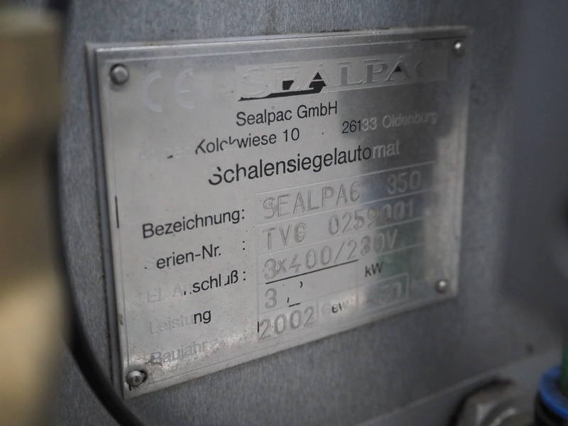 Sealpac traysealer, type: SEALPAC 350, serial number: TVG 0259001, year of construction: 2002, 400/230 V, 3 Ph, 50 Hz, 3 kW, dye: (2x) 145 mm x 210 mm, film width: 230 mm, total dimensions: 4550 mm x 700 mm x 1750 mm.