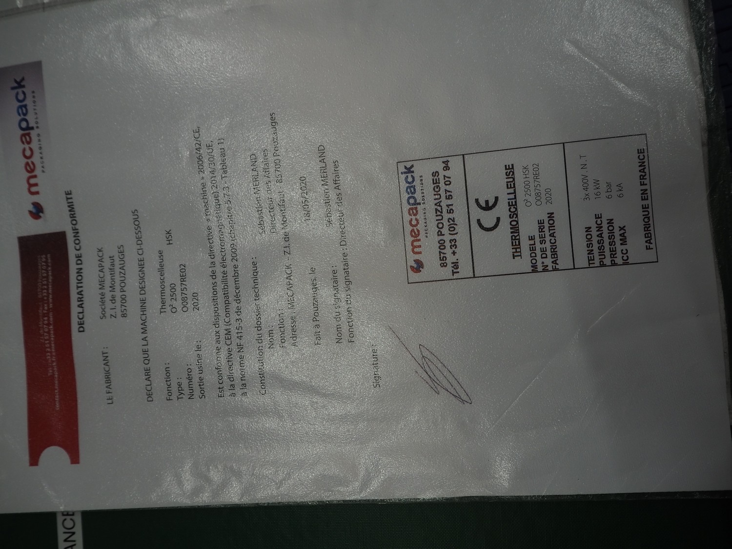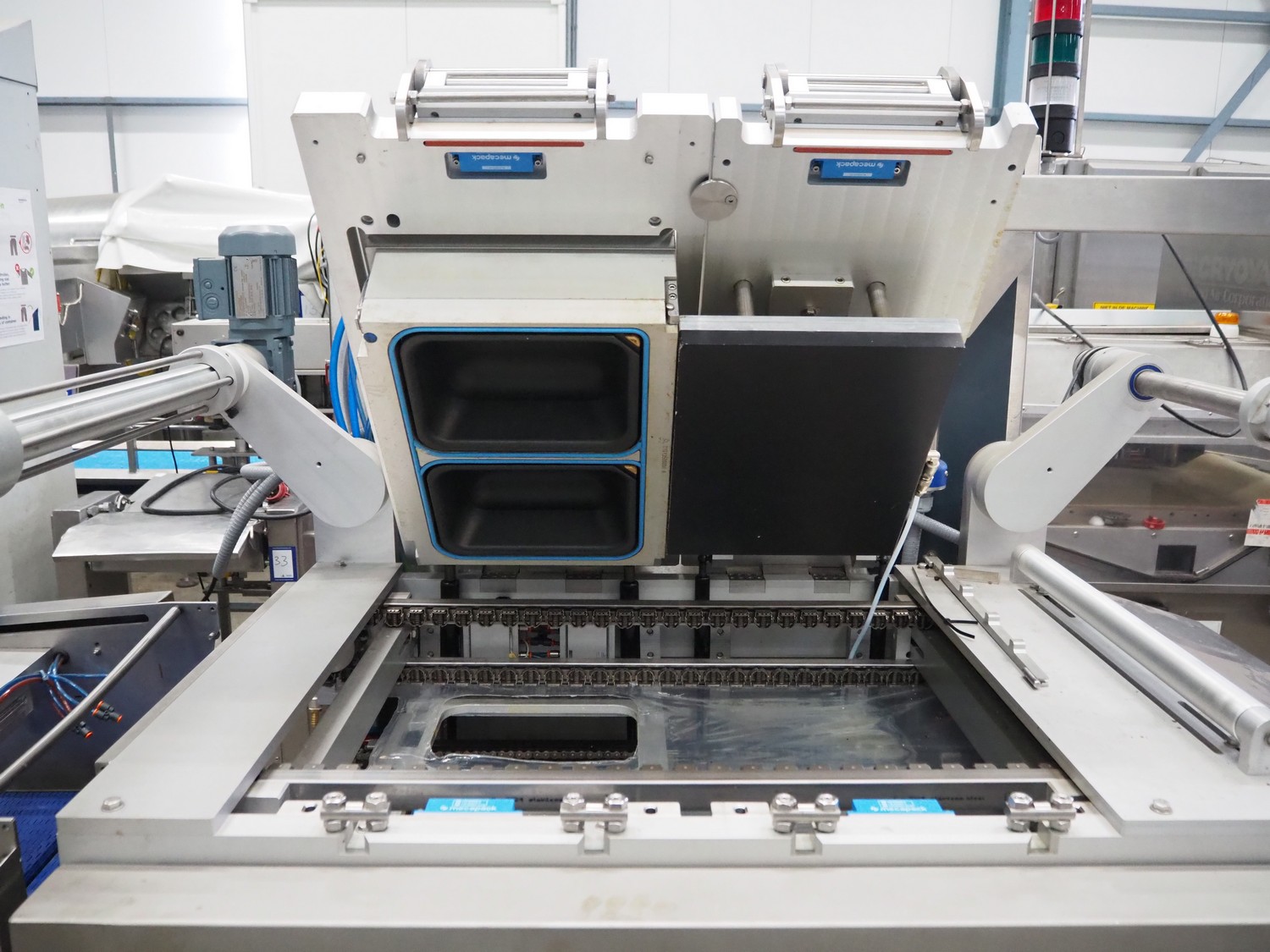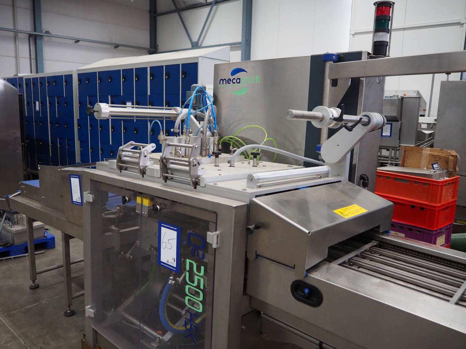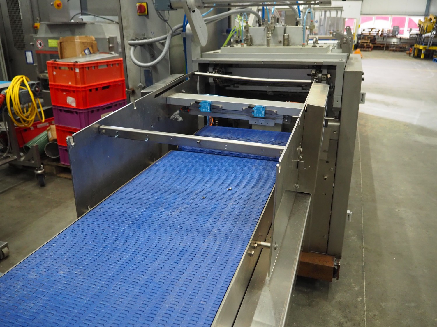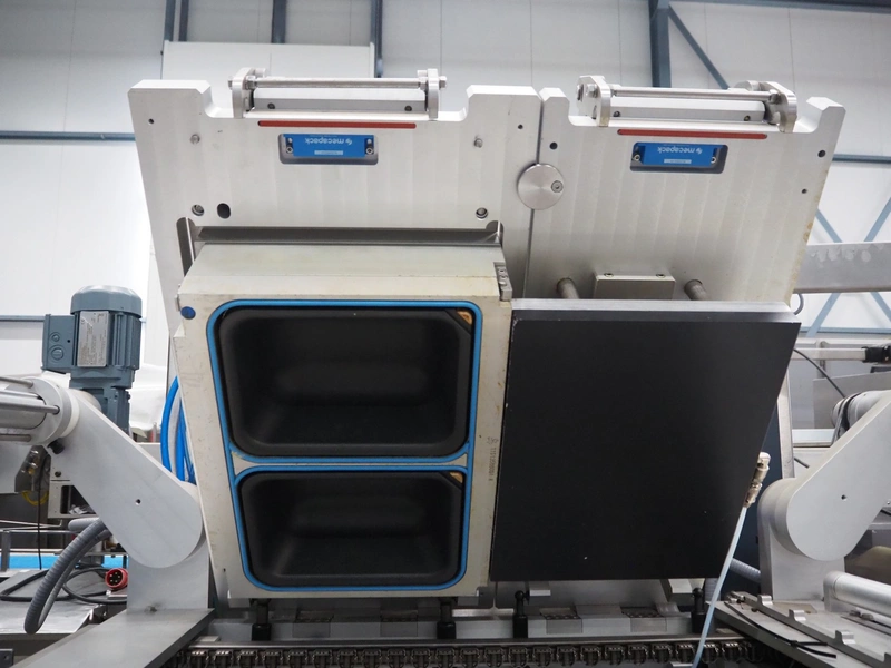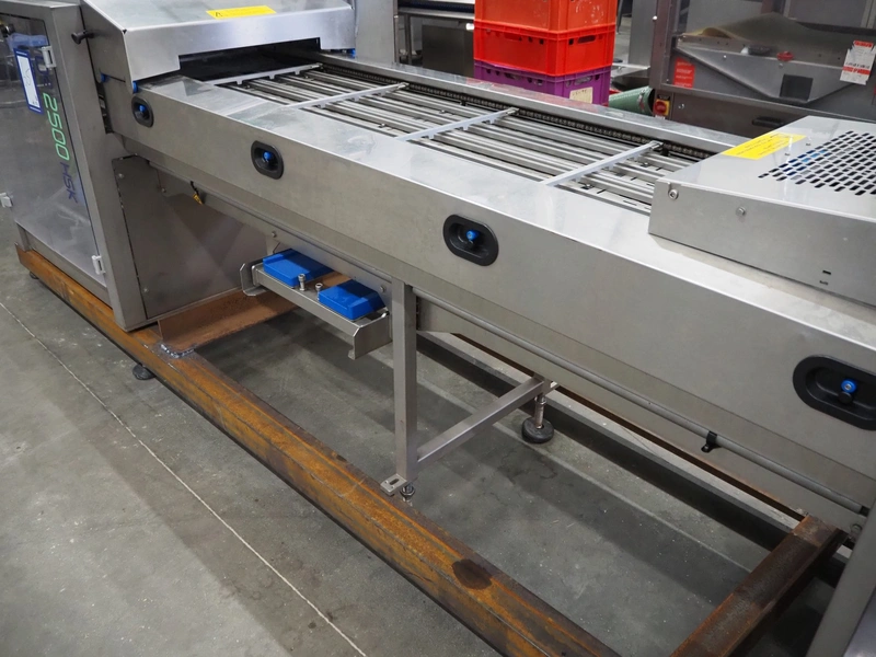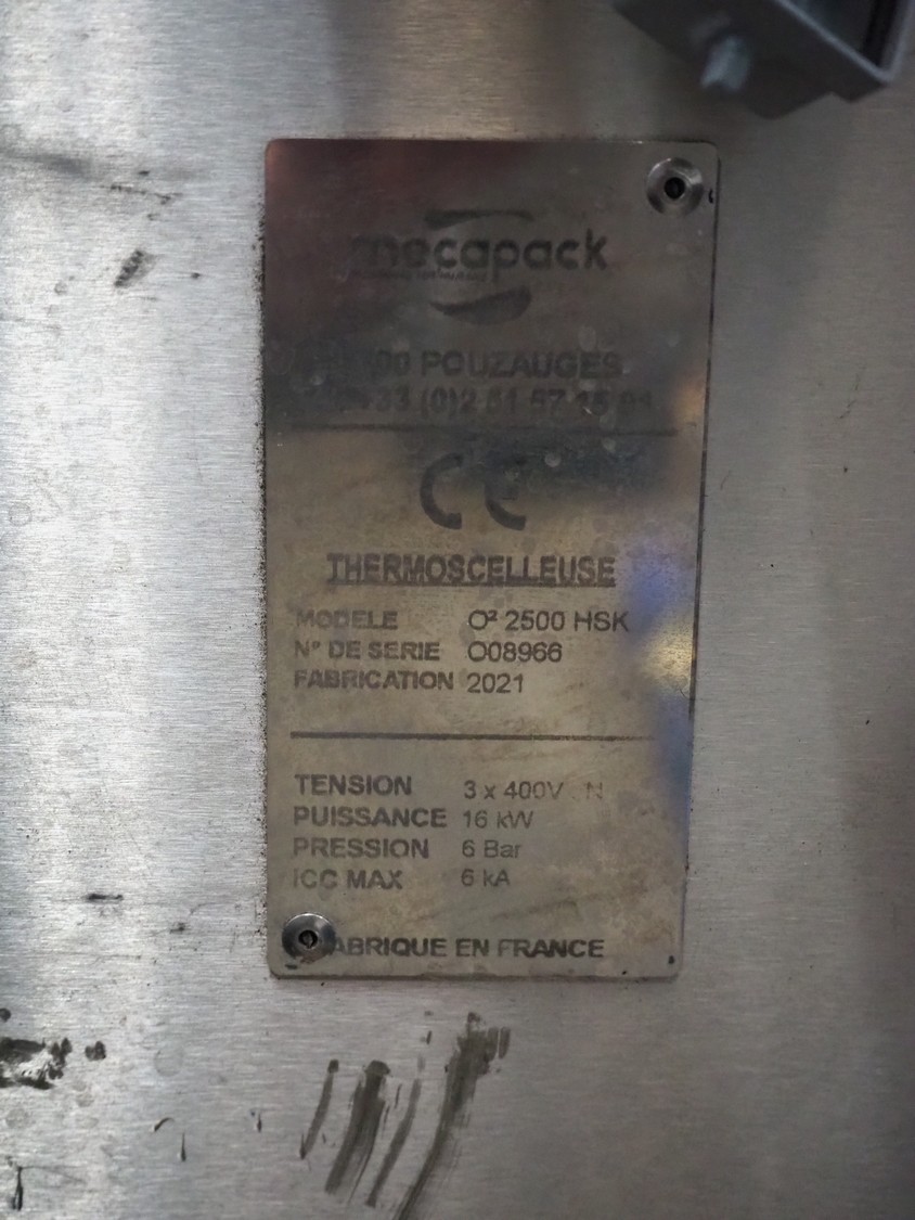 MECAPACK traysealer, type: Q² 2500 HSK, serial number: O08966, year of construction: 2021, 400 V, 3 Ph, 6 A, 16 kW, dye: 225 mm x 200 mm, film width: 460 mm, total dimensions: 4400 mm x 1300 mm x 2100 mm. Including outfeed belt, plastic belt, belt width: 460 mm, total dimensions: 1550 mm x 740 mm x 1180 mm and pallet with parts.