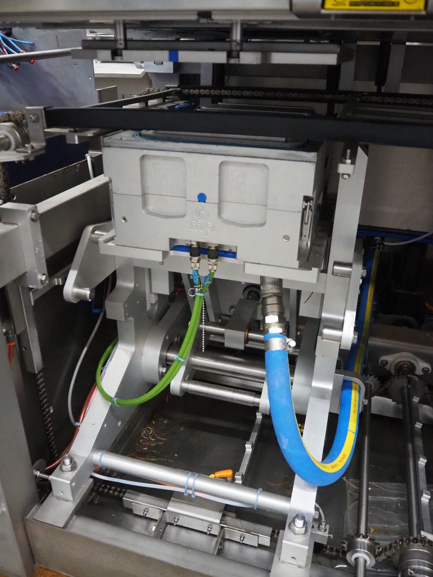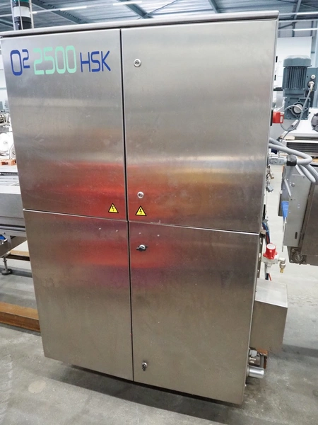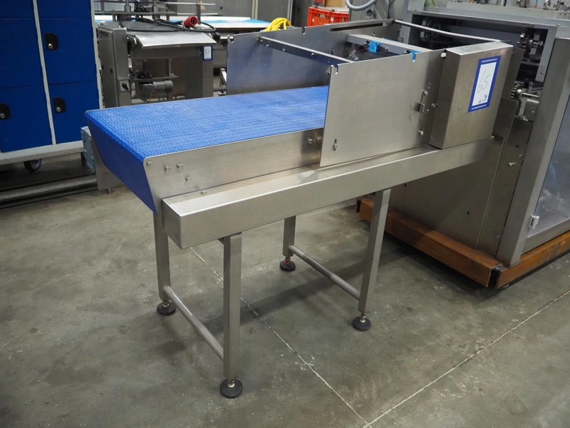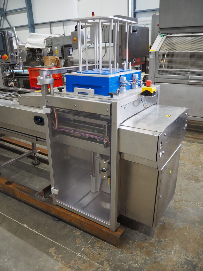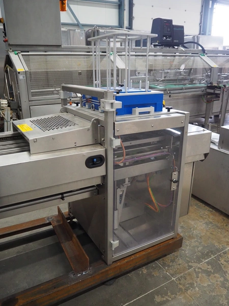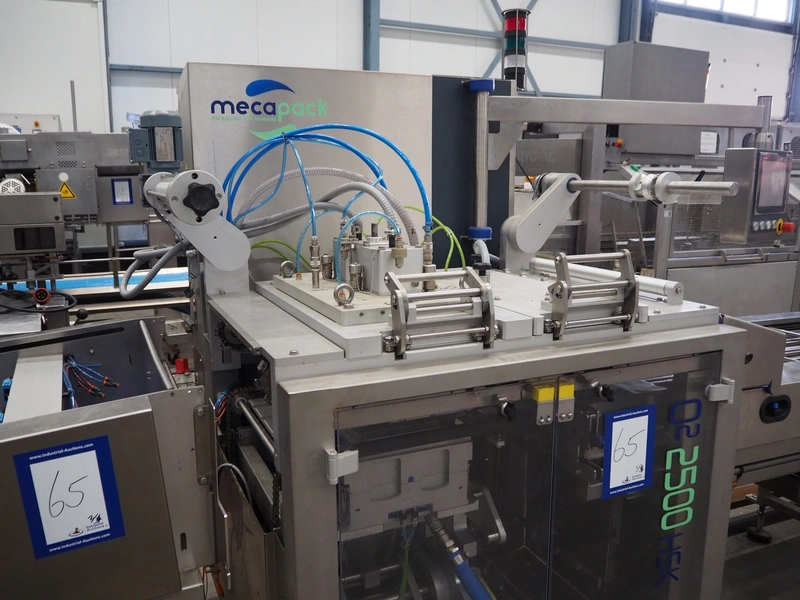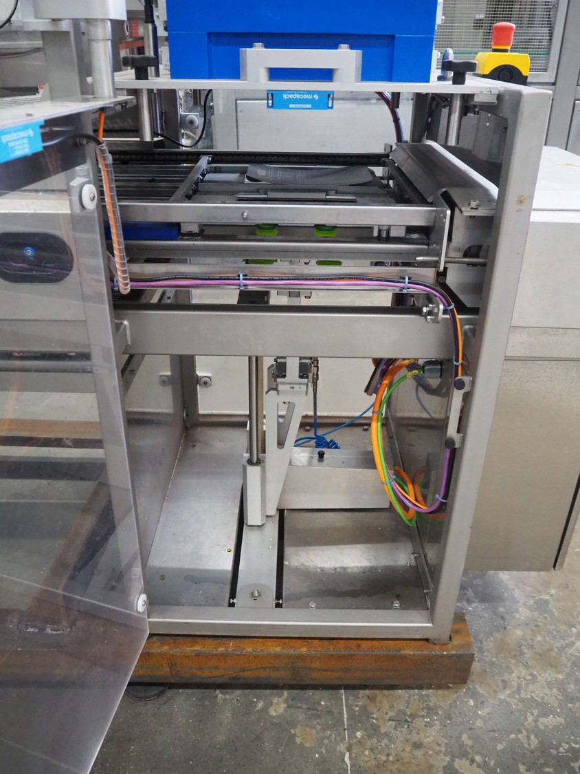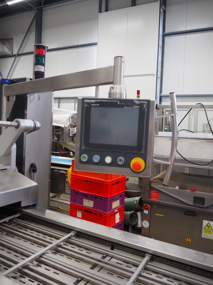 MECAPACK traysealer, type: Q² 2500 HSK, serial number: O08966, year of construction: 2021, 400 V, 3 Ph, 6 A, 16 kW, dye: 225 mm x 200 mm, film width: 460 mm, total dimensions: 4400 mm x 1300 mm x 2100 mm. Including outfeed belt, plastic belt, belt width: 460 mm, total dimensions: 1550 mm x 740 mm x 1180 mm and pallet with parts.