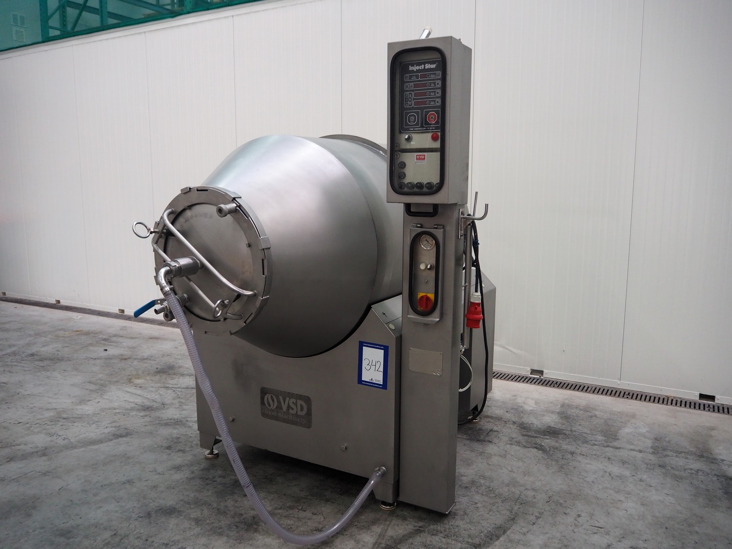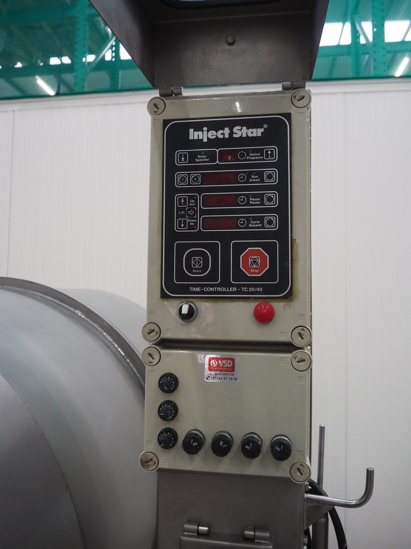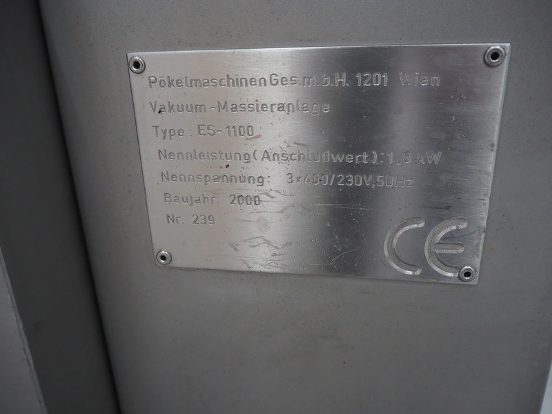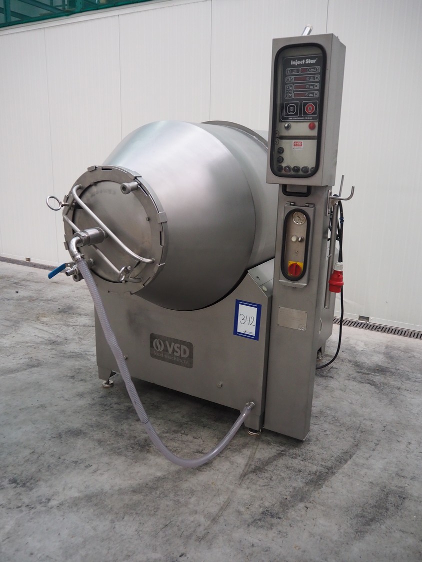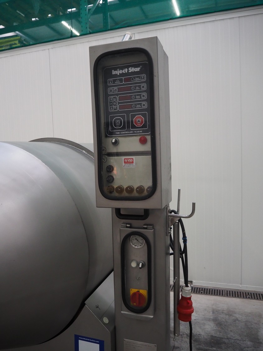 Inject Star / Pökelmaschinen Ges.m.b.H. vacuum tumbler, type: ES-1100, number: 239, year of construction: 2000, 400 V, 3 Ph, 50 Hz, 1.8 kW, dimensions: 2150 mm x 1550 mm x 2000 mm.
